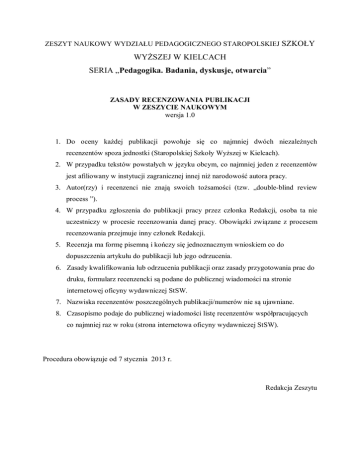 ZESZYT NAUKOWY WYDZIAŁU PEDAGOGICZNEGO STAROPOLSKIEJ SZKOŁY WYŻSZEJ W KIELCACH SERIA „Pedagogika. Badania, dyskusje, otwarcia” ZASADY RECENZOWANIA PUBLIKACJI W ZESZYCIE NAUKOWYM wersja 1.0 1. Do oceny każdej publikacji powołuje się co najmniej dwóch niezależnych recenzentów spoza jednostki (Staropolskiej Szkoły Wyższej w Kielcach). 2. W przypadku tekstów powstałych w języku obcym, co najmniej jeden z recenzentów jest afiliowany w instytucji zagranicznej innej niż narodowość autora pracy. 3. Autor(rzy) i recenzenci nie znają swoich tożsamości (tzw. „double-blind review process ”). 4. W przypadku zgłoszenia do publikacji pracy przez członka Redakcji, osoba ta nie uczestniczy w procesie recenzowania danej pracy. Obowiązki związane z procesem recenzowania przejmuje inny członek Redakcji. 5. Recenzja ma formę pisemną i kończy się jednoznacznym wnioskiem co do dopuszczenia artykułu do publikacji lub jego odrzucenia. 6. Zasady kwalifikowania lub odrzucenia publikacji oraz zasady przygotowania prac do druku, formularz recenzencki są podane do publicznej wiadomości na stronie internetowej oficyny wydawniczej StSW. 7. Nazwiska recenzentów poszczególnych publikacji/numerów nie są ujawniane. 8. Czasopismo podaje do publicznej wiadomości listę recenzentów współpracujących co najmniej raz w roku (strona internetowa oficyny wydawniczej StSW). Procedura obowiązuje od 7 stycznia 2013 r. Redakcja Zeszytu