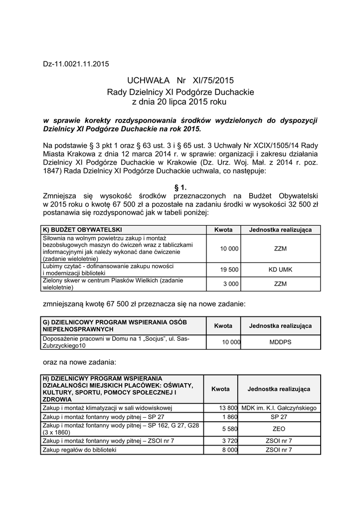Dz-11.0021.11.2015 UCHWAŁA Nr XI/75/2015 Rady Dzielnicy XI Podgórze Duchackie z dnia 20 lipca 2015 roku w sprawie korekty rozdysponowania środków wydzielonych do dyspozycji Dzielnicy XI Podgórze Duchackie na rok 2015. Na podstawie § 3 pkt 1 oraz § 63 ust. 3 i § 65 ust. 3 Uchwały Nr XCIX/1505/14 Rady Miasta Krakowa z dnia 12 marca 2014 r. w sprawie: organizacji i zakresu działania Dzielnicy XI Podgórze Duchackie w Krakowie (Dz. Urz. Woj. Mał. z 2014 r. poz. 1847) Rada Dzielnicy XI Podgórze Duchackie uchwala, co następuje: § 1. Zmniejsza się wysokość środków przeznaczonych na Budżet Obywatelski w 2015 roku o kwotę 67 500 zł a pozostałe na zadaniu środki w wysokości 32 500 zł postanawia się rozdysponować jak w tabeli poniżej: K) BUDŻET OBYWATELSKI Siłownia na wolnym powietrzu zakup i montaż bezobsługowych maszyn do ćwiczeń wraz z tabliczkami informacyjnymi jak należy wykonać dane ćwiczenie (zadanie wieloletnie) Lubimy czytać - dofinansowanie zakupu nowości i modernizacji biblioteki Zielony skwer w centrum Piasków Wielkich (zadanie wieloletnie) Kwota Jednostka realizująca 10 000 ZZM 19 500 KD UMK 3 000 ZZM zmniejszaną kwotę 67 500 zł przeznacza się na nowe zadanie: G) DZIELNICOWY PROGRAM WSPIERANIA OSÓB NIEPEŁNOSPRAWNYCH Doposażenie pracowni w Domu na 1 „Socjus”, ul. SasZubrzyckiego10 Kwota 10 000 Jednostka realizująca MDDPS oraz na nowe zadania: H) DZIELNICWY PROGRAM WSPIERANIA DZIAŁALNOŚCI MIEJSKICH PLACÓWEK: OŚWIATY, KULTURY, SPORTU, POMOCY SPOŁECZNEJ I ZDROWIA Zakup i montaż klimatyzacji w sali widowiskowej Zakup i montaż fontanny wody pitnej – SP 27 Zakup i montaż fontanny wody pitnej – SP 162, G 27, G28 (3 x 1860) Zakup i montaż fontanny wody pitnej – ZSOI nr 7 Zakup regałów do biblioteki Kwota Jednostka realizująca 13 800 MDK im. K.I. Gałczyńskiego 1 860 SP 27 5 580 ZEO 3 720 8 000 ZSOI nr 7 ZSOI nr 7 oraz na nowe zadanie: J) KOMUNIKACJA Z MIESZKAŃCAMI DZIELNICY Spacerownik po Dzielnicy XI Kwota Jednostka realizująca 10 000 MDK im. K.I. Gałczyńskiego oraz na istniejące zadanie przyjęte Uchwałą Nr V/42/2015 z dnia 26 lutego 2015 roku (z późn.zm.) jak poniżej: E) LOKALNE WYDARZENIA: OŚWIATOWE, KULTURALNE, SPORTOWE I REKREACYJNE Dofinansowanie Festynu Jesień Kurdwanów – Gimnazjum nr 28 Kwota 7 040 Jednostka realizująca ZEO oraz na istniejące zadania przyjęte Uchwałą Nr V/42/2015 z dnia 26 lutego 2015 roku jak poniżej: H) DZIELNICWY PROGRAM WSPIERANIA DZIAŁALNOŚCI MIEJSKICH PLACÓWEK: OŚWIATY, KULTURY, SPORTU, POMOCY SPOŁECZNEJ I ZDROWIA Zakup nowości dla bibliotek szkolnych: SP 27 Zakup nowości dla bibliotek szkolnych: SP 55 Zakup nowości dla bibliotek szkolnych: SP 162, G 27, G 28 Zakup nowości dla bibliotek szkolnych: ZSOI nr 7 Kwota 1 250 1 250 3 750 1 250 Jednostka realizująca SP 27 SP 55 ZEO ZSOI 7 § 2. Rozszerza się zakres rzeczowy zadania przyjętego Uchwałą Nr V/42/2015 z dnia 26 lutego 2015 roku w następujący sposób: z: A) PRACE REMONTOWE SZKÓŁ PODSTAWOWYCH, GIMNAZJÓW, PRZEDSZKOLI ORAZ ŻŁOBKÓW Gimnazjum nr 27 a) kontynuacja wymiany stolarki okiennej b) likwidacja zapadnięcia w przyłączu kanalizacyjnym zewn. Kwota 58 800 Jednostka realizująca ZEO na: A) PRACE REMONTOWE SZKÓŁ PODSTAWOWYCH, GIMNAZJÓW, PRZEDSZKOLI ORAZ ŻŁOBKÓW Gimnazjum nr 27 a) kontynuacja wymiany stolarki okiennej b) likwidacja zapadnięcia w przyłączu kanalizacyjnym zewn. c) remont toalet na parterze d) drobne prace remontowe Kwota 58 800 Jednostka realizująca ZEO § 3. Przenosi się środki z zadania przyjętego Uchwałą Nr VIII/56/2015 z dnia 27 kwietnia 2015 roku w następujący sposób: z zadania: L) OBSŁUGA ADMINISTRACYJNO BIUROWA RADY I ZARZĄDU Sprzątanie pomieszczeń biura dzielnicy Kwota Jednostka realizująca 1 800 OU na zadanie: J) KOMUNIKACJA Z MIESZKAŃCAMI DZIELNICY Obsługa tablic informacyjnych Kwota 1 800 Jednostka realizująca BR UMK § 4. Zmienia się zakres rzeczowy zadania przyjętego Uchwałą Nr VIII/56/2015 z dnia 27 kwietnia 2015 roku w następujący sposób: z: A) PRACE REMONTOWE SZKÓŁ PODSTAWOWYCH, GIMNAZJÓW, PRZEDSZKOLI ORAZ ŻŁOBKÓW Żłobek nr 31 a) malowanie pomieszczeń bawialni i sypialni gr II, III i IV Kwota 20 000 Jednostka realizująca Żłobek nr 31 na: A) PRACE REMONTOWE SZKÓŁ PODSTAWOWYCH, GIMNAZJÓW, PRZEDSZKOLI ORAZ ŻŁOBKÓW Żłobek nr 31 a) remont pomieszczeń grupy IV Kwota 20 000 Jednostka realizująca Żłobek nr 31 § 5. Uchwała wchodzi w życie z dniem podjęcia. Przewodniczący Rady i Zarządu Dzielnicy XI Podgórze Duchackie Krzysztof Sułowski