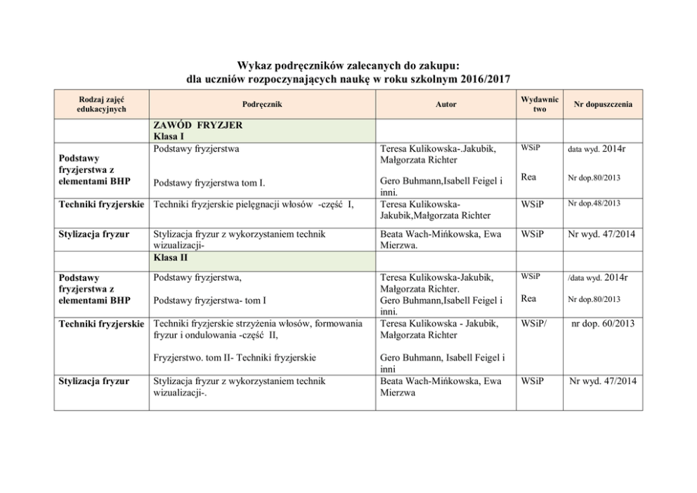 Wykaz podręczników zalecanych do zakupu: dla uczniów rozpoczynających naukę w roku szkolnym 2016/2017 Rodzaj zajęć edukacyjnych Podręcznik ZAWÓD FRYZJER Klasa I Podstawy fryzjerstwa Podstawy fryzjerstwa z elementami BHP Podstawy fryzjerstwa tom I. Techniki fryzjerskie Techniki fryzjerskie pielęgnacji włosów -część I, Autor Wydawnic two Nr dopuszczenia Teresa Kulikowska-.Jakubik, Małgorzata Richter WSiP data wyd. 2014r Gero Buhmann,Isabell Feigel i inni. Teresa KulikowskaJakubik,Małgorzata Richter Rea Nr dop.80/2013 WSiP Nr dop.48/2013 Stylizacja fryzur Stylizacja fryzur z wykorzystaniem technik wizualizacjiKlasa II Beata Wach-Mińkowska, Ewa Mierzwa. WSiP Nr wyd. 47/2014 Podstawy fryzjerstwa z elementami BHP Podstawy fryzjerstwa, Teresa Kulikowska-Jakubik, Małgorzata Richter. Gero Buhmann,Isabell Feigel i inni. Teresa Kulikowska - Jakubik, Małgorzata Richter WSiP /data wyd. 2014r Rea Nr dop.80/2013 Podstawy fryzjerstwa- tom I Techniki fryzjerskie Techniki fryzjerskie strzyżenia włosów, formowania fryzur i ondulowania -część II, Fryzjerstwo. tom II- Techniki fryzjerskie Stylizacja fryzur Stylizacja fryzur z wykorzystaniem technik wizualizacji-. Gero Buhmann, Isabell Feigel i inni Beata Wach-Mińkowska, Ewa Mierzwa WSiP/ nr dop. 60/2013 WSiP Nr wyd. 47/2014 Klasa III Techniki fryzjerskie Techniki fryzjerskie - zmiany koloru włosów -część III,. Stylizacja fryzur Stylizacja fryzur z wykorzystaniem technik wizualizacji-. Rodzaj zajęć edukacyjnych Teresa KulikowskaJakubik,Małgorzata Richter WSiP 2013 Beata Wach-Mińkowska, Ewa Mierzwa WSiP Nr wyd. 47/2014 Podręcznik Wydawnictwo Nr dopuszczenia PRZEDMIOTY OGÓLNOKSZTAŁCĄCE Język polski Elżbieta Nowosielska, Urszula Szydłowska "Zrozumieć świat" (klasa I, II, III) Nowa Era Nr dopuszczenia 584/1/2012 Historia Podręcznik Historia Wydawnictwo Operon Seria Odkrywamy na nowo zakres podstawowy cz.1 ( dla klas I ) Bogumiła Burda, Bohdan Halczak, Roman Maciej Józefiak, Anna Roszak, Małgorzata Szymczak Wydawnictwo Operon MEN 456/2012 Wydawnictwo Operon MEN 469/2012 Podręcznik Historia Wydawnictwo Operon Seria Odkrywamy na nowo, zakres podstawowy cz.2 ( dla klas II ) Bogumiła Burda, Bohdan Halczak, Roman Maciej Józefiak, Anna Roszak, Małgorzata Szymczak Wiedza o społeczeństwie Wiedza o społeczeństwie ( dla klas III) Seria Ciekawi Świata zakres podstawowy Maciej Batorski Rodzaj zajęć edukacyjnych Podręcznik Autor Wydawnictwo Nr dopuszczenia ZAWÓD KUCHARZ Kształcenie zawodowe: Kucharz T.6 Klasa I, II, III Technologia gastronomiczna z towaroznawstwem. Podręcznik część 1 Kwalifikacja T.6 Technologia gastronomiczna z towaroznawstwem. Podręcznik część 2 Kwalifikacja T.6 Sporządzanie i ekspedycja potraw i napojów część 3 Wyposażenie zakładów gastronomicznych Rodzaj zajęć edukacyjnych Podręcznik Małgorzata Konarzewska WSiP 69/2013 Małgorzata Konarzewska WSiP Rok dopuszczenia 2015 WSiP Rok dopuszczenia 2013 Marzanna Zienkiewicz Autor Wydawnictwo Nr dopuszczenia ZAWÓD CUKIERNIK Klasa I, II, III Kształcenie zawodowe: - cukiernik T.4 Technologie produkcji cukierniczej , Podręcznik Wyroby cukiernicze Tom I i II Kwalifikacja T.4, Magdalena Kaźmierczak WSiP Rok dopuszczenia 2013