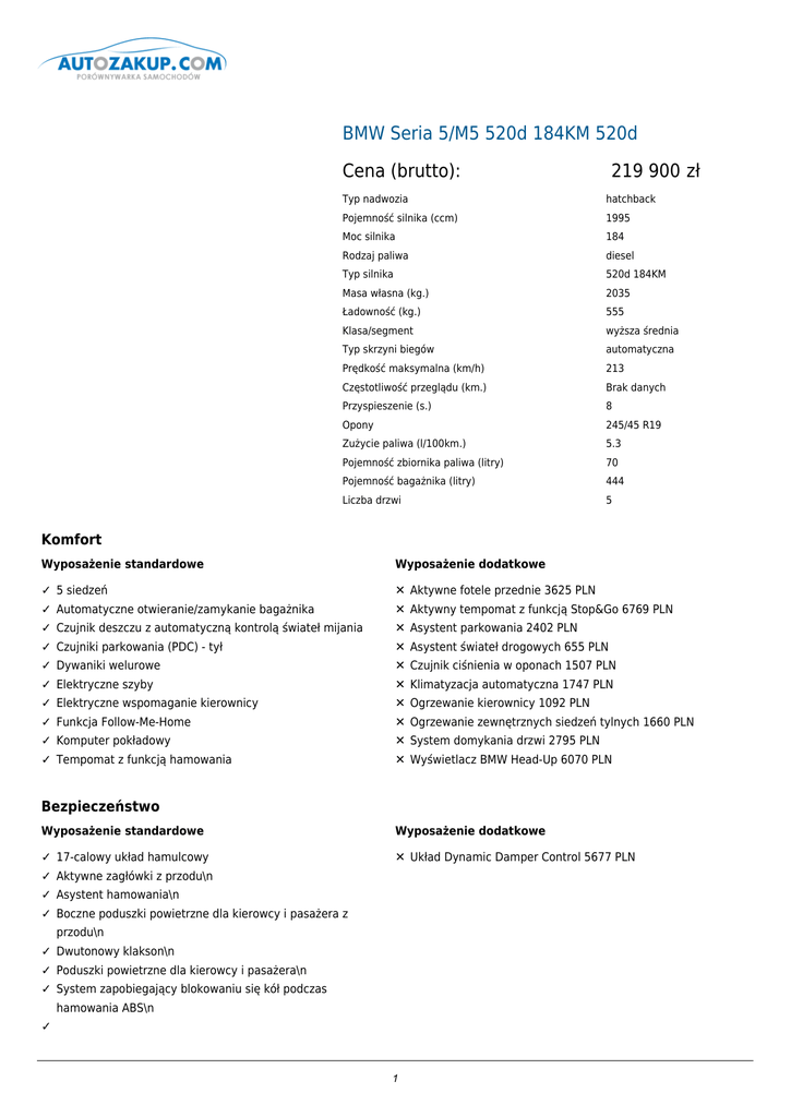 BMW Seria 5/M5 520d 184KM 520d Cena (brutto): 219 900 zł Typ nadwozia hatchback Pojemność silnika (ccm) 1995 Moc silnika 184 Rodzaj paliwa diesel Typ silnika 520d 184KM Masa własna (kg.) 2035 Ładowność (kg.) 555 Klasa/segment wyższa średnia Typ skrzyni biegów automatyczna Prędkość maksymalna (km/h) 213 Częstotliwość przeglądu (km.) Brak danych Przyspieszenie (s.) 8 Opony 245/45 R19 Zużycie paliwa (l/100km.) 5.3 Pojemność zbiornika paliwa (litry) 70 Pojemność bagażnika (litry) 444 Liczba drzwi 5 Komfort Wyposażenie standardowe Wyposażenie dodatkowe ✓ 5 siedzeń ✕ Aktywne fotele przednie 3625 PLN ✓ Automatyczne otwieranie/zamykanie bagażnika ✕ Aktywny tempomat z funkcją Stop&Go 6769 PLN ✓ Czujnik deszczu z automatyczną kontrolą świateł mijania ✕ Asystent parkowania 2402 PLN ✓ Czujniki parkowania (PDC) - tył ✕ Asystent świateł drogowych 655 PLN ✓ Dywaniki welurowe ✕ Czujnik ciśnienia w oponach 1507 PLN ✓ Elektryczne szyby ✕ Klimatyzacja automatyczna 1747 PLN ✓ Elektryczne wspomaganie kierownicy ✕ Ogrzewanie kierownicy 1092 PLN ✓ Funkcja Follow-Me-Home ✕ Ogrzewanie zewnętrznych siedzeń tylnych 1660 PLN ✓ Komputer pokładowy ✕ System domykania drzwi 2795 PLN ✓ Tempomat z funkcją hamowania ✕ Wyświetlacz BMW Head-Up 6070 PLN Bezpieczeństwo Wyposażenie standardowe Wyposażenie dodatkowe ✓ 17-calowy układ hamulcowy ✕ Układ Dynamic Damper Control 5677 PLN ✓ Aktywne zagłówki z przodu\n ✓ Asystent hamowania\n ✓ Boczne poduszki powietrzne dla kierowcy i pasażera z przodu\n ✓ Dwutonowy klakson\n ✓ Poduszki powietrzne dla kierowcy i pasażera\n ✓ System zapobiegający blokowaniu się kół podczas hamowania ABS\n ✓ 1 Trójkąt ostrzegawczy i apteczka\n 2 ✓ Tryb dynamicznej kontroli trakcji (DTC)\n ✓ Wentylowane tarcze hamulcowe z przodu\n Dodatki Wyposażenie standardowe Wyposażenie dodatkowe ✓ 8-biegowa automatyczna skrzynia biegów, Steptronic ✕ Aktywna wentylacja foteli przednich 3537 PLN ✓ Aluminiowa zespolona oś tylna ✕ Aktywna wentylacja foteli tylnych 3275 PLN ✓ Atrapa chłodnicy z chromowanym obramowaniem ✕ Aktywny układ kierowniczy, zintegrowany ze skrętną osią tylną 7643 PLN ✓ Automatyczne oświetlenie wnętrza, płynne włączanie i ✕ Aplikacje ceramiczne na elementach obsługi 2402 PLN wyłączanie ✓ Bezramowe drzwi z przodu i z tyłu ✕ APPS 655 PLN ✓ Centralny zamek z dwoma pilotami radiowym ✕ BMW Live 437 PLN zintegrowanymi w kluczyku ✓ Chromowane obramowanie okien bocznych ✕ Czujniki parkowania (PDC) z przodu i z tyłu 1485 PLN ✓ Condition Based Service, system monitorujący stan zużycia ✕ Dostęp komfortowy 3843 PLN eksploatacyjnego ✓ Czujnik kolizji ✕ Ekskluzywna skóra Nappa o rozszerzonym zakresie 13233 ✓ Dwuczęściowa klapa bagażnika, otwierana dwoma ✕ Elektryczna regulacja foteli z pamięcią ustawień 4804 PLN PLN oddzielnymi przyciskami na klapiebądź w kluczyku. Mniejsza pokrywa może być otwarta przyciskiem w słupku A ✓ Elektroniczny immobilizer ✕ Funkcja TV DVB-T 9302 PLN ✓ Elementy zewnętrzne w kolorze karoserii ✕ Hak holowniczy 5241 PLN ✓ Filtr cząsteczek stałych ✕ Internet 432 PLN ✓ Gniazdo AUX-IN ✕ Kamera cofania 1834 PLN ✓ Hamulec ręczny z automatyczną funkcją Hold ✕ Kamera Surround View 3232 PLN ✓ Konsola centralna z tyłu ze schowkiem, wentylacją oraz 2 ✕ Klimatyzacja automatyczna, 4-strefowa 3799 PLN gniazdami 12V ✓ Kontroler w konsoli centralnej z 7 przyciskami skrótów menu ✕ Komfortowe fotele przednie, regulowane elektrycznie 9870 (radio, CD, telefon, mapa,menu, opcja, wstecz) PLN ✓ Lakier niemetalizowany ✕ Komfortowe fotele tylne, regulowane elektrycznie 8516 PLN ✓ Lampki do czytania z przodu i z tyłu ✕ Lakier metalizowany 4280 PLN ✓ Listwy ozdobne satynowo srebrne mat ✕ Lampki do czytania dla tylnej kanapy BMW Individual 1747 PLN ✓ Lusterka zewnętrzne, podgrzewane, asferyczne, elektrycznie ✕ Listwy ozdobne drewno szlachetne Fineline naturalne 2577 regulowane i elektrycznie składane PLN ✓ Mocowanie do fotelików dziecięcych ISOFIX ✕ Listwy ozdobne drewno szlachetne jesion słojowany 2577 ✓ Norma emisji spalin Euro 5 ✕ Listwy PLN ozdobne drewno szlachetne jesion słojowany antracytowy 2577 PLN ✓ Obręcze kół ze stopu lekkiego Double Spoke 234, 18 cali ✕ Listwy ozdobne drewno szlachetne jesion słojowanyna wysoki połysk 2577 PLN ✓ Odzysk energii hamowania ✕ Lusterka zewnętrzne i wewnętrzne przyciemniane automatycznie 2402 PLN ✓ Oparcie kanapy tylnej dzielone i składane w stosunku ✕ Lusterko wewnętrzne przyciemniane automatycznie 917 PLN 40:20:40, panel oddzielającyprzestrzeń bagażową dzielony adekwatnie 3 ✓ Opony z funkcją jazdy awaryjnej Runflat z czujnikiem ✕ Obramowania Shadow Line BMW Individual, na wysoki uszkodzenia opony ✓ Oś przednia z podwójnym wahaczem poprzecznym połysk 1135 PLN ✕ Obręcze kół ze stopu lekkiego Double Spoke 253 z ogumieniemmieszanym, 20 cali 12228 PLN ✓ Oświetlenie powitalne ✕ Obręcze kół ze stopu lekkiego Double Spoke 303 Mz ogumieniem mieszanym, 20 cali 5677 PLN ✓ Oznaczenie modelu: emblemat GT z lewej strony klapy ✕ Obręcze kół ze stopu lekkiego Double Spoke 316 z bagażnika, oznaczenie modeluz prawej ✓ Pakiet serwisowy BMW Service Inclusive 5 lat / 100 000 km, ogumieniemmieszanym, 20 cali 14630 PLN ✕ Obręcze kół ze stopu lekkiego Multi Spoke 235 z pokrywa koszty serwisowania oraz robociznę ogumieniemmieszanym, 19 cali 8953 PLN ✓ Poduszki powietrzne chroniące głowę z przodu i z tyłu ✕ Obręcze kół ze stopu lekkiego Star Spoke 272 z ogumieniem ✓ Podłokietnik centralny z tyłu ze schowkiem, składany ✕ Obręcze kół ze stopu lekkiego Turbine Styling 271, 18 cali ✓ Podłokietnik z przodu i z tyłu ✕ Obręcze kół ze stopu lekkiego Y Spoke 315 z ogumieniem ✓ Półka bagażnika z wyjmowaną przednią częścią, chowaną ✕ Ogrzewanie fot