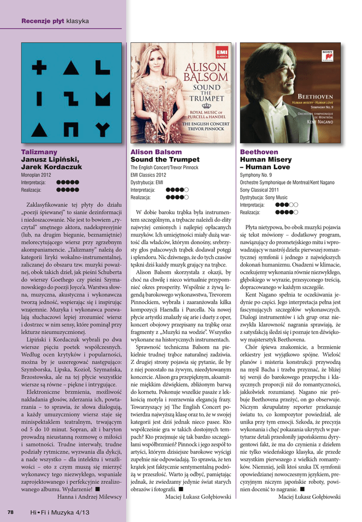 Talizmany §§§§§ §§§§§ Zaklasyfikowanie tej płyty do działu „poezji śpiewanej” to sianie dezinformacji i niedoszacowanie. Nie jest to bowiem „ryczytal” smętnego aktora, nadekspresyjnie (lub, na drugim biegunie, beznamiętnie) melorecytującego wiersz przy zgrzebnym akompaniamencie. „Talizmany” należą do kategorii liryki wokalno-instrumentalnej, zaliczanej do obszaru tzw. muzyki poważnej, obok takich dzieł, jak pieśni Schuberta do wierszy Goethego czy pieśni Szymanowskiego do poezji Joyce’a. Warstwa słowna, muzyczna, akustyczna i wykonawcza tworzą jedność, wspierając się i inspirując wzajemnie. Muzyka i wykonawca pozwalają słuchaczowi lepiej zrozumieć wiersz i dostrzec w nim sensy, które pominął przy lekturze nieumuzycznionej. Lipiński i Kordaczuk wybrali po dwa wiersze pięciu poetek współczesnych. Według ocen krytyków i popularności, można by je uszeregować następująco: Szymborska, Lipska, Kozioł, Szymańska, Brzostowska, ale na tej płycie wszystkie wiersze są równe – piękne i intrygujące. Elektroniczne brzmienia, możliwość nakładania głosów, zderzania ich, powtarzania – to sprawia, że słowa dialogują, a każdy umuzyczniony wiersz staje się minispektaklem teatralnym, trwającym od 5 do 10 minut. Sopran, alt i baryton prowadzą nieustanną rozmowę o miłości i samotności. Trudne interwały, trudne podziały rytmiczne, wyzwania dla dykcji, a nade wszystko – dla intelektu i wrażliwości – oto z czym muszą się mierzyć wykonawcy tego niezwykłego, wspaniale zaprojektowanego i perfekcyjnie zrealizowanego albumu. Wydarzenie! ■ Hanna i Andrzej Milewscy 78 Human Misery §§§§¨ §§§§¨ W dobie baroku trąbka była instrumentem szczególnym, a trębacze należeli do elity najwyżej cenionych i najlepiej opłacanych muzyków. Ich umiejętności miały dużą wartość dla władców, którym donośny, srebrzysty głos pałacowych trąbek dodawał potęgi i splendoru. Nic dziwnego, że do tych czasów tęskni dziś każdy muzyk grający na trąbce. Alison Balsom skorzystała z okazji, by choć na chwilę i nieco wirtualnie przypomnieć okres prosperity. Wspólnie z żywą legendą barokowego wykonawstwa, Trevorem Pinnockiem, wybrała i zaaranżowała kilka kompozycji Haendla i Purcella. Na nowej płycie artystki znalazły się arie i duety z oper, koncert obojowy przepisany na trąbkę oraz fragmenty z „Muzyki na wodzie”. Wszystko wykonane na historycznych instrumentach. Sprawność techniczna Balsom na piekielnie trudnej trąbce naturalnej zadziwia. Z drugiej strony pojawia się pytanie, ile by z niej pozostało na żywym, nieedytowanym koncercie. Alison gra przepięknym, aksamitnie miękkim dźwiękiem, zbliżonym barwą do kornetu. Pokonuje wszelkie pasaże z lekkością motyla i rozrzewnia elegancją frazy. Towarzyszący jej The English Concert potwierdza najwyższą klasę oraz to, że w swojej kategorii jest dziś jednak nieco pasee. Kto współcześnie gra w takich dostojnych tempach? Kto przejmuje się tak bardzo szczegółami współbrzmień? Pinnock i jego zespół to artyści, którym dzisiejsze barokowe wyścigi zupełnie nie odpowiadają. To sprawia, że ten krążek jest faktycznie sentymentalną podróżą w przeszłość. Warto ją odbyć, pamiętając jednak, że zwiedzamy jedynie świat starych obrazów i fotografii. ■ Maciej Łukasz Gołębiowski §§§¨¨ §§§§¨ Płyta nietypowa, bo obok muzyki pojawia się tekst mówiony – dodatkowy program, nawiązujący do prometejskiego mitu i wprowadzający w nastrój dzieła: pierwszej romantycznej symfonii i jednego z największych dokonań humanizmu. Osadzeni w klimacie, oczekujemy wykonania równie niezwykłego, głębokiego w wyrazie, przesyconego treścią, dopracowanego w każdym szczególe. Kent Nagano spełnia te oczekiwania jedynie po części. Jego interpretacja pełna jest fascynujących szczegółów wykonawczych. Dialogi instrumentów i ich grup oraz niezwykła klarowność nagrania sprawiają, że z satysfakcją śledzi się i poznaje ten dźwiękowy majstersztyk Beethovena. Chór śpiewa znakomicie, a brzmienie orkiestry jest wyjątkowo spójne. Wielość planów i misteria konstrukcji przywodzą na myśl Bacha i trzeba przyznać, że bliżej tej wersji do barokowego przepychu i klasycznych proporcji niż do romantyczności, jakkolwiek rozumianej. Nagano nie próbuje Beethovena przeżyć, on go obserwuje. Niczym skrupulatny reporter przekazuje światu to, co kompozytor powiedział, ale unika przy tym emocji. Szkoda, że precyzja wykonania i chęć pokazania ukrytych w partyturze detali przesłoniły japońskiemu dyrygentowi fakt, że ma do czynienia z dziełem nie tylko wiedeńskiego klasyka, ale przede wszystkim pierwszego z wielkich romantyków. Niemniej, jeśli ktoś szuka IX symfonii opowiedzianej nowoczesnym językiem, precyzyjnym niczym japońskie roboty, powinien docenić to nagranie. ■ Maciej Łukasz Gołębiowski