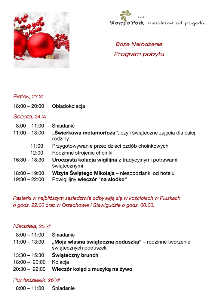 Boże Narodzenie Program pobytu Piątek, 23 XII 18:00 – 20:00 Obiadokolacja Sobota, 24 XII 8:00 – 11:00 11:00 – 13:00 11:00 12:00 16:30 – 18:30 18:00 – 19:00 19:30 – 22:00 Śniadanie „Świerkowa metamorfoza”, czyli świąteczne zajęcia dla całej rodziny Przygotowywanie przez dzieci ozdób choinkowych Rodzinne strojenie choinki Uroczysta kolacja wigilijna z tradycyjnymi potrawami świątecznymi Wizyta Świętego Mikołaja – niespodzianki od hotelu Powigilijny wieczór "na słodko" Pasterki w najbliższym sąsiedztwie odbywają się w kościołach w Pluskach o godz. 22:00 oraz w Orzechowie i Stawigudzie o godz. 00:00. Niedziela, 25 XII 8:00 – 11:00 11:00 – 13:00 13:30 – 15:30 18:00 – 20:00 20:30 – 22:00 Śniadanie „Moja własna świąteczna poduszka” – rodzinne tworzenie świątecznych poduszek Świąteczny brunch Kolacja Wieczór kolęd z muzyką na żywo Poniedziałek, 26 XII 8:00 – 11:00 Śniadanie Za dodatkową opłatą Gościom hotelowym proponujemy rekreację konną korzystanie z basenu solankowego zabiegi w Dolinie Zdrowia zajęcia fitness z instruktorką możliwość wypożyczenia kijków do nordic walking bogatą ofertę zabiegów pielęgnacyjnych i zdrowotnych w SPA seanse Aqua Musicale prezenty w postaci voucherów SPA smakołyki kuchni Fusion oraz kuchni regionalnej w restauracji hotelowej „Pyszności dla aquaparkowych Gości” w aquabarze wieczorne drinki w klubie muzycznym Życzymy miłego świątecznego pobytu! Zapraszamy do korzystania z atrakcji hotelu w następujących godzinach AQUAPARK Aquabar SPA Restauracja Klub muzyczny 24 XII 2016 9:00 – 16:00 nieczynny 10:00 - 16:00 12:00 - 17:00 19:00 – 22:00 25 XII 2016 10:00 – 21:00 12:00 - 20:00 10:00 - 21:00 12:00 - 22:00 19:00 – 22:00 26 XII 2016 10:00 – 21:00 12:00 - 20:00 10:00 - 21:00 12:00 - 22:00 19:00 – 22:00 WARMIA PARK Pluski ul. Pluszna 36, 11-034 Stawiguda tel.: +48-89-519-53-00, fax: +48-89-519-53-03 [email protected] www.warmiapark.pl www.warmiaparkclub.pl