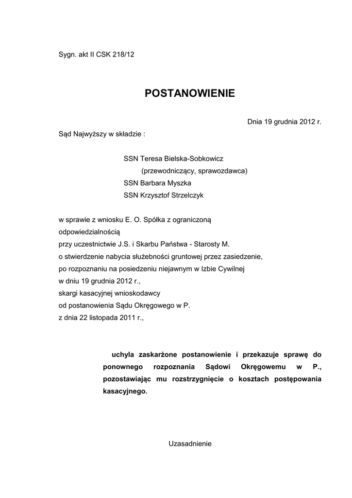Sygn. akt II CSK 218/12 POSTANOWIENIE Dnia 19 grudnia 2012 r. Sąd Najwyższy w składzie : SSN Teresa Bielska-Sobkowicz (przewodniczący, sprawozdawca) SSN Barbara Myszka SSN Krzysztof Strzelczyk w sprawie z wniosku E. O. Spółka z ograniczoną odpowiedzialnością przy uczestnictwie J.S. i Skarbu Państwa - Starosty M. o stwierdzenie nabycia służebności gruntowej przez zasiedzenie, po rozpoznaniu na posiedzeniu niejawnym w Izbie Cywilnej w dniu 19 grudnia 2012 r., skargi kasacyjnej wnioskodawcy od postanowienia Sądu Okręgowego w P. z dnia 22 listopada 2011 r., uchyla zaskarżone postanowienie i przekazuje sprawę do ponownego rozpoznania Sądowi Okręgowemu w P., pozostawiając mu rozstrzygnięcie o kosztach postępowania kasacyjnego. Uzasadnienie 2 Sąd Rejonowy w S. postanowieniem z dnia 19 kwietnia 2011 r. oddalił wniosek E. sp. z o.o., przy uczestnictwie J. S. oraz Skarbu Państwa – Starosty M., o stwierdzenie nabycia służebności przesyłu przez zasiedzenie. Z ustaleń wynika, że J. S. jest właścicielem nieruchomości położonej w K., obejmującej działki nr 11/1, 36 i 37, dla której Sąd Rejonowy w S. prowadzi księgę wieczystą KW nr /…/. Na tej nieruchomości znajdują się urządzenia energetyczne w postaci linii napowietrznej 110 kV, dwóch linii napowietrznych 15 kV, linii napowietrznej 0,4 kV oraz stacji transformatorowej. Jedna z linii 15 kV powstała w latach 60 - tych XX wieku, a linie 15 kV i 110 kV powstały około 1974 r. Na nieruchomości wymieniane były słupy i stacja transformatorowa. W razie awarii pracownicy przedsiębiorstwa energetycznego celem jej usunięcia wchodzą na teren nieruchomości, a nadto raz na 5 lat dokonują sprawdzenia stanu technicznego linii energetycznych. Na wejście na nieruchomość uczestnika J. S. wnioskodawca ma jego pisemną zgodę. Początkowo z urządzeń posadowionych na nieruchomości korzystało przedsiębiorstwo państwowe Zakład Energetyczny P., które aktem notarialnym z dnia 12 lipca 1993 r. zostało przekształcone w jednoosobową spółkę akcyjną Skarbu Państwa o nazwie Energetyka P. S.A. i która w dniu 2 stycznia 2003 r. stała się częścią Grupy Energetycznej E. S.A., nazywającej się od 13 października 2004 r. E. S.A. W dniu 30 czerwca 2007 r. E. S.A. zbyła na rzecz wnioskodawcy E. O. sp. z o.o. zorganizowaną część przedsiębiorstwa przeznaczoną do realizacji zadań gospodarczych związanych z dystrybucją energii elektrycznej. Sąd Rejonowy uznał, że przed ustawowym uregulowaniem służebności przesyłu (art. 3041 – 3054 k.c.), dopuszczalne było, na podstawie art. 352 § 1, art. 292 oraz art. 3054 k.c., nabycie w drodze zasiedzenia służebności odpowiadającej treści służebności przesyłu na rzecz przedsiębiorstwa, wnioskodawca nie spełnił jednak ustawowych przesłanek. Na nieruchomości wzniesione zostały trwałe i widoczne urządzenia, jednak nie została spełniona przesłanka samoistnego posiadania nieruchomości przez wnioskodawcę, albowiem przedsiębiorstwo przesyłowe uzyskiwało zgodę pisemną właściciela nieruchomości na wejście na teren nieruchomości celem wymiany urządzeń energetycznych. Świadczy to o braku woli korzystania z nieruchomości w zakresie służebności gruntowej 3 odpowiadającej służebności przesyłu. Wniosek podlegał oddaleniu również dlatego, że w toku postępowania nie udało się ustalić, kiedy dokładnie poprzednik prawny wnioskodawcy wszedł w posiadanie służebności. Sąd podkreślił, że na nieruchomości znajdują się cztery linie energetyczne i stacja transformatorowa, które powstały w różnych latach. Wnioskodawca nie wykazał, kiedy te urządzenia powstały i kiedy przystąpiono do eksploatacji wszystkich linii energetycznych. Nie można zatem, zdaniem Sądu, ustalić czy upłynął wymagany termin zasiedzenia. Postanowieniem z dnia 22 listopada 2011 r. Sąd Okręgowy oddalił apelację wnioskodawcy od powyższego orzeczenia. Sąd ten podzielił dokonane ustalenia faktyczne. Nie podzielił natomiast oceny, że charakter posiadania wykonywanego przez wnioskodawcę i jego poprzedników prawnych w stosunku do znajdujących się na nieruchomości uczestnika J. S. urządzeń nie mógł prowadzić do zasiedzenia służebności. Powołując się na treść art. 336 k.c. oraz art. 292 k.c. wskazał, że do zasiedzenia służebności gruntowej nie ma zastosowania wymaganie posiadania samoistnego (art. 172 § 1 k.c. w zw. z art. 336 k.c.). Wystarczające w tym zakresie jest ustalenie istnienia posiadania zależnego w zakresie odpowiadającym służebności przesyłu. Posiadanie wnioskodawcy i jego poprzedników prawnych było wykonywane z zamiarem korzystania z posadowionych na gruncie urządzeń energetycznych dla siebie, o czym może świadczyć fakt, że wnioskodawca korzystał z nich nieodpłatnie. Wniosek podlegał jednak oddaleniu z uwagi na niewykazanie przez wnioskodawcę daty, w jakiej przystąpił do eksploatacji tych urządzeń. W ocenie Sąd Okręgowego, początek biegu terminu zasiedzenia należy utożsamiać nie z momentem wybudowania trwałego i widocznego urządzenia, lecz z momentem przystąpienia do korzystania z niego w zakresie odpowiadającym treści służebności. W skardze kasacyjnej, opartej na podstawie naruszenia przepisów prawa materialnego (art. 3983 § 1 pkt. 1 k.p.c.), wnioskodawca zarzucił naruszenie art. 292 k.c. w związku z art. 3054 k.c. i 172 k.c. poprzez niewłaściwe zastosowanie i przyjęcie, że w ustalonym w sprawie stanie faktycznym wykonywanie przez wnioskodawcę na nieruchomości uczestnika J. S. prawa służebności odpowiadającego treścią służebności przesyłu nie doprowadziło do nabycia 4 służebności w drodze zasiedzenia przez wnioskodawcę. W konkluzji wnosił o uchylenie w całości zaskarżonego postanowienia i orzeczenie co do istoty sprawy, ewentualnie przekazanie sprawy do ponownego rozpoznania. W odpowiedzi na skargę kasacyjną uczestnik postępowan