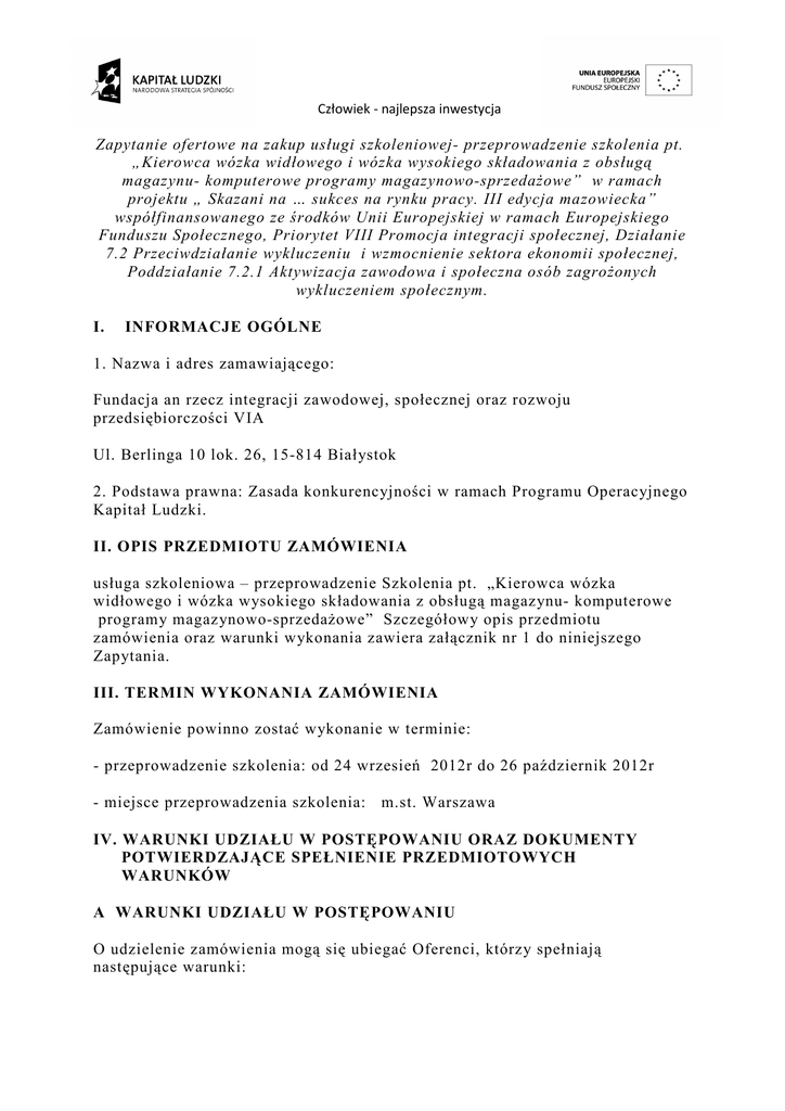 Człowiek - najlepsza inwestycja Zapytanie ofertowe na zakup usługi szkoleniowej- przeprowadzenie szkolenia pt. „Kierowca wózka widłowego i wózka wysokiego składowania z obsługą magazynu- komputerowe programy magazynowo-sprzedażowe” w ramach projektu „ Skazani na … sukces na rynku pracy. III edycja mazowiecka” współfinansowanego ze środków Unii Europejskiej w ramach Europejskiego Funduszu Społecznego, Priorytet VIII Promocja integracji społecznej, Działanie 7.2 Przeciwdziałanie wykluczeniu i wzmocnienie sektora ekonomii społecznej, Poddziałanie 7.2.1 Aktywizacja zawodowa i społeczna osób zagrożonych wykluczeniem społecznym. I. INFORMACJE OGÓLNE 1. Nazwa i adres zamawiającego: Fundacja an rzecz integracji zawodowej, społecznej oraz rozwoju przedsiębiorczości VIA Ul. Berlinga 10 lok. 26, 15-814 Białystok 2. Podstawa prawna: Zasada konkurencyjności w ramach Programu Operacyjnego Kapitał Ludzki. II. OPIS PRZEDMIOTU ZAMÓWIENIA usługa szkoleniowa – przeprowadzenie Szkolenia pt. „Kierowca wózka widłowego i wózka wysokiego składowania z obsługą magazynu- komputerowe programy magazynowo-sprzedażowe” Szczegółowy opis przedmiotu zamówienia oraz warunki wykonania zawiera załącznik nr 1 do niniejszego Zapytania. III. TERMIN WYKONANIA ZAMÓWIENIA Zamówienie powinno zostać wykonanie w terminie: - przeprowadzenie szkolenia: od 24 wrzesień 2012r do 26 październik 2012r - miejsce przeprowadzenia szkolenia: m.st. Warszawa IV. WARUNKI UDZIAŁU W POSTĘPOWANIU ORAZ DOKUMENTY POTWIERDZAJĄCE SPEŁNIENIE PRZEDMIOTOWYCH WARUNKÓW A WARUNKI UDZIAŁU W POSTĘPOWANIU O udzielenie zamówienia mogą się ubiegać Oferenci, którzy spełniają następujące warunki: Człowiek - najlepsza inwestycja 1. Posiadają niezbędną wiedzę i doświadczenie oraz potencjał techniczny, a także dysponują osobami zdolnymi do wykonania usługi zgodnie z przedmiotem zamówienia. Zamawiający uzna powyższy warunek za spełniony w przypadku łącznego spełnienia następujących warunków: a. doświadczenia co najmniej jednego prowadzącego odpowiedzialnego za przeprowadzenie szkolenia b. wykonania co najmniej 2 szkoleń o podobnym zakresie i tematyce w okresie 24 miesięcy przed datą złożenia oferty 2. Nie zalegają z uiszczeniem podatków, opłat lub składek na ubezpieczenia społeczne i zdrowotne. B DOKUMENTY POTWIERDZAJĄCE SPEŁNIENIE WARUNKÓW 1. Wykaz należycie wykonanych usług – zgodnie ze wzorem stanowiącym Załącznik nr 3 2. Wpis do instytucji szkoleniowych prowadzonych przez wojewódzki urząd pracy właściwy dla Wykonawcy lub wpis do biura edukacji właściwy dla Wykonawcy 3. Aktualny odpis z właściwego rejestru lub aktualne zaświadczenie o wpisie do ewidencji działalności gospodarczej, wystawione nie wcześniej niż 6 miesięcy przed upływem terminu składania ofert. 4. Przedstawienie programu szkolenia uwzględniający przedstawiony zakres merytoryczno-praktyczny w załączniku nr 1 V. KRYTERIUM OCENY OFERTY 1. Zamawiający wybierze do realizacji zamówienia Wykonawcę, którego oferta spełnia łącznie następujące warunki: a) uzyska najwyższą liczbę punktów, b) spełnia warunki określone w pkt. IV, c) nie będzie podlegała odrzuceniu. 2. Poszczególne oferty będą oceniane przez Zamawiającego według podanego niżej kryterium: a) doświadczenie Wnioskodawcy – 10% b) cena – 70% Człowiek - najlepsza inwestycja c) program szkolenia opracowany w oparciu o zakres merytoryczno-praktyczny20% VI.OPIS PRZYGOTOWANIA OFERTY 1. Ofertę należy sporządzić wg wzoru stanowiącego Załącznik nr 2 zapytania ofertowego. Do oferty należy dołączyć: do a. dokumenty wymienione w pkt. IV B Zapytania; b. program szkolenia ze wskazaniem celów i efektów szkolenia, propozycję materiałów szkoleniowych oraz projekt certyfikatu ukończenia szkolenia- w celu weryfikacji zgodności z opisem przedmiotu zamówienia; c. pełnomocnictwo do reprezentowania, o ile ofertę składa pełnomocnik, jeśli nie wynika ono z odpisu z właściwego rejestru albo zaświadczenia o wpisie do ewidencji działalności gospodarczej. 2. Niedołączenie do oferty któregokolwiek dokumentu, o którym mowa w ust. 1 spowoduje odrzucenie oferty. VII. MIEJSCE I TERMIN ZŁOŻENIA OFERTY 1. Ofertę należy złożyć nie później niż do dnia 13 września 2012r do godziny 14.00, w formie pisemnej – pocztą tradycyjną , elektroniczną ( skany dokumentów oryginalnych), kurierem lub osobiście pod adres Fundacja na rzecz integracji zawodowej, społecznej oraz rozwoju przedsiębiorczości VIA Oddział w Warszawie ul Długa 44/50 lok. 205 00-241 Warszawa ; poczta elektroniczna e mail 50plus@via,org.pl 2. Oferta musi być złożona w zamkniętej nieprzezroczystej kopercie z dopiskiem „ OFERTA na usługę szkoleniową – przeprowadzenie szkolenia pt. „Kierowca wózka widłowego i wózka wysokiego składowania z obsługą magazynu- komputerowe programy magazynowo-sprzedażowe.” O ważności składanej oferty decyduje data i godzina wpływu oferty do Oddziału Fundacji w Warszawie – dotyczy składania oryginału dokumentów pocztą tradycyjną, kurierem bądź osobiście. 3. W przypadku przesłania oferty pocztą elektroniczną Wykonawca zobowiązany jest przesłać oryginały dokumentów w formie papierowej w ciągu 2 dni od przesłania oferty drogą elektroniczną. 4. Oferta winna być przygotowana w języku polskim, czytelnie, w jednym egzemplarzu. Cena oferty musi być podana w złotych. 5. Każdy Oferent może złożyć tylko jedną ofertę. Człowiek - najlepsza inwestycja 6. Oferta powinna zawierać pieczęć nagłówkową Oferenta, jego podpis, a oświadczenia –załącznik nr 2 i 3 podpisane w oryginale. VIII. OGŁOSZENIE WYNIKÓW POSTĘPOWANIA 1. Zamawiający sporządzi pisemny protokół postępowania i wyboru najkorzystniejszej oferty. 2. Wykonawcy , którzy złożą oferty zostaną zawiadomieni o wyborze najkorzystniejszej oferty. Informacja o wyborze 