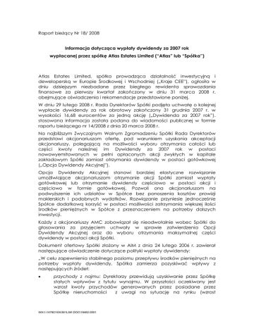 Raport bieżący Nr 18/ 2008 Informacja dotycząca wypłaty dywidendy za 2007 rok wypłacanej przez spółkę Atlas Estates Limited (“Atlas” lub “Spółka”) Atlas Estates Limited, spółka prowadząca działalność inwestycyjną i deweloperską w Europie Środkowej i Wschodniej („Kraje CEE”), ogłosiła w dniu dzisiejszym niezbadane przez biegłego rewidenta sprawozdania finansowe za pierwszy kwartał zakończony w dniu 31 marca 2008 r. obejmujące oświadczenia i rekomendacje przedstawione poniżej. W dniu 29 lutego 2008 r. Rada Dyrektorów Spółki podjęła uchwałę o kolejnej wypłacie dywidendy za rok obrotowy zakończony 31 grudnia 2007 r. w wysokości 16,68 eurocentów za jedną akcję („Dywidenda za 2007 rok”). stosowana informacja została podana do wiadomości publicznej w formie raportu bieżącego nr 14/2008 z dnia 20 marca 2008 r. Na najbliższym Zwyczajnym Walnym Zgromadzeniu Spółki Rada Dyrektorów przedstawi akcjonariuszom ofertę, pod warunkiem uzyskania akceptacji akcjonariuszy, polegającą na możliwości wyboru otrzymania całości lub części kwoty należnej im Dywidendy za 2007 rok w postaci nowowyemitowanych w pełni opłaconych akcji zwykłych w kapitale zakładowym Spółki zamiast otrzymania dywidendy w postaci gotówkowej („Opcja Dywidendy Akcyjnej”). Opcja Dywidendy Akcyjnej stanowi bardziej elastyczne rozwiązanie umożliwiające akcjonariuszom otrzymanie akcji Spółki zamiast wypłaty gotówkowej lub otrzymanie dywidendy częściowo w postaci akcji i częściowo w formie gotówkowej. Pozwoli ona akcjonariuszom na podwyższenie ich udziałów w Spółce bez ponoszenia kosztów prowizji maklerskich i podobnych wydatków. Rozwiązanie przyniesie jednocześnie Spółce dodatkową korzyść w postaci możliwości zatrzymania większej ilości środków pieniężnych w Spółce z przeznaczeniem na potrzeby dalszych inwestycji. Każdy z akcjonariuszy AMC zobowiązał się nieodwołalnie wobec Spółki do głosowania za przyjęciem uchwały w sprawie zatwierdzenia Opcji Dywidendy Akcyjnej oraz do wyboru otrzymania maksymalnej części dywidendy w postaci akcji Spółki. Dokument ofertowy Spółki złożony w AIM z dnia 24 lutego 2006 r. zawierał następujące oświadczenie dotyczące polityki wypłaty dywidendy: „W celu zapewnienia stabilnego poziomu przepływu środków pieniężnych na potrzeby wypłaty dywidendy, Spółka zamierza pozyskiwać wpływy z następujących źródeł: • przychody z najmu: Dyrektorzy przewidują uzyskiwanie przez Spółkę stałych wpływów z tytułu wynajmu. W przyszłości oczekiwany jest wzrost kwoty przychodów generowanych przez posiadane przez Spółkę nieruchomości z uwagi na sytuację na rynku (wzrost WA1:\147801\04\361L04!.DOC\18462.0001 zapotrzebowania na nieruchomości użytkowe wysokiej jakości) oraz dzięki aktywnemu zarządzaniu portfelem nieruchomości; • sprzedaż lokali mieszkalnych: Spółka planuje pozyskać wpływy gotówkowe ze sprzedaży mieszkań i apartamentów w realizowanych przez nią inwestycjach. Projekty te nie zapewniają stałego przypływu środków, ale umożliwiają uzyskanie wpływów w momencie sprzedaży i wydania lokali. Spółka oczekuje, że wpływy netto z tego tytułu będą wykorzystane na kolejne inwestycje oraz na wypłatę dywidendy na rzecz akcjonariuszy; oraz • sprzedaż inwestycji: możliwa jest sprzedaż przez Spółkę niektórych z posiadanych przez nią inwestycji. Zysk netto ze sprzedaży zostanie przeznaczony na kolejne inwestycje oraz na wypłatę dywidendy na rzecz akcjonariuszy.” Oświadczenia i zastrzeżenia dotyczące polityki dywidendy Spółki znalazły się w prospekcie z dnia 31 stycznia 2008 r. Portfel Spółki jest budowany w sposób zapewniający generowanie zysków dla akcjonariuszy w perspektywie długoterminowej. Wyniki Spółki pokazują, że przychody z tytułu wynajmu nieruchomości wchodzących w skład portfela Spółki nie generują w chwili obecnej – po uwzględnieniu kosztów działalności oraz kosztów finansowania – operacyjnych przepływów gotówkowych. Spółka oczekuje jednak uzyskania znaczących zysków i przepływów gotówkowych ze sprzedaży lokali mieszkalnych począwszy od końca roku 2009. Zasady polityki dywidendy Spółki przedstawione w prospekcie emisyjnym Spółki pozostały niezmienione. Rada Dyrektorów poddaje te zasady bieżącej weryfikacji biorąc pod uwagę wysokość wpływów pieniężnych pozyskanych przez Spółkę z powyższych rodzajów działalności, kwotę bieżącego zadłużenia Spółki, w szczególności zadłużenia typu recourse debt (z prawem regresu), oraz dostępne Spółce możliwości inwestycyjne. Długoterminowe perspektywy rozwoju Spółki oraz stan jej aktywów są jednak uzależnione od dostępności kapitału, a sytuacja na rynkach finansowych oraz kryzys płynności, który wystąpił w gospodarkach na całym świecie i wywarł między innymi niekorzystny wpływ na działalność spółek w całym obszarze sektorze Europy Środkowej i Wschodniej. może spowodować nieznaczne opóźnienia w planowanych terminach realizacji projektów Spółki. Ponadto Rada Dyrektorów ustaliła kwotę wynagrodzenia za wyniki (performance fee) należną AMC za rok obrotowy zakończony w dniu 31 grudnia 2007 r. na 7,037 mln Euro. Pierwsze 2,5 mln Euro z tej kwoty zostało wypłacone AMC w gotówce. AMC oraz Spółka prowadzą w obecnej chwili rozmowy dotyczące warunków, na jakich AMC byłaby skłonna wyrazić zgodę na otrzymanie pozostałej części należnego jej wynagrodzenia w postaci nowowyemitowanych akcji zwykłych Spółki. Realizacja emisji na ten cel byłaby uzależniona od uzyskania zgody akcjonariuszy w formie uchwały, która zostanie poddana pod głosowanie na kolejnym Walnym Zgromadzeniu Akcjonariuszy Spółki. WA1:\147801\04\361L04!.DOC\18462.0001 2 Podstawa prawna: Art. 56 ust. 1 pkt 1) Ustawy z dnia 29 lipca 2005 r. o ofercie publicznej i warunkach wprowadzania