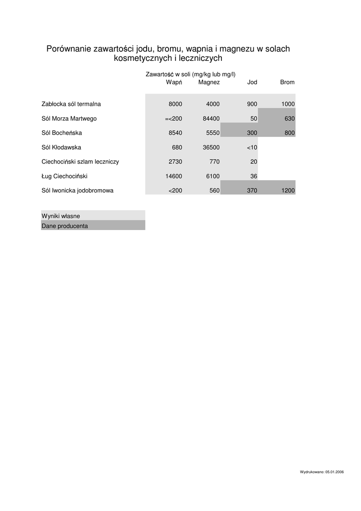 Porównanie zawartości jodu, bromu, wapnia i magnezu w solach kosmetycznych i leczniczych Zawarto w soli (mg/kg lub mg/l) Magnez Wap Zabłocka sól termalna Jod Brom 8000 4000 900 1000 =<200 84400 50 630 Sól Boche ska 8540 5550 300 800 Sól Kłodawska 680 36500 <10 2730 770 20 14600 6100 36 <200 560 370 Sól Morza Martwego Ciechoci ski szlam leczniczy Ług Ciechoci ski Sól Iwonicka jodobromowa 1200 Wyniki własne Dane producenta Wydrukowano: 05.01.2006