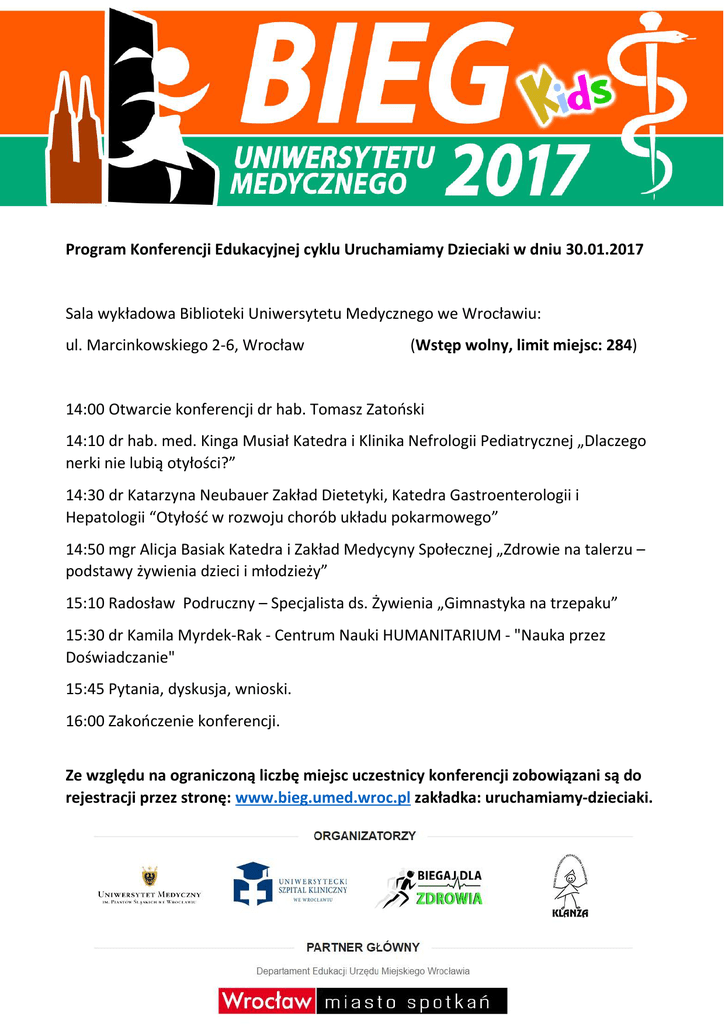 Program Konferencji Edukacyjnej cyklu Uruchamiamy Dzieciaki w dniu 30.01.2017 Sala wykładowa Biblioteki Uniwersytetu Medycznego we Wrocławiu: ul. Marcinkowskiego 2-6, Wrocław (Wstęp wolny, limit miejsc: 284) 14:00 Otwarcie konferencji dr hab. Tomasz Zatoński 14:10 dr hab. med. Kinga Musiał Katedra i Klinika Nefrologii Pediatrycznej „Dlaczego nerki nie lubią otyłości?” 14:30 dr Katarzyna Neubauer Zakład Dietetyki, Katedra Gastroenterologii i Hepatologii “Otyłość w rozwoju chorób układu pokarmowego” 14:50 mgr Alicja Basiak Katedra i Zakład Medycyny Społecznej „Zdrowie na talerzu – podstawy żywienia dzieci i młodzieży” 15:10 Radosław Podruczny – Specjalista ds. Żywienia „Gimnastyka na trzepaku” 15:30 dr Kamila Myrdek-Rak - Centrum Nauki HUMANITARIUM - "Nauka przez Doświadczanie" 15:45 Pytania, dyskusja, wnioski. 16:00 Zakończenie konferencji. Ze względu na ograniczoną liczbę miejsc uczestnicy konferencji zobowiązani są do rejestracji przez stronę: www.bieg.umed.wroc.pl zakładka: uruchamiamy-dzieciaki.
