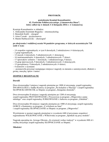PROTOKÓŁ posiedzenia Komisji Konsultantów 42. Festiwalu Folklorystycznego „Limanowska Słaza”, który odbył się w dniach 3–6 listopada 2016 r. w Limanowej Komisja Konsultantów w składzie: 1. Aleksandra Szurmiak-Bogucka – etnomuzykolog 2. Benedykt Kafel – etnograf 3. Artur Czesak – językoznawca 4. Marek Harbaczewski – choreograf po obejrzeniu i wnikliwej ocenie 94 punktów programu, w których uczestniczyło 718 osób w tym: – 14 zespołów regionalnych, w tym 8 dorosłych, 2 młodzieżowe i 4 dziecięcych, – 2 grup regionalnych, – 12 muzyk: 6 dorosłych, 5 młodzieżowych i 1 dziecięcej; – 16 instrumentalistów: 6 dorosłych, 3 młodzieżowych i 7 dzieci; – 17 śpiewaków solistów: 7 dorosłych, 1 młodzieżowego, 9 dzieci; – 14 grup śpiewaczych, 9 dorosłych, 3 młodzieżowych i 2 dziecięcych; – 15 gawędziarzy: 9 dorosłych, 2 młodzieżowych i 4 dzieci; – 4 mistrzów z uczniami — postanowiła przyznać następujące miejsca i nagrody za starania o autentyczność, dbałość o gwarę, muzykę, śpiew i taniec: ZESPOŁY REGIONALNE Dorośli Dwa równorzędne I miejsca i nagrody pieniężne po 1800 zł otrzymują: zespół regionalny ŚWARNI ŁOJCE z Sadku-Kostrzy za program „Po kolędzie u Macieja” i zespół regionalny SŁOPNICKI ZBYRCOK ze Słopnic za program „Śmiguśne słomioki”. Dwa równorzędne II miejsca i nagrody pieniężne po 1200 zł otrzymują: zespół regionalny PRZYSZOWIANIE z Przyszowej za program „Obigrowka u pana młodego” oraz zespół regionalny JURKOWIANIE z Jurkowa za program „Oskubek”. Dwa równorzędne III miejsca i nagrody pieniężne po 1000 zł otrzymują: zespół regionalny GORCE z Kamienicy za program „Z wióchom na Jana” i zespół regionalny SŁOPNICZANIE ze Słopnic za program „Obigrowka”. Wyróżnienie w postaci nagrody pieniężnej w wysokości 600 zł przyznano zespołowi regionalnemu WILKOWICANIE z Wilkowiska za program „Spotkali się przy stodole”. Nagrodę specjalną im. Jerzego Obrzuta „Za wierność wobec tradycji” w wysokości 800 zł i rzeźbę otrzymuje zespół regionalny SŁOPNICZANIE ze Słopnic. Młodzież I miejsce i nagrodę pieniężną w wysokości 1200 zł przyznano zespołowi regionalnemu SZCZYRZYCANIE (grupa młodzieżowa) ze Szczyrzyca za program „Przed Matką Boską Zielną”. Wyróżnienie w postaci nagrody pieniężnej w wysokości 500 zł otrzymuje młodzieżowy zespół regionalny OLSZOWIANIE z Olszówki za program „Rwanie lnu”. Dzieci Pierwsze miejsce i nagrodę pieniężną w wysokości 1000 zł otrzymuje: zespół regionalny PNIOKI z Sadku-Kostrzy za program „Na wygonie płod lascom”. Dwa równorzędne II miejsca i nagrody pieniężne po 800 zł otrzymują: MALI SŁOPNICZANIE ze Słopnic za program „Na polanie” oraz zespół regionalny MALI WILKOWICANIE z Wilkowiska za program „Na pouzie”. III miejsce i nagrodę pieniężną w wysokości 500 zł otrzymuje zespół regionalny DOLINA SŁOMKI ze Stronia za program „Na polanie”. GRUPY REGIONALNE Dwa równorzędne pierwsze miejsca i nagrody pieniężne po 500 zł otrzymują: KIJOM WORCI z Pisarzowej za program „Maryśka! Psiokrew! [Przy szatkowaniu kapusty]” i KGW Laskowa za program „Przy skubaniu pierzy”. MUZYKI LUDOWE Dorośli Dwa równorzędne I miejsca i nagrody pieniężne po 500 zł otrzymuje muzyka KASINIANIEZAGÓRZANIE z Kasiny Wielkiej i MUZYKA JAKUBA RUSIECKIEGO z Poręby Wielkiej. Dwa równorzędne II miejsca i nagrody pieniężne po 400 zł otrzymują: MUZYKA Z WILKOWISKA i muzyka SZCZYRZYCANIE ze Szczyrzyca. Dwa równorzędne III miejsca i nagrody pieniężne po 300 zł otrzymują: muzyka SŁOPNICKI ZBYRCOK ze Słopnic oraz muzyka LIMANOWIANIE z Limanowej. Młodzież Dwa równorzędne I miejsca nagrody rzeczowe i okolicznościowe upominki otrzymują: MALI SZCZYRZYCANIE z Pogorzan i DOLINA MSZANKI z Mszany Górnej. Dwa równorzędne II miejsca i nagrody rzeczowe otrzymują: muzyka LIMANOWIANIE z Limanowej oraz MUZYKA Z KRASNEGO-LASOCIC. III miejsce i okolicznościowy upominek otrzymuje muzyka OLSZOWIANIE z Olszówki. Dzieci I miejsce nagrodę rzeczową i okolicznościowy upominek otrzymuje muzyka SMYCKI z Kamienicy. INSTRUMENTALIŚCI LUDOWI Dorośli Dwa równorzędne I miejsca i nagrody pieniężną w wysokości 250 zł otrzymują: Iwona Cichoń z Łukowicy oraz Bronisław Kaczor z Poręby Wielkiej. Dwa równorzędne II miejsca wraz z nagrodami pieniężnymi w wysokości po 200 zł otrzymują: Tobiasz Krzysztof z Mszany Górnej i Józef Tokarczyk z Mordarki. Dwa równorzędne III miejsca wraz z nagrodami pieniężnymi w wysokości po 150 zł otrzymują: Dominik Matras ze Słopnic i Barbara Stożek z Mszany Dolnej. Młodzież Pierwsze miejsce nagrodę rzeczową i okolicznościowy upominek otrzymuje Karol Adamczyk z Poręby Wielkiej. II miejsce i nagrodę rzeczową otrzymuje Zofia Pazdan z Janowic gm. Jodłownik. III miejsce i nagrodę rzeczową otrzymuje Piotr Cuper ze Szczyrzyca. Dzieci Dwa równorzędne I miejsca, nagrody rzeczowe i okolicznościowe upominki otrzymują: Kacper Dudzik z Kamienicy i Hubert Adamczyk z Poręby Wielkiej. Trzy równorzędne II miejsca i nagrody rzeczowe otrzymują Karol Morajko z Przenoszy gm. Dobra, Wojciech Tabor z Sadku oraz Paweł Smaciarz z Niedźwiedzia. Dwa równorzędne III miejsca i nagrody rzeczowe otrzymują: Patrycja Dudzik z Łostówki i Katarzyna Jędrzejek z Młynnego. ŚPIEW SOLOWY Dorośli I miejsca nie przyznano. Trzy równorzędne II miejsca i nagrody pieniężne po 200 zł otrzymują: Anna KaciczakDomagała z Poręby Wielkiej, Paweł Juszczak z Kisielówki i Bogusław Nawara z Olszówki. Dwa równorzędne III miejsca i nagrody pieniężne po 150 zł otrzymują: Anna Gajewska z Mszany Dolnej i Maria Franczak ze Starej Wsi. Dwa wyróżnienia w postaci okolicznościowych upominków otrzymują: Stanisława Oleksy z Męciny i Barbara Stożek z Mszany Dolnej. Młodzież I miejsca nie przyznano. II miejsce i nagrodę r