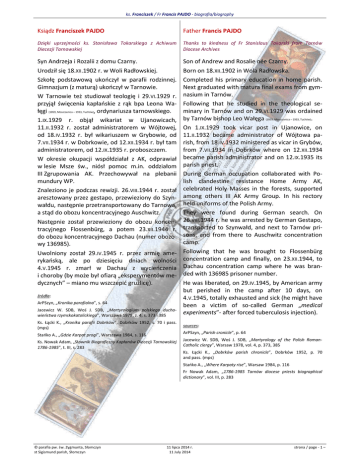 ks. Franciszek / Fr Francis PAJDO - biografia/biography Ksiądz Franciszek PAJDO Father Francis PAJDO Dzięki uprzejmości ks. Stanisława Tokarskiego z Achiwum Diecezji Tarnowskiej Thanks to kindness of Fr Stanislaus Tokarski from Tarnów Diocese Archives Syn Andrzeja i Rozalii z domu Czarny. Urodził się 18.XII.1902 r. w Woli Radłowskiej. Szkołę podstawową ukończył w parafii rodzinnej. Gimnazjum (z maturą) ukończył w Tarnowie. W Tarnowie też studiował teologię i 29.VI.1929 r. przyjął święcenia kapłańskie z rąk bpa Leona Wałęgi (1859, Moszczenica – 1933, Tuchów), ordynariusza tarnowskiego. 1.IX.1929 r. objął wikariat w Ujanowicach, 11.II.1932 r. został administratorem w Wójtowej, od 18.IV.1932 r. był wikariuszem w Grybowie, od 7.VII.1934 r. w Dobrkowie, od 12.XII.1934 r. był tam administratorem, od 12.IX.1935 r. proboszczem. W okresie okupacji współdziałał z AK, odprawiał w lesie Msze św., niósł pomoc m.in. oddziałom III Zgrupowania AK. Przechowywał na plebanii mundury WP. Znaleziono je podczas rewizji. 26.VIII.1944 r. został aresztowany przez gestapo, przewieziony do Szynwałdu, następnie przetransportowany do Tarnowa, a stąd do obozu koncentracyjnego Auschwitz. Następnie został przewieziony do obozu koncentracyjnego Flossenbürg, a potem 23.XII.1944 r. do obozu koncentracyjnego Dachau (numer obozowy 136985). Uwolniony został 29.IV.1945 r. przez armię amerykańską, ale po dziesięciu dniach wolności 4.V.1945 r. zmarł w Dachau z wycieńczenia i choroby (by może był ofiarą „eksperymentów medycznych” – miano mu wszczepić gruźlicę). Son of Andrew and Rosalie née Czarny. Born on 18.XII.1902 in Wola Radłowska. Completed his primary education in home parish. Next graduated with matura final exams from gymnasium in Tarnów. Following that he studied in the theological seminary in Tarnów and on 29.VI.1929 was ordained by Tarnów bishop Leo Wałęga (1859, Moszczenica – 1933, Tuchów). On 1.IX.1929 took vicar post in Ujanowice, on 11.II.1932 became administrator of Wójtowa parish, from 18.IV.1932 ministered as vicar in Grybów, from 7.VII.1934 in Dobrków where on 12.XII.1934 became parish administrator and on 12.IX.1935 its parish priest. During German occupation collaborated with Polish clandestine resistance Home Army AK, celebrated Holy Masses in the forests, supported among others III AK Army Group. In his rectory held uniforms of the Polish Army. They were found during German search. On 26.VIII.1944 r. he was arrested by German Gestapo, transported to Szynwałd, and next to Tarnów prisons, and from there to Auschwitz concentration camp. Following that he was brought to Flossenbürg concentration camp and finally, on 23.XII.1944, to Dachau concentration camp where he was branded with 136985 prisoner number. He was liberated, on 29.IV.1945, by American army but perished in the camp after 10 days, on 4.V.1945, totally exhausted and sick (he might have been a victim of so-called German „medical experiments”- after forced tuberculosis injection). źródła: ArPSzyn, „Kronika parafialna”, s. 64 Jacewicz W. SDB, Woś J. SDB, „Martyrologium polskiego duchowieństwa rzymskokatolickiego”, Warszawa 1978, z. 4, s. 373 i 385 Ks. Łącki K., „Kronika parafii Dobrków”, Dobrków 1952, s. 70 i pass. (mps) sources: ArPSzyn, „Parish cronicle”, p. 64 Stańko A., „Gdzie Karpat progi”, Warszawa 1984, s. 116 Ks. Nowak Adam, „Słownik Biograficzny Kapłanów Diecezji Tarnowskiej 1786-1985”, t. III, s. 283 Jacewicz W. SDB, Woś J. SDB, „Martyrology of the Polish RomanCatholic clergy”, Warsaw 1978, vol. 4, p. 373, 385 Ks. Łącki K., „Dobrków parish chronicle”, Dobrków 1952, p. 70 and pass. (mps) Stańko A., „Where Karpaty rise”, Warsaw 1984, p. 116 Fr Nowak Adam, „1786-1985 Tarnów diocese priests biographical dictionary”, vol. III, p. 283 © parafia pw. św. Zygmunta, Słomczyn st Sigismund parish, Słomczyn 11 lipca 2014 r. 11 July 2014 strona / page - 1 – ks. Franciszek / Fr Francis PAJDO - biografia/biography Tablica pamiątkowa, katedra, Tarnów © parafia pw. św. Zygmunta, Słomczyn st Sigismund parish, Słomczyn Commemorative plaque, cathedral, Tarnów 11 lipca 2014 r. 11 July 2014 strona / page - 2 –