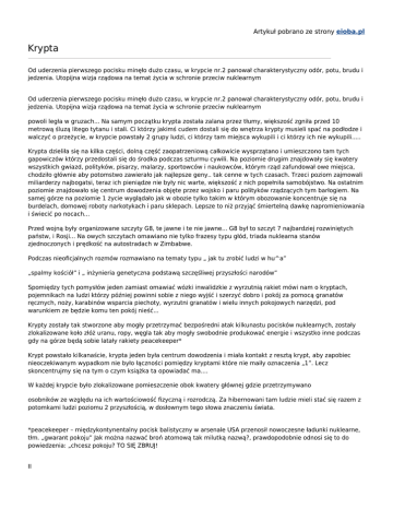 Artykuł pobrano ze strony eioba.pl Krypta Od uderzenia pierwszego pocisku minęło dużo czasu, w krypcie nr.2 panował charakterystyczny odór, potu, brudu i jedzenia. Utopijna wizja rządowa na temat życia w schronie przeciw nuklearnym Od uderzenia pierwszego pocisku minęło dużo czasu, w krypcie nr.2 panował charakterystyczny odór, potu, brudu i jedzenia. Utopijna wizja rządowa na temat życia w schronie przeciw nuklearnym powoli legła w gruzach... Na samym początku krypta została zalana przez tłumy, większość zgniła przed 10 metrową śluzą litego tytanu i stali. Ci którzy jakimś cudem dostali się do wnętrza krypty musieli spać na podłodze i walczyć o przeżycie, w krypcie powstały 2 grupy ludzi, ci którzy tam miejsca wykupili i ci którzy ich nie wykupili..... Krypta dzieliła się na kilka części, dolną część zaopatrzeniową całkowicie wysprzątano i umieszczono tam tych gapowiczów którzy przedostali się do środka podczas szturmu cywili. Na poziomie drugim znajdowały się kwatery wszystkich gwiazd, polityków, pisarzy, malarzy, sportowców i naukowców, którym rząd zafundował owe miejsca, chodziło głównie aby potomstwo zawierało jak najlepsze geny.. tak cenne w tych czasach. Trzeci poziom zajmowali miliarderzy najbogatsi, teraz ich pieniądze nie były nic warte, większość z nich popełniła samobójstwo. Na ostatnim poziomie znajdowało się centrum dowodzenia objęte przez wojsko i paru polityków rządzących tym barłogiem. Na samej górze na poziomie 1 życie wyglądało jak w obozie tylko takim w którym obozowanie koncentruje się na burdelach, domowej roboty narkotykach i paru sklepach. Lepsze to niż przyjąć śmiertelną dawkę napromieniowania i świecić po nocach... Przed wojną były organizowane szczyty G8, te jawne i te nie jawne... G8 był to szczyt 7 najbardziej rozwiniętych państw, i Rosji... Na owych szczytach omawiano nie tylko frazesy typu głód, triada nuklearna stanów zjednoczonych i prędkość na autostradach w Zimbabwe. Podczas nieoficjalnych rozmów rozmawiano na tematy typu „ jak tu zrobić ludzi w hu^a” „spalmy kościół” i „ inżynieria genetyczna podstawą szczęśliwej przyszłości narodów” Spomiędzy tych pomysłów jeden zamiast omawiać wózki inwalidzkie z wyrzutnią rakiet mówi nam o kryptach, pojemnikach na ludzi którzy później powinni sobie z niego wyjść i szerzyć dobro i pokój za pomocą granatów ręcznych, noży, karabinów wsparcia piechoty, wyrzutni granatów i wielu innych pokojowych narzędzi, pod warunkiem ze będzie komu ten pokój nieść... Krypty zostały tak stworzone aby mogły przetrzymać bezpośredni atak kilkunastu pocisków nuklearnych, zostały zlokalizowane koło złóż uranu, ropy, węgla tak aby mogły swobodnie produkować energie i wszystko inne podczas gdy na górze będą sobie latały rakiety peacekeeper* Krypt powstało kilkanaście, krypta jeden była centrum dowodzenia i miała kontakt z resztą krypt, aby zapobiec nieoczekiwanym wypadkom nie było łączności pomiędzy kryptami które nie maiły oznaczenia „1”. Lecz skoncentrujmy się na tym o czym książka ta opowiadać ma.... W każdej krypcie było zlokalizowane pomieszczenie obok kwatery głównej gdzie przetrzymywano osobników ze względu na ich wartościowość fizyczną i rozrodczą. Za hibernowani tam ludzie mieli stać się razem z potomkami ludzi poziomu 2 przyszłością, w dosłownym tego słowa znaczeniu świata. *peacekeeper – międzykontynentalny pocisk balistyczny w arsenale USA przenosił nowoczesne ładunki nuklearne, tłm. „gwarant pokoju” Jak można nazwać broń atomową tak milutką nazwą?, prawdopodobnie odnosi się to do powiedzenia: „chcesz pokoju? TO SIĘ ZBRUJ! II W komorze zaczynała opadać temperatura, ułożone w poprzek nagie ciała zaczynały ożywać, niczym lodowy golem powstający otrzepywały się z szronu i kawałków lodu. Powoli rozprostowując mięśnie odżywiane do tej pory specjalnymi odżywkami które miały na celu utrzymać ich organizmy w dobrym stanie. Do komory weszło kilka osób, opatuliło naszych hibernantów jakimiś szmatami i wyszli. # -Ty podobno wyciągają tych zmarzluchów z komór... -No to dobrze, może nadszedł czas... -Minęło dopiero ze 30 lat a oni już chcą wychodzić? Szaleństwo... -Po pierwsze to oni wyjdą a po drugie w naszej okolicy nie było bezpośredniego uderzenia, sam opad pochodzi z daleka może dlatego, a po drugie to oni wyjdą nie ty. -A co jeśli nas wyrzucą? Tam nie ma nic!!! ## -Dobra mamuty, koniec obijania się czeka was pojutrze ważna misja, byliście zamrożeni w tej bryle lodu właśnie do tego. Czyli wyleziecie z tej nory na powierzchnie... W każdym razie to nie moja decyzja. Z końca długiej i wąskiej sali dobiegał cichy głosik... -Przepraszam, ile lat minęło... Na i tak już bladej twarzy oficera pojawił się wyraz podobny do tego kiedy wiemy ze musimy powiedzieć babci ze zakosiliśmy jej rentę.... -35, minęło 35 lat. Na sali a raczej korytarzu zapanowała cisza... -To znaczy ze jak wyjdziemy to jeszcze będziemy się potykać o zgniłe wątroby i kawałki kończyn? -E.. W zasadzie tak. -A to dziwne nie uważa pan? -Dlaczego, zazwyczaj nikt się o takie małe rzeczy nie potyka.... Dobra koniec tego biadolenia, za niedługo wychodzicie, a narazie jesteście zieloni, każdy z was dostanie na te kilka dni przewodnika, oprowadzi was po krypcie i pokaże niebezpieczeństwa jakie na was czyhają... -Niebezpieczeństwa? Tutaj? -Chodzi mi głownie o gwałty, napady, kradzieże, morderstwa, pobicia, wymuszenia, narkotyki alkohol, i inne zabawki. -Tutaj? Skąd świństwo w wojskowym bunkrze?! Przecież tutaj miało być jak w Walhalli! Gdzie Odyn i Walkirie przenosząca nas do upragnionego raju?!?! -Przewodnika potraktujcie jako Odyna, jego pistolet jako Walkirie.. -A Walhalla? -Walhalla to będzie jak po 35 latach zamrożenia się wysracie. ### Spośród wszystkich spani