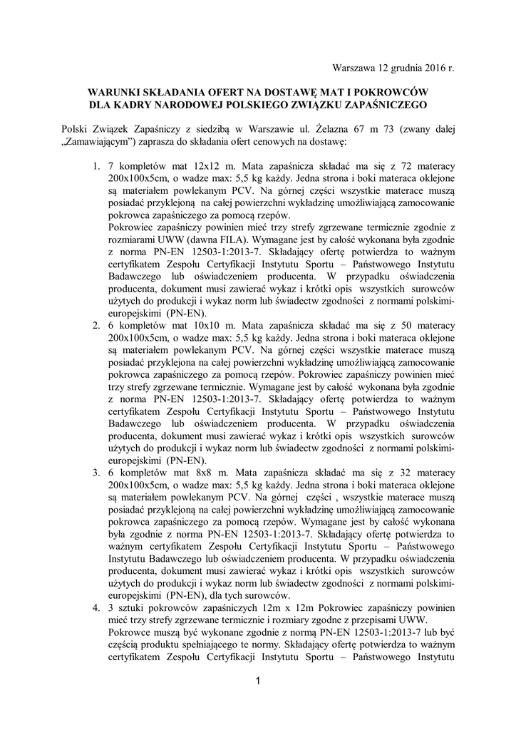 Warszawa 12 grudnia 2016 r. WARUNKI SKŁADANIA OFERT NA DOSTAWĘ MAT I POKROWCÓW DLA KADRY NARODOWEJ POLSKIEGO ZWIĄZKU ZAPAŚNICZEGO Polski Związek Zapaśniczy z siedzibą w Warszawie ul. Żelazna 67 m 73 (zwany dalej „Zamawiającym”) zaprasza do składania ofert cenowych na dostawę: 1. 7 kompletów mat 12x12 m. Mata zapaśnicza składać ma się z 72 materacy 200x100x5cm, o wadze max: 5,5 kg każdy. Jedna strona i boki materaca oklejone są materiałem powlekanym PCV. Na górnej części wszystkie materace muszą posiadać przyklejoną na całej powierzchni wykładzinę umożliwiającą zamocowanie pokrowca zapaśniczego za pomocą rzepów. Pokrowiec zapaśniczy powinien mieć trzy strefy zgrzewane termicznie zgodnie z rozmiarami UWW (dawna FILA). Wymagane jest by całość wykonana była zgodnie z norma PN-EN 12503-1:2013-7. Składający ofertę potwierdza to ważnym certyfikatem Zespołu Certyfikacji Instytutu Sportu – Państwowego Instytutu Badawczego lub oświadczeniem producenta. W przypadku oświadczenia producenta, dokument musi zawierać wykaz i krótki opis wszystkich surowców użytych do produkcji i wykaz norm lub świadectw zgodności z normami polskimieuropejskimi (PN-EN). 2. 6 kompletów mat 10x10 m. Mata zapaśnicza składać ma się z 50 materacy 200x100x5cm, o wadze max: 5,5 kg każdy. Jedna strona i boki materaca oklejone są materiałem powlekanym PCV. Na górnej części wszystkie materace muszą posiadać przyklejona na całej powierzchni wykładzinę umożliwiającą zamocowanie pokrowca zapaśniczego za pomocą rzepów. Pokrowiec zapaśniczy powinien mieć trzy strefy zgrzewane termicznie. Wymagane jest by całość wykonana była zgodnie z norma PN-EN 12503-1:2013-7. Składający ofertę potwierdza to ważnym certyfikatem Zespołu Certyfikacji Instytutu Sportu – Państwowego Instytutu Badawczego lub oświadczeniem producenta. W przypadku oświadczenia producenta, dokument musi zawierać wykaz i krótki opis wszystkich surowców użytych do produkcji i wykaz norm lub świadectw zgodności z normami polskimieuropejskimi (PN-EN). 3. 6 kompletów mat 8x8 m. Mata zapaśnicza składać ma się z 32 materacy 200x100x5cm, o wadze max: 5,5 kg każdy. Jedna strona i boki materaca oklejone są materiałem powlekanym PCV. Na górnej części , wszystkie materace muszą posiadać przyklejoną na całej powierzchni wykładzinę umożliwiającą zamocowanie pokrowca zapaśniczego za pomocą rzepów. Wymagane jest by całość wykonana była zgodnie z norma PN-EN 12503-1:2013-7. Składający ofertę potwierdza to ważnym certyfikatem Zespołu Certyfikacji Instytutu Sportu – Państwowego Instytutu Badawczego lub oświadczeniem producenta. W przypadku oświadczenia producenta, dokument musi zawierać wykaz i krótki opis wszystkich surowców użytych do produkcji i wykaz norm lub świadectw zgodności z normami polskimieuropejskimi (PN-EN), dla tych surowców. 4. 3 sztuki pokrowców zapaśniczych 12m x 12m Pokrowiec zapaśniczy powinien mieć trzy strefy zgrzewane termicznie i rozmiary zgodne z przepisami UWW. Pokrowce muszą być wykonane zgodnie z normą PN-EN 12503-1:2013-7 lub być częścią produktu spełniającego te normy. Składający ofertę potwierdza to ważnym certyfikatem Zespołu Certyfikacji Instytutu Sportu – Państwowego Instytutu 1 Badawczego lub oświadczeniem producenta. Jeżeli jest to oświadczenie producenta, dokument musi zawierać wykaz surowców użytych do produkcji i wykaz norm lub świadectw zgodności z normami polskimi- europejskimi (PN-EN), dla tych surowców. 5. 4 sztuki pokrowców zapaśniczych 10m x 10m Pokrowiec zapaśniczy powinien mieć trzy strefy zgrzewane termicznie i rozmiary zgodne z przepisami UWW. Pokrowce muszą być wykonane zgodnie z normą PN-EN 12503-1:2013-7 lub być częścią produktu spełniającego te normy. Składający ofertę potwierdza to ważnym certyfikatem Zespołu Certyfikacji Instytutu Sportu – Państwowego Instytutu Badawczego lub oświadczeniem producenta. Jeżeli jest to oświadczenie producenta, dokument musi zawierać wykaz surowców użytych do produkcji i wykaz norm lub świadectw zgodności z normami polskimi- europejskimi (PN-EN), dla tych surowców. Poniżej w załączeniu znajduje się specyfikacja istotnych warunków zamówienia: Specyfikacja istotnych warunków zamówienia I. Przedmiot zamówienia. Przedmiotem zamówienia jest dostawa: 7 kompletów mat 12x12 m 6 kompletów mat 10x10 m 6 kompletów mat 8x8 m 3 pokrowce mat zapaśniczych 12m x 12m 4 pokrowców mat zapaśniczych 10m x 10m Wskazany powyżej sprzęt sportowy wykorzystany będzie do prowadzenia zajęć treningowych i do rozgrywania zawodów lokalnych bądź ogólnopolskich kadry narodowej w zapasach. Jakość przedmiotu zamówienia musi uwzględniać cel, o którym mowa w zdaniu powyżej. II. Elementy składowe zamawianego sprzętu: 1. Mata 12x12m Pokrowiec maty z szatą graficzną zgodną z wymogami UWW w kolorach: - granatowy - pole walki koło o średnicy 7,0 m, - pomarańczowa - strefa pasywności koło o szerokości 1m, - niebieski - strefa ochronna 1,5m - pola zgrzewane ze sobą termicznie - na środku pokrowca koło o średnicy 1m oznaczone pomarańczową obwódką szerokości 5cm Mata zapaśnicza 12m x 12m x 5cm składająca się z 72 materacy (2m x 1m x 5cm), które ułożone obok siebie tworzą kwadrat 12m x 12m, które pokrywa pokrowiec o wymiarach 12m x 12m. Waga jednego materaca nie może przekraczać 5,5 kg 2 2. Mata 10x10 m Pokrowiec maty z szatą graficzną zgodną z wymogami UWW w kolorach: - granatowy - pole walki koło o średnicy 7,0 m, - pomarańczowa - strefa pasywności koło o szerokości 1m, - niebieski - strefa ochronna 0,5m - pola zgrzewane ze sobą termicznie - na środku pokrowca koło o średnicy 1m oznaczone pomarańczową obwódką szerokości 5cm Mata zapaśnicza 10m x 10m x 5cm składająca się z 50 materacy (2m x 1m x 5cm), które ułożone obok siebie tworzą kwadrat 10m x 10m, które pokr