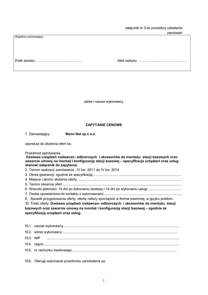 załącznik nr 3 do procedury udzielania zamówień Wypełnia zamawiający Znak sprawy………………………………….. data wpływu ……………..……………………. adres i nazwa wykonawcy ZAPYTANIE CENOWE 1. Zamawiający: Mann Net sp z o.o. zaprasza do złożenia ofert na: Przedmiot zamówienia Dostawa urządzeń nadawczo- odbiorczych i akcesoriów do montażu stacji bazowych oraz zawarcie umowy na montaż i konfigurację stacji bazowej – specyfikacja urządzeń oraz usług stanowi załącznik do zapytania. 2. Termin realizacji zamówienia : IV kw. 2011 do IV kw. 2014 3. Okres gwarancji: zgodnie ze specyfikacją ............................................................................................ 4. Miejsce i termin złożenia oferty ............................................................................................................ 5. Termin otwarcia ofert ........................................................................................................................... 6. Warunki płatności: 14 dni po dokonaniu dostawy i 14 dni po wykonaniu usługi ................................... 7. Osoba upoważniona do kontaktu z wykonawcami.................................................................................. 9. Sposób przygotowania oferty: ofertę należy sporządzić w formie pisemnej, w języku polskim. 10. Treść oferty: Dostawa urządzeń nadawczo- odbiorczych i akcesoriów do montażu stacji bazowych oraz zawarcie umowy na montaż i konfigurację stacji bazowej – zgodnie ze specyfikacją urządzeń oraz usług. 10.1. nazwa wykonawcy ........................................................................................................................ 10.2. adres wykonawcy ....................................................................................................................... 10.3. NIP ......................................................................................................................................... 10.4. regon ............................................................................................................................................. 10.5. nr rachunku bankowego ............................................................................................................ 10.6. Oferuję wykonanie przedmiotu zamówienia za: 1 a). sprzęt: Cenę netto ......................................... zł (słownie złotych .................................................................... ...........................................................................................) Cenę brutto ......................................... zł (słownie złotych ................................................................... ............................................................. ) b) usługę: Cenę netto ......................................... zł (słownie złotych .................................................................... ...........................................................................................) Cenę brutto ......................................... zł (słownie złotych ................................................................... ............................................................. ) 10.7. Oświadczam, że zapoznałem się z opisem przedmiotu zamówienia i nie wnoszę do niego zastrzeżeń 10.8. Termin realizacji zamówienia ................................................................................ 10.9.Okres gwarancji ...................................................................................................... 10.10. Potwierdzam termin realizacji zamówienia do dnia ............................................. 10.11. Wyrażam zgodę na warunki płatności określone w zapytaniu cenowym. dnia........................... podpis wykonawcy lub osoby upoważnionej pieczątka wykonawcy 2 Załącznik 1 . Specyfikacja urządzeń i usług od zapytania cenowego Kategoria : Zakup urządzeń stacji bazowej (maszty i urządzenia teletechniczne) II. Maszt antenowy stalowy,(uchwyty do masztu, uchwyty do muru, inne akcesoria) maszt stalowy długości 3 m, grubości przynajmniej 50 mm, grubościenna, 3 x uchwyty antenowe w kształcie litery L o długości 50cm odchodzące od masztu o 50 cm, uchwyt kominowy 2 warianty: 1. obejma kominowa z pasem 1 stalowym, 2. Obejma murowa z podporą, odciągi stalowe Puszka hermetyczna(na RB lub RB+UPS) z wyjściami zasilającymi oraz antenowymi. Puszka hermetyczna o wymiarach min. 2 400x500x300 Karta radiowa mPCI, moc od 200mW do 500mW, wysoka 3 czułość karty ok.. -94/6Mbps, karta nadaje w standardzie a/n 4 5 6 7 Wtyki Nm, na kabel cnt 400 przeznaczony do pracy w częstotliwościach do 6 Ghz, proste lub kątowe. Kabel CNT-400, wysokiej klasy przewód przeznaczony do pracy w częstotliwościach do 6 Ghz charakteryzujący się niskim współczynnikiem tłumienia ok. 20 dB na 100 metrów przewodu, posiadający wysoką odporność na złe warunki atmosferyczne Antena dookólna 5 GHz, 10 dBi, antena o zysku energetycznym 10dBi pracująca w paśmie częstotliwości 5180-5700 MHz, stosowana polaryzacja pionowa o kącie promieniowania w płaszczyźnie pionowej 10 stopni oraz w płaszczyźnie poziomej 360 stopni. Antena sektorowa 5GHz 16dBi, 120 stopni + zestaw montażowy, zewnętrzna antena sektorowa o zysku energetycznym 16dBi pracująca w pasmie częstotliwości 54505750 MHz, stosowana polaryzacja pionowa o kącie promieniowania w płaszczyźnie pionowej max. 10 stopni oraz w płaszczyźnie poziomej 120 stopni. Mocowania umożliwiają pochylanie anteny w dwóch płaszczyznach. Antena wykonana z wysokiej klasy materiałów odpornych na złe warunki atmosferyczne, pokrytych materiałem odpornych na UV. ilość Jedn. 49 szt 49 szt 294 szt 588 szt 2058 m 49 szt 147 szt 3 Cena netto Wartość netto Okres obsługi Okres pogwarancyj gwarancji nej uwagi 8 Antena siatkowa pracująca w paśmie 5 Ghz, o zysku en