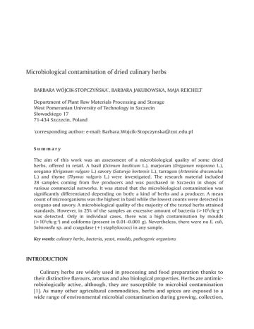 Microbiological contamination of dried culinary herbs BARBARA WÓJCIK-STOPCZYŃSKA*, BARBARA JAKUBOWSKA, MAJA REICHELT Department of Plant Raw Materials Processing and Storage West Pomeranian University of Technology in Szczecin Słowackiego 17 71-434 Szczecin, Poland corresponding author: e-mail: [email protected] * Summary The aim of this work was an assessment of a microbiological quality of some dried herbs, offered in retail. A basil (Ocimum basilicum L.), marjoram (Origanum majorana L.), oregano (Origanum vulgare L.) savory (Satureja hortensis L.), tarragon (Artemisia dracunculus L.) and thyme (Thymus vulgaris L.) were investigated. The research material included 28 samples coming from five producers and was purchased in Szczecin in shops of various commercial networks. It was stated that the microbiological contamination was significantly differentiated depending on both: a kind of herbs and a producer. A mean count of microorganisms was the highest in basil while the lowest counts were detected in oregano and savory. A microbiological quality of the majority of the tested herbs attained standards. However, in 25% of the samples an excessive amount of bacteria (>105cfu∙g-1) was detected. Only in individual cases, there was a high contamination by moulds (>103cfu∙g-1) and coliforms (present in 0.01–0.001 g). Nevertheless, there were no E. coli, Salmonella sp. and coagulase (+) staphylococci in any sample. Key words: culinary herbs, bacteria, yeast, moulds, pathogenic organisms INTRODUCTION Culinary herbs are widely used in processing and food preparation thanks to their distinctive flavours, aromas and also biological properties. Herbs are antimicrobiologically active, although, they are susceptible to microbial contamination [1]. As many other agricultural commodities, herbs and spices are exposed to a wide range of environmental microbial contamination during growing, collection, Microbiological contamination of dried culinary herbs 207 processing and distribution [2]. Drying of herbs after harvest, especially by traditional methods, is considered as a “critical point” and exposes them to the risk of contamination. Therefore, dried herbs may contain high levels of different groups of microorganisms [3-5] including pathogenic bacteria [6, 7] and toxigenic fungi [8, 9]. The control of current biological quality of herbs is needed. The risk to health is possible, especially when added to “ready to eat” food that undergo no further processing. Considering little current information on the microbiological quality of offered culinary herbs, the objective of this study was to investigate microbiological condition of dried herbs purchased in the market. MATERIALS AND METHODS The researches included following dried culinary herbs: basil (Ocimum basilicum L.), marjoram (Origanum majorana L.), oregano (Origanum vulgare L.), savory (Satureja hortensis L.), tarragon (Artemisia dracunculus L.) and thyme (Thymus vulgaris L.). Twenty eight samples of herbs from five producers, were purchased in Szczecin in shops of various commercial nets. Microbiological analysis was carried out in accordance with recommendations of Polish standards [10, 12-16]. The valuation was made on parameters as follows: total count of mesophilic aerobic bacteria and their spores [10], total count of termophilic aerobic bacteria and their spores [11], count of yeasts and moulds [12], titre of coliforms [13] and presence of Escherichia coli (in 1 g) [14], Salmonella sp. (in 25 g) [15] and coagulase positive staphylococci (in 0.1 g) [16]. Additionally moulds occurring in tested herbs were isolated and identified. Identification was carried out by cultural and morphological characteristics and the taxonomic schemes [17-19] were applied. The investigations were carried out in three replications. The counts of bacteria and fungi were expressed as colony forming units per gram of sample (cfu∙g-1) and converted onto log10cfu∙g-1. The data were statistically examined by analysis of variance and differences between means were evaluate using the Tukey test at a significance level α=0.05. RESULTS AND DISCUSSION The contamination of the tested herbs by aerobic mesophilic and termophilic bacteria is presented in table 1. Total counts of mesophilic bacteria ranged from 2.12 log cfu∙g-1 in oregano from the 3rd producer, to 6.19 logcfu∙g-1 in marjoram from the 1st producer. Total counts of termophilic bacteria oscillated from 1.76 to 5.18 log cfu∙g-1 in savory and basil from the 4th producer, respectively. The highest mean count of bacteria was detected in basil, while the lowest contamination was in oregano and savory. Considerable variations were observed in the number of bacteria even in the samples of the same kind of herbs. It was stated that the Vol. 55 No 3 2009 B. Wójcik-Stopczyńska, B. Jakubowska, M. Reichelt 208 bacterial contamination was significantly differentiated depending both on kind of herbs and producer. Significant differences in the microbial counts among spices and commercial companies were found also by Elshafie et al. [20]. Ta b l e 1 . Total counts of mesophilic and termophilic aerobic bacteria (log cfu∙g ) in culinary herbs from different producers -1 culinary herbs producer 1 2 3 4 5 mean mesophilic aerobic bacteria basil 4.96aD 4.85aB 5.20bD 5.84dD 5.43cF 5.26C marjoram 6.19eE 4.89dB 4.15bC 4.32cC 2.57aB 4.42B oregano 3.75dB 3.34cA 2.77aA 3.13bB 4.38eE 3.48A savory 4.63 -* 3.95 2.12 3.69 bC 3.60A tarragon cC - bB 3.45bA 5.21cD 5.42dE 2.95aA 4.26B 5.55 4.13 4.17 4.10 4.21B thyme 3.11 mean 4.53c basil 4.74cD 3.77aB marjoram 4.93 4.48 oregano 2.13aA 2.23abA 2.35bA savory 4.22 - 2.26 aA aA cC 4.42c bC 4.24b bC bD 4.16b 3.86a 4.95dD 5.18eD 4.52bD 4.62D 3.87 3.96 2.11 aA 3.87C 2.98cB 3.25dC 2.58A 1.76 3.42 cC 2.91A termophilic aerobic bacteria tarragon dD dC - thyme 3.13 mean 3.83d aB cD bB bA bC aA 2.33aA 4.32dC 3.83cC 2.91bB 3.35B 4.21 4.10 3.64 3.26 3.67BC cC 3.40b cBC 3.64cd bC 3.56b