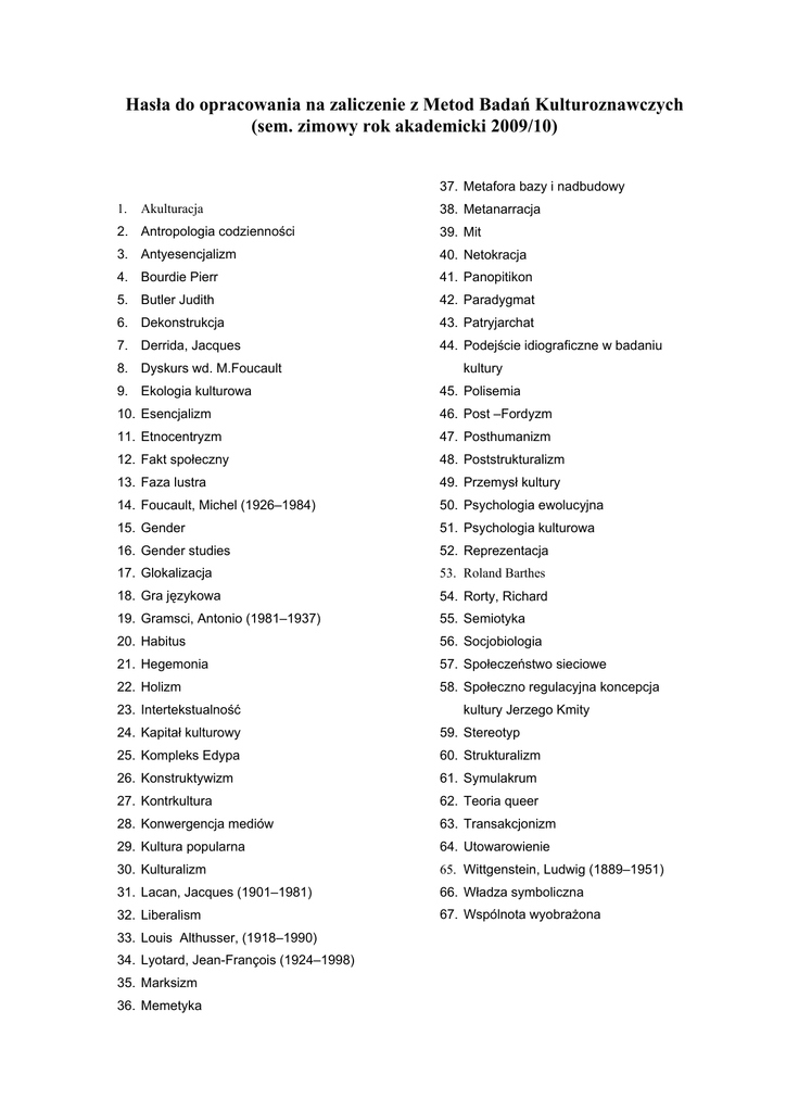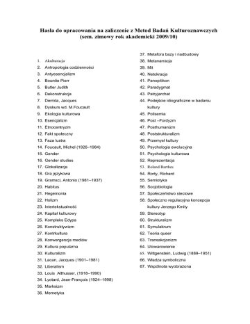 Hasła do opracowania na zaliczenie z Metod Badań Kulturoznawczych (sem. zimowy rok akademicki 2009/10) 37. Metafora bazy i nadbudowy 1. Akulturacja 38. Metanarracja 2. Antropologia codzienności 39. Mit 3. Antyesencjalizm 40. Netokracja 4. Bourdie Pierr 41. Panopitikon 5. Butler Judith 42. Paradygmat 6. Dekonstrukcja 43. Patryjarchat 7. Derrida, Jacques 44. Podejście idiograficzne w badaniu 8. Dyskurs wd. M.Foucault kultury 9. Ekologia kulturowa 45. Polisemia 10. Esencjalizm 46. Post –Fordyzm 11. Etnocentryzm 47. Posthumanizm 12. Fakt społeczny 48. Poststrukturalizm 13. Faza lustra 49. Przemysł kultury 14. Foucault, Michel (1926–1984) 50. Psychologia ewolucyjna 15. Gender 51. Psychologia kulturowa 16. Gender studies 52. Reprezentacja 17. Glokalizacja 53. Roland Barthes 18. Gra językowa 54. Rorty, Richard 19. Gramsci, Antonio (1981–1937) 55. Semiotyka 20. Habitus 56. Socjobiologia 21. Hegemonia 57. Społeczeństwo sieciowe 22. Holizm 58. Społeczno regulacyjna koncepcja 23. Intertekstualność kultury Jerzego Kmity 24. Kapitał kulturowy 59. Stereotyp 25. Kompleks Edypa 60. Strukturalizm 26. Konstruktywizm 61. Symulakrum 27. Kontrkultura 62. Teoria queer 28. Konwergencja mediów 63. Transakcjonizm 29. Kultura popularna 64. Utowarowienie 30. Kulturalizm 65. Wittgenstein, Ludwig (1889–1951) 31. Lacan, Jacques (1901–1981) 66. Władza symboliczna 32. Liberalism 67. Wspólnota wyobrażona 33. Louis Althusser, (1918–1990) 34. Lyotard, Jean-François (1924–1998) 35. Marksizm 36. Memetyka