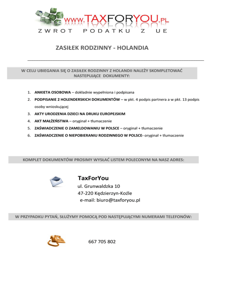 ZASIŁEK RODZINNY - HOLANDIA __________________________________________________________________________ W CELU UBIEGANIA SIĘ O ZASIŁEK RODZINNY Z HOLANDII NALEŻY SKOMPLETOWAĆ NASTEPUJĄCE DOKUMENTY: 1. ANKIETA OSOBOWA – dokładnie wypełniona i podpisana 2. PODPISANIE 2 HOLENDERSKICH DOKUMENTÓW – w pkt. 4 podpis partnera a w pkt. 13 podpis osoby wnioskującej 3. AKTY URODZENIA DZIECI NA DRUKU EUROPEJSKIM 4. AKT MAŁŻEŃSTWA – oryginał + tłumaczenie 5. ZAŚWIADCZENIE O ZAMELDOWANIU W POLSCE – oryginał + tłumaczenie 6. ZAŚWIADCZENIE O NIEPOBIERANIU RODZINNEGO W POLSCE- oryginał + tłumaczenie KOMPLET DOKUMENTÓW PROSIMY WYSŁAĆ LISTEM POLECONYM NA NASZ ADRES: TaxForYou ul. Grunwaldzka 10 47-220 Kędzierzyn-Koźle e-mail: [email protected] W PRZYPADKU PYTAŃ, SŁUŻYMY POMOCĄ POD NASTĘPUJĄCYMI NUMERAMI TELEFONÓW: 667 705 802 ZASIŁEK RODZINNY - HOLANDIA Dane klienta: 1. SOFI NR : Nazwisko Imiona ________________________ data urodzenia _____________________ ________________________ telefon w PL __________________ Miejscowość ________________________ tel.kom.w PL ______________________ Ulica, nr ________________________ email: _________________ Numer pesel: __________________________ 2. Dane współmałżonka/partnera: SOFI NR : ____________/ nie posiada (zaznaczyć wlaściwe) Nazwisko ________________________ data urodzenia ______________________ Nazwisko panieńskie____________________ Imiona ________________________ data ślubu __________________ Numer pesel: ________________________ Małżonka /partner (wypełnij właściwe): a) jest zatrudniona: ______________________________________________________ (nazwa zakładu pracy oraz adres) ______________________________________________________ B) nie pracuje 3. Dane dzieci: imie i nazwisko dziecka data urodzenia numer pesel 1) .................................... ........................... ……………………………………. 2) ................................... ........................... ……………………………………. 3) ................................... ........................... ……………………………………. 4) ................................... ........................... ……………………………………. 4. Konto bankowe do zwrotu zasiłku rodzinnego (wybierz właściwe): a) rachunek bankowy w Polsce: Numer rachunku bankowego: Bank (nazwa/miejscowość) : Kod SWIFT lub BIC : ____________________________________________ ____________________________________________ Nazwisko właściciela rachunku: ___________________________________________ (proszę podać nazwisko zgodnie z pisownia w chwili otwarcia rachunku) b) rachunek bankowy w Holandii: ______________________________________ nazwisko właściciela rachunku bankowego: _______________________________ 5. Przebieg pracy w Holandii: Nazwa firmy Miejscowość, Kod pocztowy Ulica, numer Zatrudniony w okresie od dnia - do dnia Aktualnie posiadam umowę/kontrakt o pracę w Holandii do dnia: _________________ Pracował/am/em w Holandii w ciągu ostatnich 12 m-cy TAK / NIE Pracował/am/em w Holandii w ciągu ostatnich 5 lat TAK / NIE Przebieg pracy partnera/partnerki w Holandii: Pracował/a w ciągu ostatnich 12 m-cy w Polsce/ w Holandii TAK / NIE Pracowała w ciągu ostatnich 5 lat w Polsce/ w Holandii TAK / NIE 6. Otrzymuję zasiłek rodzinny w Polsce (dołączyć kopię decyzji) a) nie, nie otrzymuję zasiłku rodzinnego, b) tak, ja mam przyznany zasiłek rodzinny od dnia : _______ do dnia: _________ w kwocie: ____________ złotych miesięcznie, c)tak, moja małżonka/partner ma przyznany zasiłek rodzinny od dnia: ____________ do dnia: _____________ w kwocie: _________ złotych miesięcznie. 7. Data przyjazdu do Holandii: ………………………………………………. 8. Jak często utrzymywany jest kontakt z dzieckiem i w jaki sposób? …………………………………………………… 9. Do Holandii przyjechał/am/em: a) autobusem b) samochodem własnym c)inne………………………………… Upoważniam biuro TaxForYou i jego partnerow w Holandii do prowadzenia czynności związanych z zasiłkiem rodzinnym wypłacanym przez holenderski Urząd SVB. Miejscowość i data …………………………………………………………………………… podpis klienta: ………………………………………………………………………………….