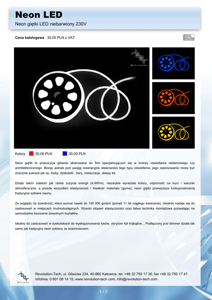 Neon LED Neon giętki LED niebarwiony 230V Cena katalogowa 30,00 PLN z VAT Kolory 30,00 PLN 30,00 PLN Neon giętki to propozycja głównie skierowana do firm specjalizujących się w branży oświetlania reklamowego czy architektonicznego. Biorąc jednak pod uwagę rewelacyjne właściwości tego typu oświetlenia, jego zastosowanie może być znacznie szersze jak np. kluby, dyskoteki , bary, restauracje, sklepy itd. Dzięki takim zaletom jak niskie zużycie energii (4,4W/m), niezwykle wyraziste kolory, odporność na kurz i warunki atmosferyczne, a przede wszystkim elastyczność i trwałość materiału (guma), neon giętki przewyższa funkcjonalnością tradycyjne szklane neony. Ze względu na żywotność, która wynosi nawet do 100 000 godzin (ponad 11 lat ciągłego świecenia), idealnie nadaje się do zastosowań w miejscach trudnodostępnych. Wysoki stopień elastyczności oraz łatwa technika montażowa pozwalając na samodzielne tworzenie dowolnych kształtów. Idealny do zastosowań w dyskotekach do wyeksponowania łuków, obrysów kół trójkątów... Podłączony pod dimmer działa tak samo jak tradycyjny neon szklany ze ściemniaczem. Revolution-Tech, ul. Gliwicka 234, 40-860 Katowice, tel. +48 32 750 17 30, fax +48 32 750 17 41 Infolinia: 0 801 08 14 15, www.revolution-tech.com, [email protected] 1/2 Specyfikacje Ilość diod LED na metr 80 szt Dystans cięcia 100 cm Maksymalna długość odcinka 50 m Średni czas życia diody 100 000 godz. Wodoszczelność tak Współczynnik ochrony IP IP65 Obudowa PCV Jednostka sprzedaży metry Wymiary 100,0 / 1,5 / 2,5 cm Waga 0,5 kg Waga brutto (z opakowaniem) 0,5 kg Napięcie Prąd Natężenie Pobór mocy Temperatura barwowa CW R A Y G B 230 V 230 V 230 V 230 V 230 V 230 V AC AC AC AC AC AC 0,022 A 0,026 A 0,025 A 0,027 A 0,017 A 0,022 A 5,1 W 6W 5,7 W 6,2 W 3,9 W 5,1 W 6 500 K Produkty wymagane Konektor do neonu 230V Akcesoria Łącznik do neonu typ I Łącznik do neonu typ L Łącznik do neonu typ T Do łączenia dwóch odcinków neonu pod kątem 180°. Do łączenia dwóch odcinków neonu pod kątem 90°. Do łączenia trzech odcinków neonu pod kątem 90°. Revolution-Tech, ul. Gliwicka 234, 40-860 Katowice, tel. +48 32 750 17 30, fax +48 32 750 17 41 Infolinia: 0 801 08 14 15, www.revolution-tech.com, [email protected] 2/2