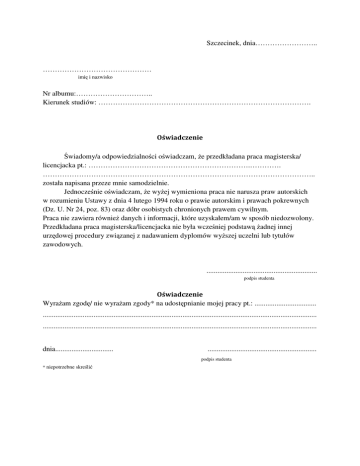 Szczecinek, dnia…………………….. ……………………………………… imię i nazwisko Nr albumu:………………………….. Kierunek studiów: ……………………………………………………………………………. Oświadczenie Świadomy/a odpowiedzialności oświadczam, że przedkładana praca magisterska/ licencjacka pt.: ………………………………………………………….…………. ………………………………………………………………………………………………….. została napisana przeze mnie samodzielnie. Jednocześnie oświadczam, że wyżej wymieniona praca nie narusza praw autorskich w rozumieniu Ustawy z dnia 4 lutego 1994 roku o prawie autorskim i prawach pokrewnych (Dz. U. Nr 24, poz. 83) oraz dóbr osobistych chronionych prawem cywilnym. Praca nie zawiera również danych i informacji, które uzyskałem/am w sposób niedozwolony. Przedkładana praca magisterska/licencjacka nie była wcześniej podstawą żadnej innej urzędowej procedury związanej z nadawaniem dyplomów wyższej uczelni lub tytułów zawodowych. ............................................................. podpis studenta Oświadczenie Wyrażam zgodę/ nie wyrażam zgody* na udostępnianie mojej pracy pt.: .................................. ....................................................................................................................................................... ....................................................................................................................................................... dnia................................ ............................................................ podpis studenta * niepotrzebne skreślić