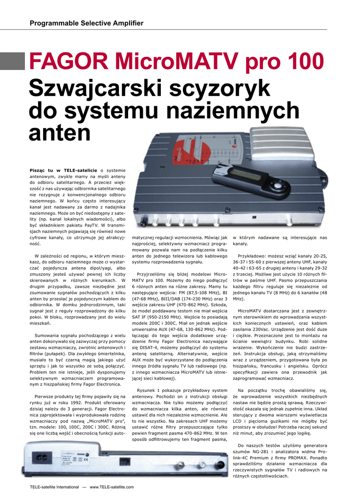Programmable Selective Amplifier FAGOR MicroMATV pro 100 Szwajcarski scyzoryk do systemu naziemnych anten Pisząc tu w TELE-satelicie o systemie antenowym, zwykle mamy na myśli anteny do odbioru satelitarnego. A przecież większość z nas używając odbiornika satelitarnego nie rezygnuje z konwencjonalnego odbioru naziemnego. W końcu często interesujący kanał jest nadawany za darmo z nadajnika naziemnego. Może on być niedostępny z satelity (np. kanał lokalnych wiadomości), albo być składnikiem pakietu PayTV. W transmisjach naziemnych pojawiają się również nowe cyfrowe kanały, co utrzymuje jej atrakcyjność. W zależności od regionu, w którym mieszkasz, do odbioru naziemnego może ci wystarczać pojedyncza antena dipol/yagi, albo zmuszony jesteś używać pewnej ich liczby skierowanych w różnych kierunkach. W drugim przypadku, zawsze niezbędne jest zsumowanie sygnałów pochodzących z kilku anten by przesłać je pojedynczym kablem do odbiornika. W domku jednorodzinnym, taki sygnał jest z reguły rozprowadzony do kilku pokoi. W bloku, rozprowadzany jest do wielu mieszkań. Sumowania sygnału pochodzącego z wielu anten dokonywało się zazwyczaj przy pomocy zestawu wzmacniaczy, zwrotnic antenowych i filtrów (pułapek). Dla zwykłego śmiertelnika, musiało to być czarną magią jakiego użyć sprzętu i jak to wszystko ze sobą połączyć. Problem ten nie istnieje, jeśli dysponujemy selektywnym wzmacniaczem programowanym z hiszpańskiej firmy Fagor Electronica. Pierwsze produkty tej firmy pojawiły się na rynku już w roku 1992. Produkt oferowany dzisiaj należy do 3 generacji. Fagor Electronica zaprojektowała i wyprodukowała rodzinę wzmacniaczy pod nazwą „MicroMATV pro”, tzn. modele: 100, 100C, 200C i 300C. Różnią się one liczbą wejść i obecnością funkcji auto- matycznej regulacji wzmocnienia. Mówiąc jak najprościej, selektywny wzmacniacz programowany pozwala nam na podłączenie kilku anten do jednego telewizora lub kablowego systemu rozprowadzenia sygnału. Przyjrzeliśmy się bliżej modelowi MicroMATV pro 100. Możemy do niego podłączyć 6 różnych anten na różne zakresy. Mamy tu następujące wejścia: FM (87,5-108 MHz), BI (47-68 MHz), BIII/DAB (174-230 MHz) oraz 3 wejścia zakresu UHF (470-862 MHz). Szkoda, że model poddawany testom nie miał wejścia SAT IF (950-2150 MHz). Wejście to posiadają modele 200C i 300C. Miał on jednak wejście uniwersalne AUX (47-68, 130-862 MHz). Podłączając do tego wejścia dodatkowe urządzenie firmy Fagor Electronica nazywające się DISAT-4, możemy podłączyć do systemu antenę satelitarną. Alternatywnie, wejście AUX może być wykorzystane do podłączenia innego źródła sygnału TV lub radiowego (np. z innego wzmacniacza MicroMATV lub istniejącej sieci kablowej). Rysunek 1 pokazuje przykładowy system antenowy. Pochodzi on z instrukcji obsługi wzmacniacza. Nie tylko możemy podłączyć do wzmacniacza kilka anten, ale również ustawić dla nich niezależnie wzmocnienie. Ale to nie wszystko. Na zakresach UHF możemy ustawić różne filtry przepuszczające tylko pewien fragment pasma 470-862 MHz. W ten sposób odfiltrowujemy ten fragment pasma, w którym nadawane są interesujące nas kanały. Przykładowo: możesz wziąć kanały 20-25, 36-37 i 55-60 z pierwszej anteny UHF, kanały 40-42 i 63-65 z drugiej anteny i kanały 29-32 z trzeciej. Możliwe jest użycie 10 różnych filtrów w paśmie UHF. Pasmo przepuszczania każdego filtru reguluje się niezależnie od jednego kanału TV (8 MHz) do 6 kanałów (48 MHz). MicroMATV dostarczana jest z zewnętrznym sterownikiem do wprowadzania wszystkich koniecznych ustawień, oraz kablem zasilania 230Vac. Urządzenie jest dość duże i ciężkie. Przeznaczone jest to montażu na ścianie wewnątrz budynku. Robi solidne wrażenie. Wykończenie nie budzi zastrzeżeń. Instrukcja obsługi, jaką otrzymaliśmy wraz z urządzeniem, przygotowana była po hiszpańsku, francusku i angielsku. Oprócz specyfikacji zawiera ona przewodnik jak zaprogramować wzmacniacz. Na początku trochę obawialiśmy się, że wprowadzenie wszystkich niezbędnych nastaw nie będzie prostą sprawą. Rzeczywistość okazała się jednak zupełnie inna. Układ sterujący z dwoma wierszami wyświetlacza LCD i pięcioma guzikami nie mógłby być prostszy w obsłudze! Potrzeba raczej sekund niż minut, aby zrozumieć jego logikę. Do naszych testów użyliśmy generatora szumów NG-281 i analizatora widma Prolink-4C Premium z firmy PROMAX. Ponadto sprawdziliśmy działanie wzmacniacza dla rzeczywistych sygnałów TV i radiowych na różnych częstotliwościach. TELE-satellite International — www.TELE-satellite.com Zaczęliśmy od wejścia FM. Jak widzicie na rysunku 2, charakterystyka amplitudowa filtru jest praktycznie doskonała. Nierównomierności w paśmie przenoszenia praktycznie nie ma, a nachylenie zboczy jest bardzo strome – 25dB/8MHz. Filtr pokrywa dokładnie 87,5-108 MHz. (Rysunek 2). Wzmocnienie można regulować w 25 krokach. Według specyfikacji zakres regulacji powinien wynosić 25 dB. Zmierzyliśmy, że w rzeczywistości jest on nieco większy – 28dB. Jeden krok to z grubsza 1 dB. Różnica między specyfikacją a rzeczywistym zakresem regulacji była jeszcze większa dla pasma BI (47-68 MHz). Zamiast 25 dB rzeczywisty zakres wyniósł 35 dB. Zatem, w tym przypadku mieliśmy mniej więcej 1,5 - 1,7 dB na krok. Wprawdzie w praktyce większy zakres i ziarno regulacji nie powinno stanowić żadnego problemu, jest to jedna odchyłka od opublikowanej specyfikacji. Charakterystyka częstotliwości dla tego wejścia była równie doskonała jak dla poprzedniego. Nachylenie zboczy filtru wyniosło ok. 20dB/ 8MHz. (Rysunek 3). zboczy 10dB/8MHz już nie tak dobre jak dla poprzednich wejść. Zanim rozpoczęliśmy z pasmem UHF, szybko sprawdziliśmy szerokopasmowe wejście AUX (47-68, 130-862 MHz). Płaskość charakterystyki częstotliwościowej przyj