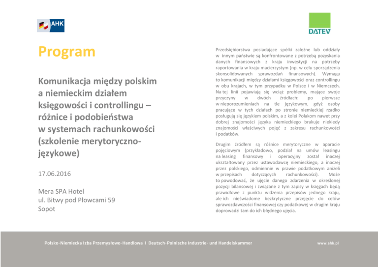 Program Komunikacja między polskim a niemieckim działem księgowości i controllingu – różnice i podobieństwa w systemach rachunkowości (szkolenie merytorycznojęzykowe) 17.06.2016 Mera SPA Hotel ul. Bitwy pod Płowcami 59 Sopot Przedsiębiorstwa posiadające spółki zależne lub oddziały w innym państwie są konfrontowane z potrzebą pozyskania danych finansowych z kraju inwestycji na potrzeby raportowania w kraju macierzystym (np. w celu sporządzenia skonsolidowanych sprawozdań finansowych). Wymaga to komunikacji między działami księgowości oraz controllingu w obu krajach, w tym przypadku w Polsce i w Niemczech. Na tej linii pojawiają się wciąż problemy, mające swoje przyczyny w dwóch źródłach: po pierwsze w nieporozumieniach na tle językowym, gdyż osoby pracujące w tych działach po stronie niemieckiej rzadko posługują się językiem polskim, a z kolei Polakom nawet przy dobrej znajomości języka niemieckiego brakuje niekiedy znajomości właściwych pojęć z zakresu rachunkowości i podatków. Drugim źródłem są różnice merytoryczne w aparacie pojęciowym (przykładowo, podział na umów leasingu na leasing finansowy i operacyjny został inaczej ukształtowany przez ustawodawcę niemieckiego, a inaczej przez polskiego, odmiennie w prawie podatkowym aniżeli w przepisach dotyczących rachunkowości). Może to powodować, że ujęcie danego zdarzenia w określonej pozycji bilansowej i związane z tym zapisy w księgach będą prawidłowe z punktu widzenia przepisów jednego kraju, ale ich nieświadome bezkrytyczne przejęcie do celów sprawozdawczości finansowej czy podatkowej w drugim kraju doprowadzi tam do ich błędnego ujęcia. Lunch: 12:30 – 13:30 + dwie krótkie przerwy 1. Porównanie polskich i niemieckich zasad rachunkowości, ze szczególnym wskazaniem na różnice 2. Części składowe niemieckiego sprawozdania finansowego jednostki 3. Omówienie pod względem językowym oraz merytorycznym struktury i poszczególnych pozycji niemieckiego bilansu oraz rachunku zysków i strat oraz porównanie z polskimi odpowiednikami: a) majątek trwały (wartości niematerialne, majątek rzeczowy, majątek finansowy) - zasady wyceny składników majątkowych - metody amortyzacji - aktualizacja wartości b) majątek obrotowy (zapasy, należności, papiery wartościowe) - zasady wyceny składników majątkowych - aktualizacja wartości c) rozliczenia międzyokresowe - zasady tworzenia - rozgraniczenie między rozliczeniami między-okresowymi a rezerwami/zobowiązaniami d) kapitały własne - ustrukturyzowanie pozycji kapitału własnego w bilansach obu krajów - nieekwiwalentość pojęć Kapitalrücklage i Gewinnrücklage w stosunku do pojęć kapitał rezerwowy i zapasowy e) rezerwy i zobowiązania - odmienna typologia rezerw w obu krajach - kazus rezerw na grożące straty z transakcji f) struktura przychodów i kosztów - moment wykazywania przychodu i kosztu - wykazywanie zysków z kontraktów długoterminowych - ujmowanie umów leasingowych 4. Plany kont a) porównanie niemieckiego planu kont SKR 04 z planami kont popularnymi w Polsce b) przyporządkowanie poszczególnych kont polskich do ich niemieckich ekwiwalentów Trener Marcin Grześkowiak jest polskim doradcą podatkowym (nr wpisu 11419), absolwentem ekonomii Uniwersytetu Europejskiego Viadrina we Frankfurcie nad Odrą, gdzie następnie pracował jako asystent na katedrze Rachunkowości i Opodatkowania Przedsiębiorstw. Praktyczne doświadczenie zawodowe w doradztwie podatkowym zdobywał, pracując dla niemieckiej spółdzielni doradców podatkowych DATEV z Norymbergi oraz w międzynarodowej spółce doradztwa podatkowego TPA Horwath Sztuba Kaczmarek w Warszawie. Obecnie prowadzi własną kancelarię, specjalizując się w problematyce międzynarodowego prawa podatkowego. Jest współautorem polskich i niemieckich książek oraz artykułów o tematyce związanej z prawem podatkowym oraz zarządzaniem kancelarią doradcy podatkowego. DATEV profesjonalny zespół ludzi posiadających wiedzę i doświadczenie na rynku rozwiązań informatycznych dla doradców podatkowych, biegłych rewidentów i biur rachunkowych bezpieczeństwo prawne wynikające ze ścisłej współpracy ze środowiskiem biegłych rewidentów i doradców podatkowych bezpieczeństwo inwestycji, potencjał właścicieli daje pewność, że nasze produkty będą stale rozwijane tak, aby sprostać zmieniającym się wymogom prawnym i technologicznym oraz nowym wyzwaniom rynkowym kompleksowa oferta, ściśle dopasowana do specyficznych wymagań naszych klientów Jeśli są jakieś specyficzne zagadnienia, które Państwa interesują, to prosimy o przesłanie informacji na ten temat na adres: [email protected] – z przyjemnością uwzględnimy wskazane zagadnienia podczas szkolenia.