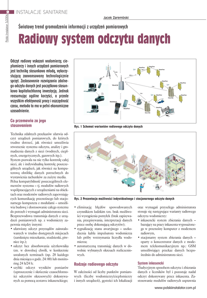 Polski Instalator 5/2006 2 INSTALACJE SANITARNE Jacek Zarembski Œwiatowy trend gromadzenia informacji z urz¹dzeñ pomiarowych Radiowy system odczytu danych Odczyt radiowy wskazañ wodomierzy, ciep³omierzy i innych urz¹dzeñ pomiarowych jest technik¹ stosunkowo m³od¹, wykorzystuj¹c¹ zaawansowany technologicznie sprzêt. Zastosowanie rozwi¹zania zdalnego odczytu danych jest pocz¹tkowo stosunkowo kapita³och³onn¹ inwestycj¹. Jednak reasumuj¹c ogólne korzyœci, a przede wszystkim efektywnoœæ pracy i oszczêdnoœæ czasu, metoda ta ma w pe³ni ekonomiczne uzasadnienie. Co przemawia za jego stosowaniem Technika zdalnych przekazów u³atwia odczyt urz¹dzeñ pomiarowych, do których trudno dotrzeæ, jak równie¿ umo¿liwia stworzenie systemu odczytu, analizy i gromadzenia danych z sieci (wodnych, cieplnych, energetycznych, gazowych itp.). System pozwala na nie tylko kontrolê ca³ej sieci, ale i indywidualn¹ kontrolê poszczególnych urz¹dzeñ, jak równie¿ na komputerow¹ obróbkê danych potrzebnych do wystawienia rachunków za zu¿yte media. Pe³na kompatybilnoœæ poszczególnych elementów systemu – tj. modu³ów radiowych wspó³pracuj¹cych z urz¹dzeniami na obiektach oraz modemów radiowych zapewniaj¹cych komunikacjê przenoœnego lub stacjonarnego komputera z modu³ami – umo¿liwia budowê i dostosowanie ca³ego systemu do potrzeb i wymagañ administratora sieci. Bezprzewodowa transmisja danych z urz¹dzeñ pomiarowych np. z wodomierzy zapewnia miêdzy innymi: • u³atwiony odczyt przyrz¹dów zainstalowanych w trudno dostêpnych miejscach (zamkniête mieszkanie, studzienki, piwnice itp.); • odczyt bez absorbowania u¿ytkownika tzn. w dowolnej chwili, w konkretnie ustalonych terminach (np. 28 ka¿dego dnia miesi¹ca o godz. 24: 00) lub monitoring 24 h/24 h; • szybki odczyt wyników pomiarów (uproszczenie i skrócenie czasoch³onnoœci odczytów okresowych) dokonywanych za pomoc¹ zestawu inkasenckiego; Rys. 1 Schemat wariantów radiowego odczytu danych Rys. 2 Prezentacja mo¿liwoœci indywidualnego i stacjonarnego odczytu danych • eliminacjê b³êdów spowodowanych czynnikiem ludzkim tzn. brak mo¿liwoœci wyst¹pienia pomy³ek (brak zapisywania, przepisywania, interpretacji danych przez osobê dokonuj¹c¹ odczytów); • sygnalizacjê stanu awaryjnego – uszkodzenia kabla impulsatora wodomierza lub próby wstrzymania liczyd³a wodomierza; • automatyczn¹ transmisjê danych w dowolnie wybranych okresach rozliczeniowych. oraz wymagañ przysz³ego administratora stosuje siê nastêpuj¹ce warianty radiowego odczytu wodomierzy: • inkasencki system zbierania danych – bazuj¹cy na pracy inkasenta wyposa¿onego w przenoœny komputer z modemem radiowym, • stacjonarny system zbierania danych – oparty o koncentrator danych z modemem telekomunikacyjnym np.: GSM umo¿liwiaj¹cy przekaz danych bezpoœrednio do administratora sieci. Rodzaje radiowego odczytu System inkasencki Tradycyjnym sposobem odczytu i zbierania danych z liczników by³ i pozostaje nadal odczyt dokonywany przez inkasenta. Zastosowanie modu³ów radiowych usprawnia W zale¿noœci od liczby punktów pomiarowych (liczby wodomierzy/ciep³omierzy i innych urz¹dzeñ), gêstoœci ich lokalizacji www.polskiinstalator.com.pl Reklama 06/00126 i przyœpiesza odczyty oraz uniezale¿nia pracê inkasenta od obecnoœci u¿ytkownika lub administratora urz¹dzenia. Modu³y radiowe umo¿liwiaj¹ nie tylko transmisje radiow¹, ale dziêki wewnêtrznemu rejestratorowi prowadz¹ te¿ wstêpn¹ selekcjê danych np.: odczyty raz na dobê, rejestracjê stanów alarmowych (namagnesowanie wodomierza w celu zak³ócenia jego prac, czy inn¹ ingerencjê w pracê uk³adu). Zestaw inkasencki sk³ada siê z: 1. modu³ów pod³¹czanych do urz¹dzeñ pomiarowych na obiektach, 2. komputera przenoœnego wyposa¿onego w modem radiowy, 3. oprogramowania umo¿liwiaj¹cego komunikacjê radiow¹ pomiêdzy modemem a modu³ami oraz zapisywanie danych w pamiêci komputera przenoœnego, 4. oprogramowania oraz kabla umo¿liwiaj¹cego przesy³ danych zapisanych w przenoœnym komputerze do PC lub innego centrum rozrachunkowego. Odczyty inkasenckie mog¹ byæ wykonywane w dwojaki sposób: • sekwencyjnie – licznik po liczniku (np. inkasent przechodzi obok ka¿dej posesji, wêz³a pomiarowego); • grupowo – dla wielu liczników znajduj¹cych siê w pobli¿u (inkasent wybiera odpowiedni¹ lokalizacjê do odczytu i uruchamia stosowny program). Odczyt trwa kilku sekund i wykonywany jest niezale¿nie od obecnoœci w³aœciciela domu czy mieszkania, a co istotne nie wymaga bezpoœredniego kontaktu z urz¹dzeniem pomiarowym. [email protected] System stacjonarny W przypadku instalacji z rozproszonymi punktami pomiarowymi np. oddalone od siebie budynki mieszkalne, czy znajduj¹ce siê na peryferiach miast osiedla, gdzie inkasent traci wiele czasu na przemieszczanie siê pomiêdzy punktami pomiarowymi – lepiej sprawdza siê stacjonarny system zbierania danych. Mo¿emy wyró¿niæ jego nastêpuj¹ce elementy, które pozwalaj¹ zrealizowaæ dowoln¹ konfiguracjê systemu: • modu³y pod³¹czane do urz¹dzeñ pomiarowych na obiektach, • wzmacniacze sygna³u i/lub mini-koncentratory, • koncentrator z modemem telekomunikacyjnym GSM. Koncentrator z modemem GSM jest urz¹dzeniem zbieraj¹cym i gromadz¹cym dane z modu³ów radiowych w zale¿noœci od zasiêgu: bezpoœrednio lub poprzez wzmacniacze, czy te¿ mini-koncentratory. Zgromadzone dane w formie „paczki danych” przekazywane s¹ SMS-em lub GPRS-em bezpoœrednio do centrali administratora sieci. Wszystkie elementy sieci s¹ kompatybilne pomiêdzy sob¹ i w przypadku problemów z sieci¹ GSM mog¹ byæ odczytane zestawem inkasenckim lub za poœrednictwem innych elementów systemu. Ka¿dy system mo¿na poprzez ró¿ne opcje dopasowaæ do charakteru, wymagañ i potrzeb przysz³ego u¿ytkownika – administratora sieci. Korzyœci ekonomiczne, niezawodnoœæ i wygoda wynika