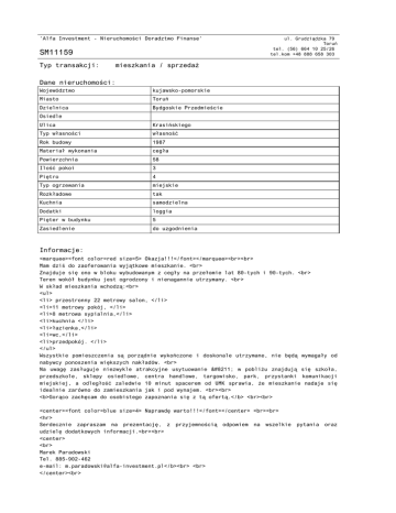 'Alfa Investment - Nieruchomości Doradztwo Finanse' SM11159 Typ transakcji: ul. Grudziądzka 79 Toruń tel. (56) 664 10 25/26 tel.kom +48 888 658 303 mieszkania / sprzedaż Dane nieruchomości: Województwo kujawsko-pomorskie Miasto Toruń Dzielnica Bydgoskie Przedmieście Osiedle Ulica Krasińskiego Typ własności własność Rok budowy 1987 Materiał wykonania cegła Powierzchnia 58 Ilość pokoi 3 Piętro 4 Typ ogrzewania miejskie Rozkładowe tak Kuchnia samodzielna Dodatki loggia Pięter w budynku 5 Zasiedlenie do uzgodnienia Informacje: <marquee><font color=red size=5> Okazja!!!</font></marquee><br><br> Mam dziś do zaoferowania wyjątkowe mieszkanie. <br> Znajduje się ono w bloku wybudowanym z cegły na przełomie lat 80-tych i 90-tych. <br> Teren wokół budynku jest ogrodzony i nienagannie utrzymany. <br> W skład mieszkania wchodzą:<br> <ul> <li> przestronny 22 metrowy salon, </li> <li>11 metrowy pokój, </li> <li>8 metrowa sypialnia,</li> <li>kuchnia </li> <li>łazienka,</li> <li>wc,</li> <li>przedpokój. </li> </ul> Wszystkie pomieszczenia są porządnie wykończone i doskonale utrzymane, nie będą wymagały od nabywcy ponoszenia większych nakładów. <br> Na uwagę zasługuje niezwykle atrakcyjne usytuowanie – w pobliżu znajdują się szkoła, przedszkole, sklepy osiedlowe, centra handlowe, targowisko, park, przystanki komunikacji miejskiej, a odległość zaledwie 10 minut spacerem od UMK sprawia, że mieszkanie nadaje się idealnie zarówno do zamieszkania jak i pod wynajem. <br><br> <b>Gorąco zachęcam do osobistego zapoznania się z tą ofertą.</b> <br><br> <center><font color=blue size=4> Naprawdę warto!!!</font></center> <br><br> <hr> Serdecznie zapraszam na prezentację, z przyjemnością odpowiem na wszelkie udzielę dodatkowych informacji.<br><br> <center> <br> Marek Paradowski Tel. 885-902-462 e-mail: [email protected]</b><br> <br> </center><br> pytania oraz <hr> <marquee direction="left" scrollamount="2" scrolldelay="1" onmouseover="this.stop()" onmouseout="this.start()"><b><font color="red">Bezpieczeństwo usługi gwarantuje licencjonowany pośrednik w obrocie nieruchomościami:</font></marquee></b></br><br> Pośrednik odpowiedzialny zawodowo:<br> Paweł Dawidowicz, licencja pośrednika w obrocie nieruchomościami 7432<br> Andrzej Pamin, licencja pośrednika w obrocie nieruchomościami 1145<br><br> <b>UWAGA!!! </b><br> BEZPŁATNIE POMAGAMY W UZYSKANIU KREDYTU NA ZAKUP NIERUCHOMOŚCI.<br> WSPÓŁPRACUJEMY Z WIELOMA BANKAMI. <br><br> Treść niniejszego ogłoszenia nie stanowi oferty handlowej w rozumieniu przepisów Kodeksu Cywilnego.<br><br> Więcej ofert na stronie <a href="http://www.alfa-investment.pl/nieruchomoscitorun/">Alfa-Investment </a><br><br> <b>ZAPRASZAM!</b> Cena: 250 000 PLN Dokument wygenerowany ze strony www.alfa-investment.pl Strona 2