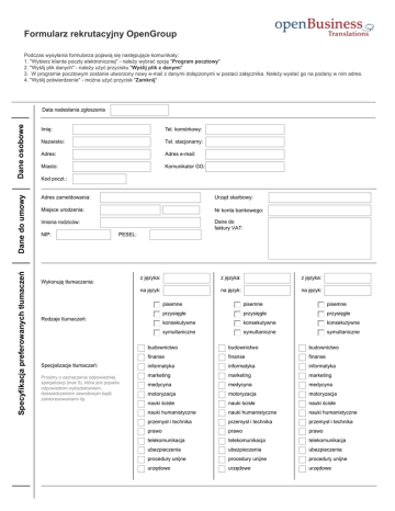 Formularz rekrutacyjny OpenGroup Podczas wysyłania formularza pojawią się następujące komunikaty: 1. "Wybierz klienta poczty elektronicznej" - należy wybrać opcję "Program pocztowy" 2. "Wyślij plik danych" - należy użyć przycisku "Wyślij plik z danymi" 3. W programie pocztowym zostanie utworzony nowy e-mail z danymi dołączonymi w postaci załącznika. Należy wysłać go na podany w nim adres. 4. "Wyślij potwierdzenie" - można użyć przycisk "Zamknij" Specyfikacja preferowanych tłumaczeń Dane do umowy Dane osobowe Data nadesłania zgłoszenia Imię: Tel. komórkowy: Nazwisko: Tel. stacjonarny: Adres: Adres e-mail: Miasto: Komunikator GG: Kod poczt.: Adres zameldowania: Urząd skarbowy: Miejsce urodzenia: Nr konta bankowego: Imiona rodziców: Dane do faktury VAT: NIP: PESEL: Wykonuję tłumaczenia: z języka: z języka: z języka: na język: na język: na język: Rodzaje tlumaczeń: Specjalizacje tłumaczeń: Prosimy o zaznaczenie odpowiedniej specjalizacji (max 5), która jest poparta odpowiednim wykształceniem, doświadczeniem zawodowym bądź zainteresowaniami itp. pisemne pisemne pisemne przysięgłe przysięgłe przysięgłe konsekutywne konsekutywne konsekutywne symultaniczne symultaniczne symultaniczne budownictwo budownictwo budownictwo finanse finanse finanse informatyka informatyka informatyka marketing marketing marketing medycyna medycyna medycyna motoryzacja motoryzacja motoryzacja nauki ścisłe nauki ścisłe nauki ścisłe nauki humanistyczne nauki humanistyczne nauki humanistyczne przemysł i technika przemysł i technika przemysł i technika prawo prawo prawo telekomunikacja telekomunikacja telekomunikacja ubezpieczenia ubezpieczenia ubezpieczenia procedury unijne procedury unijne procedury unijne urzędowe urzędowe urzędowe Doświadczenie Wynagrodzenie Pozostałe informacje Wykształcenie: Moce przerobowe: Posiadane certyfikaty: Dyspozycyjność: stron na jeden dzień Rok ustanowienia tł. przysięgłym: Rodzaj tłumaczeń,jezyki,dziedziny: Firmy dla których tłumaczono: brutto (rach./fa. VAT) netto brutto (umowa o dzieło) Za stronę tekstu 1800 znaków ze spacjami: zł Za stronę korekty tekstu 1800 znaków ze spacjami: zł Za tłumaczenie przysięgłe 1125 znaków: zł Potwierdzenie tłumaczenia przysięgłego 1125 znaków: zł Tłumaczenie ustne konsekutywne za 1h: zł Tłumaczenie ustne symultaniczne za 1h: zł Znajomość oprogramowania biurowego: MS Word MS Excel MS Outlook Korzystanie z programów do tłumaczeń: Trados Wordfast Deja-Vu Stały dostęp do internetu: Tak Nie Inne informacje Wyrażam zgodę na przetwarzanie moich danych osobowych w celu realizacji procesu rekrutacji (zgodnie z ustawą z dn. 29.08.1997r. o ochronie danych osobowych, Dz. U. Nr 133, poz. 883 z póź. zm.) Dokument elektronicznej wymiany danych zaprojektowane przez Graphicsite GROUP - www.graphicsite.pl �W�y�[�l�i�j�