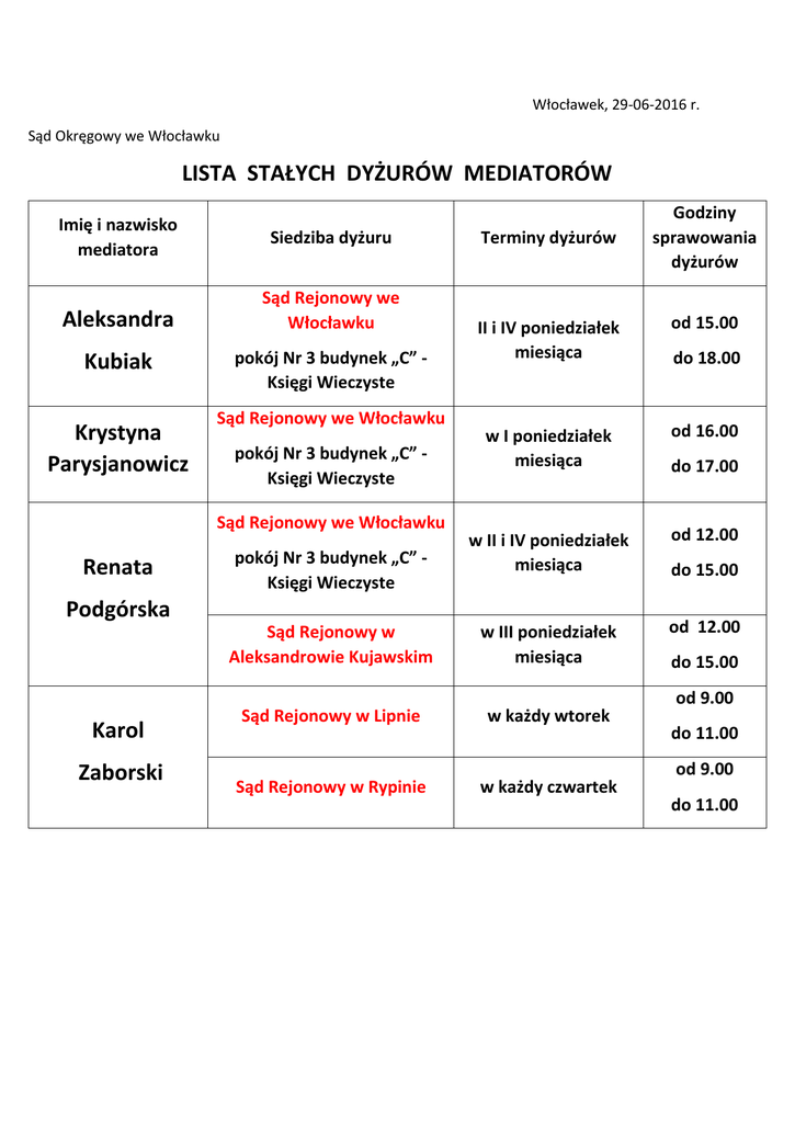 Włocławek, 29-06-2016 r. Sąd Okręgowy we Włocławku LISTA STAŁYCH DYŻURÓW MEDIATORÓW Imię i nazwisko mediatora Siedziba dyżuru Aleksandra Sąd Rejonowy we Włocławku Kubiak pokój Nr 3 budynek „C” Księgi Wieczyste Krystyna Parysjanowicz Sąd Rejonowy we Włocławku pokój Nr 3 budynek „C” Księgi Wieczyste Sąd Rejonowy we Włocławku Renata pokój Nr 3 budynek „C” Księgi Wieczyste Terminy dyżurów II i IV poniedziałek miesiąca od 15.00 w I poniedziałek miesiąca od 16.00 w II i IV poniedziałek miesiąca od 12.00 w III poniedziałek miesiąca od 12.00 Podgórska Sąd Rejonowy w Aleksandrowie Kujawskim Karol Zaborski Godziny sprawowania dyżurów Sąd Rejonowy w Lipnie w każdy wtorek Sąd Rejonowy w Rypinie w każdy czwartek do 18.00 do 17.00 do 15.00 do 15.00 od 9.00 do 11.00 od 9.00 do 11.00