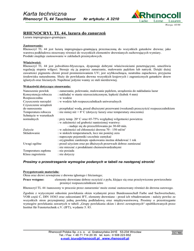 Karta techniczna Rhenocryl TL 44 Tauchlasur Nr artykułu: A 3210 Wersja: 05/98 RHENOCRYL TL 44, lazura do zanurzeń Lazura impregnująco-gruntująca. Zastosowanie: Rhenocryl TL 44 jest lazurą impregnująco-gruntującą przeznaczoną do wszystkich gatunków drewna; jako warstwa podkładowa stosowany również do wszystkich elementów drewnianych zachowujących wymiary. Produkt znajduje zastosowanie w zakładach przemysłowych. Właściwości: Rhenocryl TL 44 jest jedwabisto-błyszcząca, dysponuje dobrymi właściwościami penetrującymi, umożliwia regulację stopnia wilgoci. Stosuje się ją poprzez zanurzanie, malowanie pędzlem lub natrysk. Dzięki dużej zawartości pigmentu chroni przed promieniowaniem UV; jest szybkoschnąca, neutralna zapachowo, przyjazna środowisku naturalnemu. Służy do powlekania drewna wszystkich krajowych i zagranicznych gatunków drzew iglastych oraz liściastych. Napełniać jedynie wanny ze stali nierdzewnej. Wskazówki dotyczące stosowania: Nanoszenie powłok Konsystencja robocza Rozpuszczalna Czyszczenie narzędzi Czyszczenie urządzeń do nanoszenia Temperatura robocza Schnięcie w warunkach normalnych Zużycie Składowanie Uwagi ogólne Temperatura zapłonu Klasa zagrożenia : zanurzanie, polewanie, malowanie pędzlem, urządzenia do nakładania lazur : nakładać w stanie nierozcieńczonym, lepkość (kubek 4 mm) : w wodzie : w wodzie lub rozpuszczalnikach uniwersalnych : przepłukać wodą, przed dłuższymi przerwami (weekend) przeczyścić rozpuszczalnikiem : nie mniej niż + 8o C (dotyczy lazury oraz temperatury otoczenia) : przy temp. 20o C oraz 65-75% względnej wilgotności powietrza : w zależności od grubości naniesionej warstwy: - nadaje się do przeszlifowania po 30-60 min. : w zależności od chłonności drewna 70 - 150 ml/m2 : w niskich temperaturach, lecz nie poniżej zera : napoczęte pojemniki szczelnie zamykać : oryginalnie zamknięte opakowania można składować 1 rok : przed użyciem oraz po dłuższych przerwach dobrze zamieszać : nie mieszać z produktami chemoutwardzalnymi : nie posiada : nie dotyczy Prosimy o przestrzeganie wymogów podanych w tabeli na następnej stronie! Przygotowanie materiału: Okna oraz drzwi zewnętrzne z drewna iglastego i liściastego; Prace wstępne: elementy drewniane dobrze oczyścić z pyłu, klejące się oraz przeżywiczone powierzchnie przemyć rozpuszczalnikiem nitro Rhenocryl TL 44 /nanoszony w procesie przez zanurzenie/ może zostać zastosowany również do drewna surowego. Zgodnie z wytycznymi odnośnie powlekania okien wydanymi przez Bundesausschuß Farbe und Sachwertschutz, VOB część C, DIN 18363 oraz zaleceniami IFT, elementy drewniane - przed ich wbudowaniem - należy powlec ze wszystkich stron przynajmniej jedną powłoką podkładową oraz międzywarstwową. Prosimy o przestrzeganie wymogów powlekania zawartych w tabeli „Grupy powlekania okien i drzwi zewnętrznych“ opublikowanych przez Institut für Fenstertechnik e.V. (IFT), wydanie 5. 83. Rhenocoll Polska Sp. z o. o. ul. Grabiszyńska 241E 53-234 Wrocław Tel. / Fax: + 48 71 714 20 35 tel. kom.: 0 508 223 852 e-mail: [email protected] www.rhenocoll.pl ISO 9001 Karta techniczna Rhenocryl TL 44 Tauchlasur Nr artykułu: A 3210 Wersja: 05/98 Obciążenie Klimat zewnętrzny, pośrednie działanie warunków atm. Klimat zewnętrzny, bezpośrednie działanie warunków atmosferycznych Klimat zewnętrzny, przy silnym, bezpośrednim działaniu warunków atmosferycznych 1 Odcień bez ograniczeń 2 3 jasny średni 4 5 6 ciemny jasny średni 7 ciemny Opracowanie przemysłowe 1 x Rhenocryl TL 44 lazura do zanurzeń 1 x Rhenocryl DSL 88 Grupa naniesienia IFT C 1 I-III E 1 x Rhenocryl TL 44 lazura do zanurzeń 1 x Rhenocryl DSL 88 C 2-4 II-III E 1 x Rhenocryl TL 44 lazura do zanurzeń 2 x Rhenocryl DSL 88 C 5-7 II-III E Wskazówki dotyczące bezpieczeństwa: Pojemniki przechowywać szczelnie zamknięte, w miejscu niedostępnym dla dzieci. Unikać kontaktu z oczami. W razie kontaktu przemyć oczy dokładnie wodą. Przy pracy z lakierami zawierającymi niewielkie ilości substancji szkodliwych należy również zachować zwykłe środki ochronne. Opakowania: 25 L Usuwanie opadów: Nieutwardzone bądź niewyschnięte resztki produktu należy zutylizować jako odpad specjalny zgodnie z obowiązującym kodem. Powyższa procedura odnosi się również do utwardzonych oraz wyschniętych pozostałości produktu. Puste opakowania poddać recyklingowi. Ekologia: Klasa zagrożenia dla wód powierzchniowych: 1 Nie dopuszczać do kontaktu z wodami gruntowymi, ściekami bądź gruntem. Serwis: Nasz serwis techniczny jest o każdej porze niezobowiązująco do Państwa dyspozycji; Tel./Fax: Tel. kom.: E-Mail: + 48 71 714 20 35 0 508 223 853 [email protected] Niniejsze dane są niezobowiązujące, opierają się na praktycznych doświadczeniach, jak również na przeprowadzonych u nas próbach oraz są niewiążące w myśl najnowszej jurysdykcji kodeksu cywilnego. Ze względu na różnorodność czynników, na które nie mamy wpływu, zalecamy w każdym przypadku przeprowadzenie własnych prób. Dane odbiegające od tych zawartych w kartach technicznych wymagają pisemnego potwierdzenia placówki w Mannheim‘ie. W każdym przypadku obowiązują nasze ogólne warunki handlowe. Z chwilą ukazania się niniejszej instrukcji wszystkie wcześniejsze wydania tracą swoją ważność. Rhenocoll Polska Sp. z o. o. ul. Grabiszyńska 241E 53-234 Wrocław Tel. / Fax: + 48 71 714 20 35 tel. kom.: 0 508 223 852 e-mail: [email protected] www.rhenocoll.pl ISO 9001