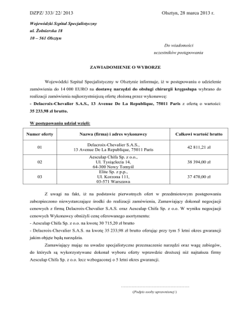 DZPZ/ 333/ 22/ 2013 Olsztyn, 28 marca 2013 r. Wojewódzki Szpital Specjalistyczny ul. śołnierska 18 10 – 561 Olsztyn Do wiadomości uczestników postępowania ZAWIADOMIENIE O WYBORZE Wojewódzki Szpital Specjalistyczny w Olsztynie informuje, iŜ w postępowaniu o udzielenie zamówienia do 14 000 EURO na dostawę narzędzi do obsługi chirurgii kręgosłupa wybrano do realizacji zamówienia najkorzystniejszą ofertę złoŜoną przez wykonawcę: - Delacroix-Chevalier S.A.S., 13 Avenue De La Republique, 75011 Paris z ofertą o wartości: 35 233,98 zł brutto. W postępowaniu udział wzięli: Numer oferty Nazwa (firma) i adres wykonawcy Całkowi wartość brutto 01 Delacroix-Chevalier S.A.S., 13 Avenue De La Republique, 75011 Paris 42 811,21 zł Aesculap Chifa Sp. z o.o., Ul. Tysiąclecia 14, 64-300 Nowy Tomyśl Elite Sp. z p.p., Ul. Korzona 111, 03-571 Warszawa 02 03 38 394,00 zł 37 470,00 zł Z uwagi na fakt, iŜ na podstawie pierwotnych ofert w przedmiotowym postępowaniu zabezpieczono niewystarczające środki do realizacji zamówienia, Zamawiający dokonał negocjacji cenowych z firmą Delacroix-Chevalier S.A.S. oraz Aesculap Chifa Sp. z o.o. W wyniku negocjacji cenowych Wykonawcy obniŜyli cenę oferowanego asortymentu: - Aesculap Chifa Sp. z o.o. na kwotę 30 715,20 zł brutto - Delacroix-Chevalier S.A.S. na kwotę 35 233,98 zł brutto oferując przy tym 5 letni okres gwarancji jakim objęte będą narzędzia. Zamawiający mając na uwadze specjalistyczne przeznaczenie narzędzi oraz wagę zabiegów, do których są wykorzystywane dokonał wyboru oferty wprawdzie droŜszej niŜ najtańsza firmy Aesculap Chifa Sp. z o.o. lecz wzbogaconej o 5 letni okres gwarancji. ……………………………………………… (Podpis osoby uprawnionej )