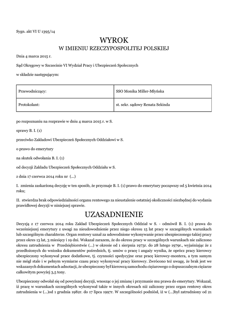 Sygn. akt VI U 1395/14 WYROK W IMIENIU RZECZYPOSPOLITEJ POLSKIEJ Dnia 4 marca 2015 r. Sąd Okręgowy w Szczecinie VI Wydział Pracy i Ubezpieczeń Społecznych w składzie następującym: Przewodniczący: SSO Monika Miller-Młyńska Protokolant: st. sekr. sądowy Renata Sekinda po rozpoznaniu na rozprawie w dniu 4 marca 2015 r. w S. sprawy B. I. (1) przeciwko Zakładowi Ubezpieczeń Społecznych Oddziałowi w S. o prawo do emerytury na skutek odwołania B. I. (1) od decyzji Zakładu Ubezpieczeń Społecznych Oddziału w S. z dnia 17 czerwca 2014 roku nr (...) I. zmienia zaskarżoną decyzję w ten sposób, że przyznaje B. I. (1) prawo do emerytury począwszy od 5 kwietnia 2014 roku; II. stwierdza brak odpowiedzialności organu rentowego za nieustalenie ostatniej okoliczności niezbędnej do wydania prawidłowej decyzji w niniejszej sprawie. UZASADNIENIE Decyzją z 17 czerwca 2014 roku Zakład Ubezpieczeń Społecznych Oddział w S. - odmówił B. I. (1) prawa do wcześniejszej emerytury z uwagi na nieudowodnienie przez niego okresu 15 lat pracy w szczególnych warunkach lub szczególnym charakterze. Organ rentowy uznał za udowodnione wykonywanie przez ubezpieczonego takiej pracy przez okres 13 lat, 3 miesięcy i 19 dni. Wskazał zarazem, że do okresu pracy w szczególnych warunkach nie zaliczono okresu zatrudnienia w Przedsiębiorstwie (...) w okresie od 1 sierpnia 1973r. do 28 lutego 1979r., wyjaśniając że z przedłożonych do wniosku dokumentów pośrednich, tj. umów o pracę i angaży wynika, że oprócz pracy kierowcy ubezpieczony wykonywał prace dodatkowe, tj. czynności spedycyjne oraz pracę kierowcy-montera, a tym samym nie mógł stale i w pełnym wymiarze czasu pracy wykonywać pracy kierowcy. Zwrócono też uwagę, że brak jest we wskazanych dokumentach adnotacji, że ubezpieczony był kierowcą samochodu ciężarowego o dopuszczalnym ciężarze całkowitym powyżej 3,5 tony. Ubezpieczony odwołał się od powyższej decyzji, wnosząc o jej zmianę i przyznanie mu prawa do emerytury. Wskazał, iż pracę w warunkach szczególnych wykonywał także w innych okresach niż zaliczony przez organ rentowy okres zatrudnienia w (...)od 1 grudnia 1982r. do 17 lipca 1997r. W szczególności podniósł, iż w (...)był zatrudniony od 21 maja 1979r., a w dniu 30 kwietnia 1980r. ukończył kurs spawacza elektrycznego, po czym przez cały czas wykonywał pracę jako spawacz elektryczny i gazowy. Odnośnie pracy w przedsiębiorstwie (...)wskazał, że od czasu podjęcia pracy po powrocie z zasadniczej służby wojskowej, tj. od dnia 4 maja 1976r., pracował tam jaki kierowca samochodu ciężarowego o dopuszczalnym ciężarze całkowitym powyżej 3,5 tony. Podkreślił ponadto, że w okresie od 24 kwietnia 1974r. do 14 kwietnia 1976r. pełnił zasadniczą służbę wojskową w (...)na stanowisku kierowcy kompanii remontowobudowlanej, kierując pojazdami ciężarowymi, powyżej 3,5 tony. W odpowiedzi na odwołanie organ rentowy wniósł o jego oddalenie w całości, podtrzymując argumentację wyrażoną w zaskarżonej decyzji. Sąd ustalił następujący stan faktyczny: B. I. (1) urodził się (...). Wniosek o wcześniejszą emeryturę złożył w organie rentowym w dniu 29 kwietnia 2014 roku. Na dzień 1 stycznia 1999 roku legitymował się udowodnionym okresem składkowym i nieskładkowym wynoszącym ogółem 25 lat. Okoliczności niesporne, a nadto dowody – dokumenty w aktach ZUS O/S. dot. B. I.. Począwszy od 1 sierpnia 1973r. B. I. podjął pracę w Przedsiębiorstwie (...). Początkowo został zatrudniony jako ślusarz na wydziale produkcji i taką pracę faktycznie wykonywał. Dowody: - dokumenty w aktach osobowych B. I. z okresu zatrudnienia w (...) – k. 22 akt sprawy; - świadectwo pracy – k. 38, plik KPU akt ZUS O/S.dot. B. I.. W dniu 24 kwietnia 1974r. B. I.został powołany do odbycia zasadniczej służby wojskowej. Rozkazem dowódcy brygady (...)otrzymał przydział służbowy na stanowisko kierowcy w (...). Służbę w tym miejscu i w tym charakterze pełnił nieprzerwanie do 14 kwietnia 1976r. Dowody: - kserokopia książeczki wojskowej B. I.– k. 15-21 pliku KPU akt ZUS O/S.; - zaświadczenie (...) w S. z 29.01.2014r. – k. 6 akt sprawy. Po zakończeniu odbywania zasadniczej służby wojskowej, B. I. powrócił do pracy w przedsiębiorstwie (...). Z dniem 4 maja 1976r. zawarto z nim tam nową umowę o pracę, na mocy której powierzono mu pracę kierowcy samochodu ciężarowego w dziale transportu przedsiębiorstwa, w pełnym wymiarze czasu pracy. Ubezpieczony wykonywał pracę na tym stanowisku i w tym dziale stale i nieprzerwanie do 13 lutego 1977r. Z dniem 14 lutego 1977r. B. I. został przeniesiony do pracy jako kierowca-monter w wydziale instalacyjno-montażowym, z angażem jako kierowca-monter. W tym wydziale pracował do dnia 5 stycznia 1979r., kiedy to został na dwa tygodnie, do 20 stycznia 1979r., z uwagi na warunki atmosferyczne przeniesiony do pracy w wydziale produkcji, a następnie powrócił do pracy na poprzednim stanowisku. Pracę tę wykonywał do 28 lutego 1979r. Praca ubezpieczonego w czasie, gdy był pracownikiem wydziału transportu i praca w wydziale instalacyjnomontażowym różniły się tylko rodzajami powierzonych ubezpieczonemu zadań. W drugim okresie zadaniem B. I. była obsługa brygady monterów, którzy pracowali na prowadzonych przez przedsiębiorstwo budowach ferm. B. I. jeździł wtedy samochodem ciężarowym marki S., powyżej 3,5 tony i dowoził im na teren budowy potrzebne do montażu materiały, w tym w szczególności długie pręty metalowe o długości do ośmiu metrów. Do jego zadań należało także wożenie produkowanych przez przedsiębiorstwo elementów do ocynkowania, a następnie ich odbiór już po ocynkowaniu oraz rozwiezienie na teren budów. Budowy, na które jeździł B. I.znajdowały się na terenie całego województwa. Dowody: - dokumenty w aktach osobowych B. I. z okresu zatrudnienia w przedsiębiors