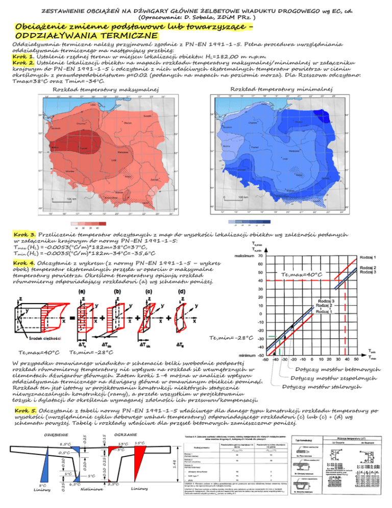 ZESTAWIENIE OBCIĄŻEŃ NA DŹWIGARY GŁÓWNE ŻELBETOWE WIADUKTU DROGOWEGO wg EC, cd. (Opracowanie: D. Sobala, ZDiM PRz. ) Obciążenie zmienne podstawowe lub towarzyszące ODDZIAŁYWANIA TERMICZNE Oddziaływania termiczne należy przyjmować zgodnie z PN-EN 1991-1-5. Pełna procedura uwzględniania oddziaływania termicznego ma następujący przebieg: Krok 1. Ustalenie rzędnej terenu w miejscu lokalizacji obiektu: HL=182,00 m n.p.m. Krok 2. Ustalenie lokalizacji obiektu na mapach rozkładu temperatury maksymalnej/minimalnej w załączniku krajowym do PN-EN 1991-1-5 i odczytanie z nich właściwych ekstremalnych temperatur powietrza w cieniu określonych z prawdopodobieństwem p=0.02 (podanych na mapach na poziomie morza). Dla Rzeszowa odczytano: Tmax=38 C oraz Tmin=-34 C. Rozkład temperatury minimalnej Rozkład temperatury maksymalnej Krok 3. Przeliczenie temperatur odczytanych z map do wysokości lokalizacji obiektu wg zależności podanych w załączniku krajowym do normy PN-EN 1991-1-5: Tmax (HL) =-0.0053( C/m)*182m+38 C=37 C, Tmin (HL) =-0.0035( C/m)*182m-34 C=-35,6 C Krok 4. Odczytanie z wykresu (z normy PN-EN 1991-1-5 – wykres obok) temperatur ekstremalnych przęsła w oparciu o maksymalne temperatury powietrza. Określone temperatury opisują rozkład równomierny odpowiadający rozkładowi (a) wg schematu poniżej. Te,max=40°C Te,min=-28°C Te,min=-28°C Te,max=40°C W przypadku omawianego wiaduktu o schemacie belki swobodnie podpartej rozkład równomierny temperatury nie wpływa na rozkład sił wewnętrznych w elementach dźwigarów głównych. Zatem kroki 1-4 można w analizie wpływu oddziaływania termicznego na dźwigary główne w omawianym obiekcie pominąć. Rozkład ten jest istotny w projektowaniu konstrukcji niektórych statycznie niewyznaczalnych konstrukcji (ramy), a przede wszystkim w projektowaniu łożysk i dylatacji do określenia wymaganej zdolności ich przesuwu/kompensacji. Dotyczy mostów betonowych Dotyczy mostów zespolonych Dotyczy mostów stalowych 6,5 C 15 C 1C 0.10 0.25 0.20 0.20 0.25 8 C Liniowy 13 C 3C 0,5 C 1 C OGRZANIE Nieliniowe 1.48 8,5 C 0.25 OZIĘBIENIE 0.15 Krok 5. Odczytanie z tabeli normy PN-EN 1991-1-5 właściwego dla danego typu konstrukcji rozkładu temperatury po wysokości (uwzględnienie cyklu dobowego wahań temperatury) odpowiadającego rozkładowi (c) lub (c) + (d) wg schematu powyżej. Tabelę i rozkłady właściwe dla przęseł betonowych zamieszczono poniżej. 2,5 C Liniowy Krok 6. Wyznaczony rozkład temperatury po wysokości został określony przy założeniu grubości nawierzchni równej 50mm (dla rozkładów liniowych) lub 50 i 100mm (dla rozkładów nieliniowych). W przypadku innej grubości nawierzchni należy zgodnie z tablicą 6.2 (dla rozkładów liniowych) lub załącznikiem B do PN-EN 1991-1-5 (dla rozkładów nieliniowych) wprowadzić odpowiednią korektę wartości temperatur w rozkładzie określonym w kroku 5. W tabeli obok podano odpowiednie wartości współczynników korygujących dla rozkładów liniowych w zależności od grubości nawierzchni. W omawianym wiadukcie przyjęto nawierzchnię o grubości 95mm i izolację o grubości ok. 5mm. Zatem wymagane jest wprowadzenie korekty do rozkładu liniowego po wysokości przy ogrzaniu powierzchni górnej. Zamiast wartości 15 C należy przyjąć 0.7*15 C=10.5 C. Krok 7. W oparciu o normową temperaturę „spięcia” konstrukcji przęsła (tzn. zmiany schematu statycznego w taki sposób, że oddziaływania termiczne powodują powstanie sił wewnętrznych) o wartości dla Polski T0=8 C lub rzeczywistą temperaturę „spięcia” konstrukcji należy wyznaczyć przyrost/redukcję temperatury elementu TN,con i TN,exp odpowiedzialne odpowiednio za skrócenie i wydłużenie przęsła. Te, min s T0 TN,con Te,max TN,exp s TN Maksymalne rozwarcie (dla urządzeń dylatacyjnych) lub całkowity przesuw (dla łożysk) W przypadku omawianego wiaduktu zmiany temperatury dźwigarów głównych względem normowej temperatury początkowej wynoszą: TN,con = T0 – Te,min = 8 C + 28 C = 36 C TN,exp = Te,max- T0 = 40 C - 8 C = 32 C Krok 8. Następnie w oparciu o wyznaczone wartości należy ustalić kombinację poszczególnych składowych oddziaływania termicznego (jeśli takie działanie jednoczesne ma znaczenie dla wyznaczanej wartości). Kombinacje jednoczesnego działania rozkładu równomiernego oraz liniowo zmiennego na wysokości przekroju mają postać: TM,heat (lub TM,cool) + N TN,exp (lub TN,con), gdzie zalecaną wartością dla współczynnika N jest 0.35 lub TM,cool) + TN,exp (lub TN,con), gdzie zalecaną wartością dla współczynnika M jest 0.75. M TM,heat (lub Kombinacje składowych oddziaływań termicznych należy uwzględnić jako jedno oddziaływanie i przyłożyć do konstrukcji w postaci różnicy temperatury na długości/wysokości przekroju lub w postaci wymuszonych odkształceń wstępnych (w zależności od stosowanych metod obliczeniowych i oprogramowania). W przypadku omawianego wiaduktu kombinacje rozkładów nie mają zastosowania ze względu na schemat statyczny. Do dalszych analiz należy wykorzystać jedynie rozkład temperatury po wysokości przekroju. Uwaga! W przypadku projektowania konstrukcji o innym okresie użytkowania (np.. Tymczasowych) konieczne może być wprowadzenie do opisanej procedury Kroku 2a, w którym, przy użyciu wykresu z załącznika krajowego (patrz obok) można temperatury odczytane z mapy (podane dla prawdopodobieństwa 0.02, okres powrotu 50 lat) przeliczyć na temperatury o dowolnym okresie powrotu/prawdopodobieństwa p. Przez wartość założonego prawdopodobieństwa (np. p=0.1) należy na wykresie poprowadzić linię poziomą (linia zielona) do przecięcia z liniami wykresu dla temperatur maksymalnych i minimalnych. Od przecięcia linii poziomej z liniami na wykresie należy poprowadzić linie pionowe (czerwone), które przetną oś poziomą wskazując wartość stosunku Tmax,p/Tmax=0.91 lub Tmin,p/Tmin=0.77