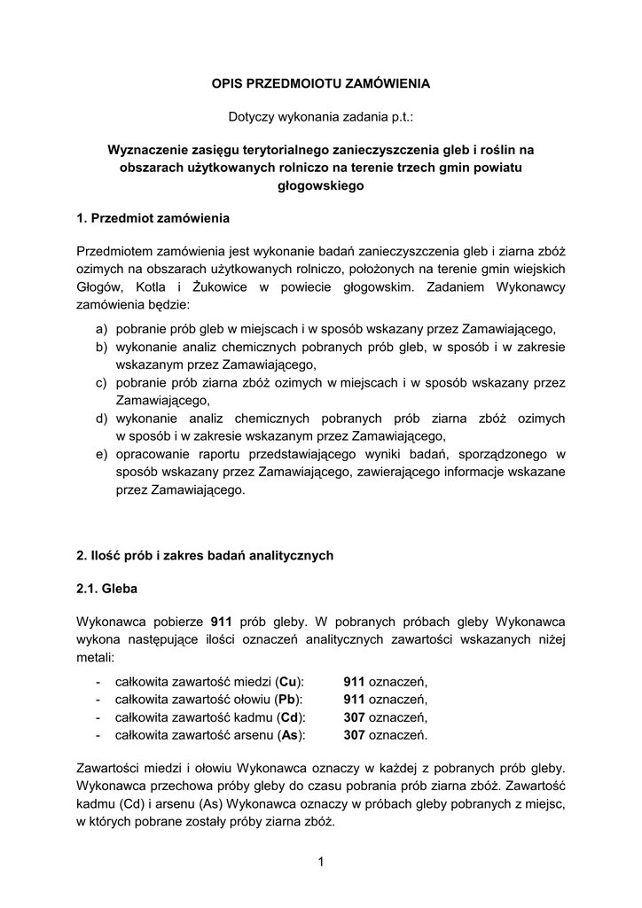 OPIS PRZEDMOIOTU ZAMÓWIENIA Dotyczy wykonania zadania p.t.: Wyznaczenie zasięgu terytorialnego zanieczyszczenia gleb i roślin na obszarach uŜytkowanych rolniczo na terenie trzech gmin powiatu głogowskiego 1. Przedmiot zamówienia Przedmiotem zamówienia jest wykonanie badań zanieczyszczenia gleb i ziarna zbóŜ ozimych na obszarach uŜytkowanych rolniczo, połoŜonych na terenie gmin wiejskich Głogów, Kotla i śukowice w powiecie głogowskim. Zadaniem Wykonawcy zamówienia będzie: a) pobranie prób gleb w miejscach i w sposób wskazany przez Zamawiającego, b) wykonanie analiz chemicznych pobranych prób gleb, w sposób i w zakresie wskazanym przez Zamawiającego, c) pobranie prób ziarna zbóŜ ozimych w miejscach i w sposób wskazany przez Zamawiającego, d) wykonanie analiz chemicznych pobranych prób ziarna zbóŜ ozimych w sposób i w zakresie wskazanym przez Zamawiającego, e) opracowanie raportu przedstawiającego wyniki badań, sporządzonego w sposób wskazany przez Zamawiającego, zawierającego informacje wskazane przez Zamawiającego. 2. Ilość prób i zakres badań analitycznych 2.1. Gleba Wykonawca pobierze 911 prób gleby. W pobranych próbach gleby Wykonawca wykona następujące ilości oznaczeń analitycznych zawartości wskazanych niŜej metali: - całkowita zawartość miedzi (Cu): całkowita zawartość ołowiu (Pb): całkowita zawartość kadmu (Cd): całkowita zawartość arsenu (As): 911 oznaczeń, 911 oznaczeń, 307 oznaczeń, 307 oznaczeń. Zawartości miedzi i ołowiu Wykonawca oznaczy w kaŜdej z pobranych prób gleby. Wykonawca przechowa próby gleby do czasu pobrania prób ziarna zbóŜ. Zawartość kadmu (Cd) i arsenu (As) Wykonawca oznaczy w próbach gleby pobranych z miejsc, w których pobrane zostały próby ziarna zbóŜ. 1 2.2. Ziarno zbóŜ ozimych Wykonawca pobierze 317 prób ziarna zbóŜ ozimych. W pobranych próbach ziarna Wykonawca wykona następujące ilości oznaczeń analitycznych zawartości wskazanych niŜej metali: - całkowita zawartość ołowiu (Pb): całkowita zawartość kadmu (Cd): całkowita zawartość miedzi (Cu): całkowita zawartość arsenu (As): 317 oznaczeń, 307 oznaczeń, 109 oznaczeń, 109 oznaczeń. Wykonawca oznaczy zawartości ołowiu w kaŜdej z pobranych prób ziarna. Wykonawca samodzielnie wybierze próby ziarna, w których wykona oznaczenia zawartości kadmu, miedzi i arsenu, stosując reguły wyboru prób podane przez Zamawiającego. 3. Wymagania w zakresie metod poboru prób i metod badań laboratoryjnych 3.1. Metody poboru prób i badań laboratoryjnych gleby Pobór prób gleb naleŜy przeprowadzić zgodnie z wymaganiami norm: - - PN-ISO 10381-1:2008 Jakość gleby -- Pobieranie próbek -- Część 1: Zasady opracowywania programów pobierania próbek, PN-ISO 10381-2:2007 Jakość gleby - Pobieranie próbek - Część 2: Zasady dotyczące technik pobierania, PN-ISO 10381-3:2007 Jakość gleby -- Pobieranie próbek -- Część 3: Zasady dotyczące bezpieczeństwa PN-ISO 10381-4:2007 Jakość gleby - Pobieranie próbek - Część 4: Zasady dotyczące postępowania podczas badań terenów naturalnych, zbliŜonych do naturalnych oraz uprawnych. PN-R-04031:1997 Analiza chemiczno-rolnicza gleby. Pobieranie próbek. Próby gleby naleŜy pobierać wyłącznie z poziomu 0-30 cm. Do badań naleŜy pobrać próbę łączną, utworzoną z pobrania i zmieszania 25 jednakowych próbek gleby, pobranych wokół miejsca poboru w kole o promieniu 5 m. Przygotowanie do badań i badania laboratoryjne pobranych prób gleb naleŜy przeprowadzić zgodnie z wymaganiami norm: - PN-ISO 11464:1999 Jakość gleby - Wstępne przygotowanie próbek do badań fizyczno-chemicznych, 2 - PN-ISO 11465:1999 Jakość gleby - Oznaczanie zawartości suchej masy gleby i wody w glebie w przeliczeniu na suchą masę gleby - Metoda wagowa PN-ISO 11466:2002 Jakość gleby - Ekstrakcja pierwiastków śladowych rozpuszczalnych w wodzie królewskiej, PN-ISO 11047:2001 Jakość gleby - Oznaczanie kadmu, chromu, kobaltu, miedzi, ołowiu, manganu, niklu i cynku w ekstraktach gleby wodą królewską Metody płomieniowej i elektrotermicznej absorpcyjnej spektrometrii atomowej Oznaczenia zawartości arsenu w ekstraktach przygotowanych zgodnie z PN-ISO 11466:2002 naleŜy przeprowadzić techniką absorpcyjnej spektrometrii atomowej. Metoda oznaczenia arsenu zastosowana przez laboratorium powinna być udokumentowana i zwalidowana. Wyniki badań analitycznych naleŜy podać wraz z niepewnością rozszerzoną. Wykonawca powinien wykazać i udokumentować zgodność stosowanych metod poboru prób i badań laboratoryjnych gleby z wymaganiami wymienionych wyŜej norm, w szczególności posiadaniem certyfikatu akredytacji wydanego zgodnie z przepisami ustawy z dnia 30 sierpnia 2002 r. o systemie oceny zgodności. 3.2. Metody poboru prób i badań laboratoryjnych ziarna zbóŜ ozimych Wykonawca dokona poboru 307 prób ziarna, w sposób zgodny z wymaganiami następujących norm: - PN-R-04012-00:1983 Analiza chemiczno-rolnicza roślin - Pobieranie próbek Zakres normy i postanowienia ogólne, PN-R-04012-01:1983 Analiza chemiczno-rolnicza roślin - Pobieranie próbek Rośliny zboŜowe. Próby ziarna naleŜy pobrać w okresie dojrzałości konsumpcyjno-technologicznej. We wszystkich pobranych próbach oznaczane będą zawartości ołowiu i kadmu, a w wybranych próbach dodatkowo miedzi i arsenu. W 10 miejscach poboru prób ziarna zbóŜ Wykonawca dokona dodatkowo poboru prób z partii ziarna zebranego z terenu uprawy, w obrębie której wskazano miejsce lokalizacji poboru próby. Próby naleŜy pobierać w sposób zgodny z wymaganiami zawartymi w rozporządzeniu Komisji Europejskiej (WE) NR 333/2007 z dnia 28 marca 2007 r. ustanawiającym metody pobierania próbek i metody analiz do celów urzędowej kontroli poziomów ołowiu, kadmu, rtęci, cyny nieorganicznej, 3-MCPD i benzo[a]pirenu w środkach spoŜywczych. W próbach ziarna pobranych z partii oznaczana będzie zawar
