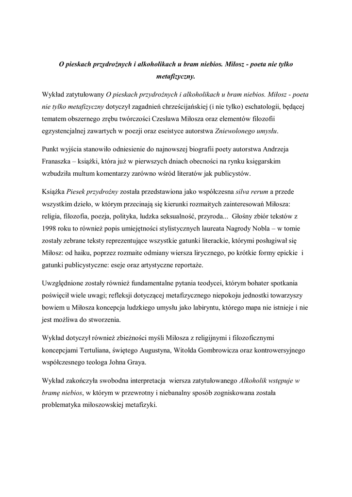 O pieskach przydrożnych i alkoholikach u bram niebios. Miłosz - poeta nie tylko metafizyczny. Wykład zatytułowany O pieskach przydrożnych i alkoholikach u bram niebios. Miłosz - poeta nie tylko metafizyczny dotyczył zagadnień chrześcijańskiej (i nie tylko) eschatologii, będącej tematem obszernego zrębu twórczości Czesława Miłosza oraz elementów filozofii egzystencjalnej zawartych w poezji oraz eseistyce autorstwa Zniewolonego umysłu. Punkt wyjścia stanowiło odniesienie do najnowszej biografii poety autorstwa Andrzeja Franaszka – książki, która już w pierwszych dniach obecności na rynku księgarskim wzbudziła multum komentarzy zarówno wśród literatów jak publicystów. Książka Piesek przydrożny została przedstawiona jako współczesna silva rerum a przede wszystkim dzieło, w którym przecinają się kierunki rozmaitych zainteresowań Miłosza: religia, filozofia, poezja, polityka, ludzka seksualność, przyroda... Głośny zbiór tekstów z 1998 roku to również popis umiejętności stylistycznych laureata Nagrody Nobla – w tomie zostały zebrane teksty reprezentujące wszystkie gatunki literackie, którymi posługiwał się Miłosz: od haiku, poprzez rozmaite odmiany wiersza lirycznego, po krótkie formy epickie i gatunki publicystyczne: eseje oraz artystyczne reportaże. Uwzględnione zostały również fundamentalne pytania teodycei, którym bohater spotkania poświęcił wiele uwagi; refleksji dotyczącej metafizycznego niepokoju jednostki towarzyszy bowiem u Miłosza koncepcja ludzkiego umysłu jako labiryntu, którego mapa nie istnieje i nie jest możliwa do stworzenia. Wykład dotyczył również zbieżności myśli Miłosza z religijnymi i filozoficznymi koncepcjami Tertuliana, świętego Augustyna, Witolda Gombrowicza oraz kontrowersyjnego współczesnego teologa Johna Graya. Wykład zakończyła swobodna interpretacja wiersza zatytułowanego Alkoholik wstępuje w bramę niebios, w którym w przewrotny i niebanalny sposób zogniskowana została problematyka miłoszowskiej metafizyki.