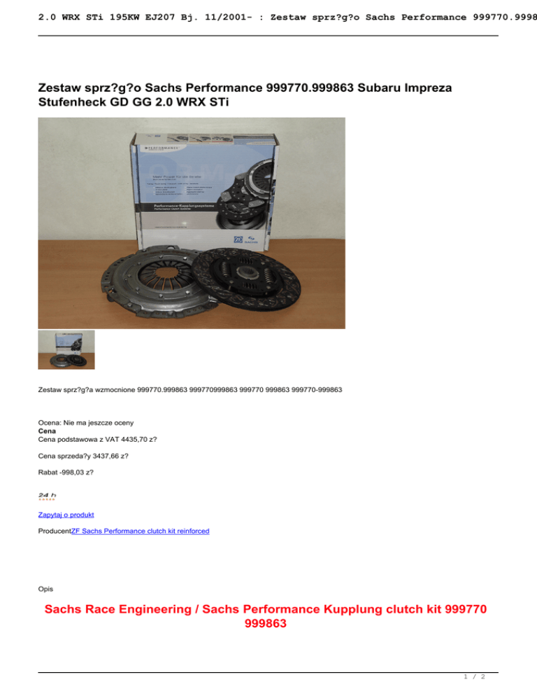2.0 WRX STi 195KW EJ207 Bj. 11/2001- : Zestaw sprz?g?o Sachs Performance 999770.9998 Zestaw sprz?g?o Sachs Performance 999770.999863 Subaru Impreza Stufenheck GD GG 2.0 WRX STi Zestaw sprz?g?a wzmocnione 999770.999863 999770999863 999770 999863 999770-999863 Ocena: Nie ma jeszcze oceny Cena Cena podstawowa z VAT 4435,70 z? Cena sprzeda?y 3437,66 z? Rabat -998,03 z? Zapytaj o produkt ProducentZF Sachs Performance clutch kit reinforced Opis Sachs Race Engineering / Sachs Performance Kupplung clutch kit 999770 999863 1 / 2 2.0 WRX STi 195KW EJ207 Bj. 11/2001- : Zestaw sprz?g?o Sachs Performance 999770.9998 bis 470NM+ / 348lb/ft+ mit torsionsgefedeter organischer Kupplungsscheibe 2 / 2 Powered by TCPDF (www.tcpdf.org)