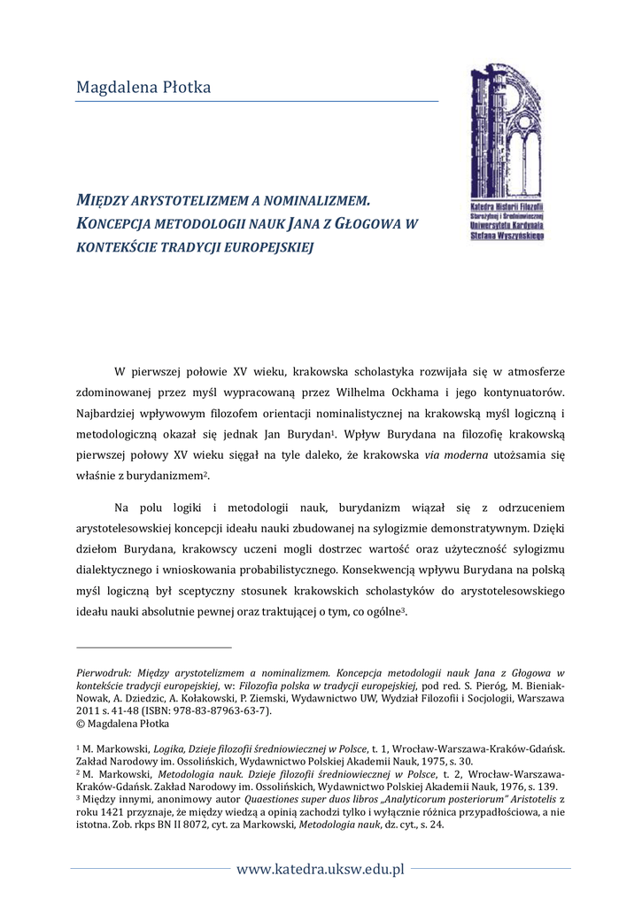 Magdalena Płotka MIĘDZY ARYSTOTELIZMEM A NOMINALIZMEM. KONCEPCJA METODOLOGII NAUK JANA Z GŁOGOWA W KONTEKŚCIE TRADYCJI EUROPEJSKIEJ W pierwszej połowie XV wieku, krakowska scholastyka rozwijała się w atmosferze zdominowanej przez myśl wypracowaną przez Wilhelma Ockhama i jego kontynuatorów. Najbardziej wpływowym filozofem orientacji nominalistycznej na krakowską myśl logiczną i metodologiczną okazał się jednak Jan Burydan1. Wpływ Burydana na filozofię krakowską pierwszej połowy XV wieku sięgał na tyle daleko, że krakowska via moderna utożsamia się właśnie z burydanizmem2. Na polu logiki i metodologii nauk, burydanizm wiązał się z odrzuceniem arystotelesowskiej koncepcji ideału nauki zbudowanej na sylogizmie demonstratywnym. Dzięki dziełom Burydana, krakowscy uczeni mogli dostrzec wartość oraz użyteczność sylogizmu dialektycznego i wnioskowania probabilistycznego. Konsekwencją wpływu Burydana na polską myśl logiczną był sceptyczny stosunek krakowskich scholastyków do arystotelesowskiego ideału nauki absolutnie pewnej oraz traktującej o tym, co ogólne3. Pierwodruk: Między arystotelizmem a nominalizmem. Koncepcja metodologii nauk Jana z Głogowa w kontekście tradycji europejskiej, w: Filozofia polska w tradycji europejskiej, pod red. S. Pieróg, M. BieniakNowak, A. Dziedzic, A. Kołakowski, P. Ziemski, Wydawnictwo UW, Wydział Filozofii i Socjologii, Warszawa 2011 s. 41-48 (ISBN: 978-83-87963-63-7). © Magdalena Płotka M. Markowski, Logika, Dzieje filozofii średniowiecznej w Polsce, t. 1, Wrocław-Warszawa-Kraków-Gdańsk. Zakład Narodowy im. Ossolińskich, Wydawnictwo Polskiej Akademii Nauk, 1975, s. 30. 2 M. Markowski, Metodologia nauk. Dzieje filozofii średniowiecznej w Polsce, t. 2, Wrocław-WarszawaKraków-Gdańsk. Zakład Narodowy im. Ossolińskich, Wydawnictwo Polskiej Akademii Nauk, 1976, s. 139. 3 Między innymi, anonimowy autor Quaestiones super duos libros „Analyticorum posteriorum” Aristotelis z roku 1421 przyznaje, że między wiedzą a opinią zachodzi tylko i wyłącznie różnica przypadłościowa, a nie istotna. Zob. rkps BN II 8072, cyt. za Markowski, Metodologia nauk, dz. cyt., s. 24. 1 www.katedra.uksw.edu.pl 2 Zwrot nastąpił w roku 1452, gdy papież Mikołaj V zatwierdził doktrynę arystotelizmu chrześcijańskiego jako podstawę uniwersyteckich programów nauczania. Jednym krzewicieli nowej idei był Jan Wersor, pochodzący z Normandii, mistrz Wydziału Sztuk Uniwersytetu w Kolonii. Nie ma wątpliwości, że krakowski nurt via antiqua swe źródła miał w Kolonii, w filozofii Wersora4. Nurt ten stał się popularny w Krakowie, między innymi, za pośrednictwem pism Jana Wersora, które trafiły tam we wczesnych latach sześćdziesiątych 5 . Wśród uczonych krakowskich, którzy pozostawali pod wpływami Wesora w największej mierze, wymienia się Jana z Głogowa6. Celem niniejszego artykułu jest zbadanie na ile Jan z Głogowa, mistrz sztuk z Karkowa, pozostawał pod wpływem realistycznej filozofii Jana Wersora na polu logiki i metodologii nauk, a na ile w jego teoriach logiczno-metodologicznych obecne są wpływy nominalizmu wersji burydanowskiej. Mieczysław Markowski wymienia Jana z Głogowa jako najwybitniejszego krakowskiego logika obok Michała z Biestrzykowa oraz Michała z Wrocławia7. Głogowczyk swoją koncepcję logiki oraz metodologii nauk przedstawił w Argumentum Librum Posteriorum Analyticorum Aristotelis (Lipsk, 1499). Jednocześnie w eksplicycie do tego komentarza zadeklarował zgodność swoich koncepcji z linią wyznaczoną przez doktrynę Wersora8. Jan z Głogowa omawia tam kontrowersyjne zagadnienia z dziedziny nauki, dotyczące sylogizmu demonstratywnego. Teza, zgodnie z którą Głogowczyk podąża na polu logiki i metodologii nauk pod wpływem Wersora za arystotelizmem pozostaje jednak dyskusyjna. Jan z Głogowa swoje rozważania nad sylogizmami rozpoczyna od pytania o charakter logiki: czy logika ma charakter praktyczny, czy też teoretyczny? Markowski zauważa, że Jan z Głogowa jest pierwszym polskim logikiem, który porzucił koncepcję Burydana i stwierdził, że logika jest „po części” teoretyczna, a „po części” praktyczna. Ujęcie spekulatywnego charakteru Z. Kuksewicz, Alberyzm i tomizm w XV w. w Krakowie. Doktryna psychologiczna, PAN IFIS Ossolineum, Wrocław, Warszawa, Kraków, Gdańsk, 1973, s. 5. 5 M. Markowski, Die Wissenschaftlichen Verbindungen zwischen der Kölner und der Krakauer Universität im Mittelalter, [w:] Kölner Universität im Mittelalter: Geistige Wurzeln und Soziale Wirklichkeit, red. A. Zimmermann, Berlin – Nowy Jork, 1989cyt., s. 285. 6 Tamże, s. 295. 7 M. Markowski, Logika, Dzieje filozofii średniowiecznej w Polsce, t. 1, Wrocław-Warszawa-Kraków-Gdańsk. Zakład Narodowy im. Ossolińskich, Wydawnictwo Polskiej Akademii Nauk, 1975, s. 162. 8 Iohannes Glovienses, Argumentum Librum Posteriorum Analyticorum Aristotelis, Lipsk, 1499. 4 www.katedra.uksw.edu.pl 3 logiki przez Głogowczyka, zdaniem Markowskiego, wynika z wpływów Wersora na myśl krakowskiego filozofa9. Rzeczywiście Wersor w traktacie Praedicabilia Porphyrii definiuje logikę jako naukę spekulatywną simpliciter, zaś praktyczną secundum modum10. Logika dla Wersora jest zatem przede wszystkim dyscypliną teoretyczną, ponieważ jej celem nie jest działanie, lecz poznanie prawdy 11 . Wersor przeciwstawia się w tej kwestii Burydanowi, zarzucając mu, że czternastowieczny filozof, definiując logikę jako pewną sprawność kierującą takimi działaniami jak składanie, dzielenie, klasyfikowanie oraz rozumowanie, zbyt duży nacisk kładzie na działania i stąd wyprowadza błędny wniosek, że logika jest zasadniczo nauką praktyczną, a nie spekulatywną12. We wstępie do komentarza do Analityk wtórych Arystotelesa, Głogowczyk zauważa, że w naturze człowieka leży celowe działanie, ponieważ człowiek z natury dąży do pewnych celów. Nie różni się on w tym