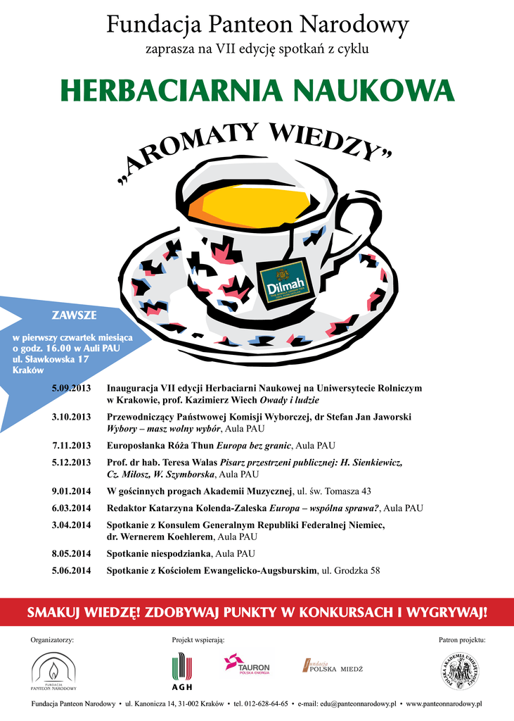 Fundacja Panteon Narodowy zaprasza na VII edycję spotkań z cyklu HERBACIARNIA NAUKOWA ZAWSZE w pierwszy czwartek miesiąca o godz. 16.00 w Auli PAU ul. Sławkowska 17 Kraków 5.09.2013 Inauguracja VII edycji Herbaciarni Naukowej na Uniwersytecie Rolniczym w Krakowie, prof. Kazimierz Wiech Owady i ludzie 3.10.2013 Przewodniczący Państwowej Komisji Wyborczej, dr Stefan Jan Jaworski Wybory – masz wolny wybór, Aula PAU 7.11.2013 Europosłanka Róża Thun Europa bez granic, Aula PAU 5.12.2013 Prof. dr hab. Teresa Walas Pisarz przestrzeni publicznej: H. Sienkiewicz, Cz. Miłosz, W. Szymborska, Aula PAU 9.01.2014 W gościnnych progach Akademii Muzycznej, ul. św. Tomasza 43 6.03.2014 Redaktor Katarzyna Kolenda-Zaleska Europa – wspólna sprawa?, Aula PAU 3.04.2014 Spotkanie z Konsulem Generalnym Republiki Federalnej Niemiec, dr. Wernerem Koehlerem, Aula PAU 8.05.2014 Spotkanie niespodzianka, Aula PAU 5.06.2014 Spotkanie z Kościołem Ewangelicko-Augsburskim, ul. Grodzka 58 SMAKUJ WIEDZĘ! ZDOBYWAJ PUNKTY W KONKURSACH I WYGRYWAJ! Organizatorzy: Projekt wspierają: Patron projektu: Fundacja Panteon Narodowy • ul. Kanonicza 14, 31-002 Kraków • tel. 012-628-64-65 • e-mail: [email protected] • www.panteonnarodowy.pl
