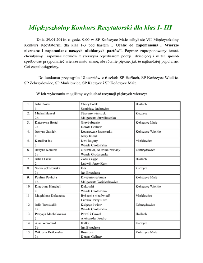 Międzyszkolny Konkurs Recytatorski dla klas I- III