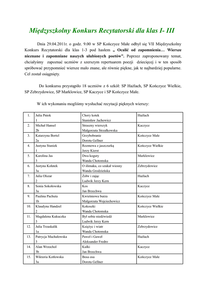 Międzyszkolny Konkurs Recytatorski dla klas I- III Dnia 29.04.2011r. o godz. 9.00 w SP Kończyce Małe odbył się VII Międzyszkolny Konkurs Recytatorski dla klas 1-3 pod hasłem „ Ocalić od zapomnienia… Wiersze nieznane i zapomniane naszych ulubionych poetów”. Poprzez zaproponowany temat, chciałyśmy zapoznać uczniów z szerszym repertuarem poezji dziecięcej i w ten sposób spróbować przypomnieć wiersze mało znane, ale równie piękne, jak te najbardziej popularne. Cel został osiągnięty. Do konkursu przystąpiło 18 uczniów z 6 szkół: SP Hażlach, SP Kończyce Wielkie, SP Zebrzydowice, SP Marklowice, SP Kaczyce i SP Kończyce Małe. W ich wykonaniu mogliśmy wysłuchać recytacji pięknych wierszy: 1. 2. 3. 4. 5. 6. 7. 8. 9. 10. 11. 12. 13. 14. 15. Julia Pniok 1 Michał Hansel 2b Katarzyna Bortel 2a Justyna Staniek 1 Karolina Jas 3 Justyna Kołatek 3a Julia Olszar 2 Sonia Sokołowska 3a Paulina Pachuta 1b Klaudyna Handzel 2 Magdalena Kukuczka 3 Julia Trzaskalik 1a Patrycja Machałowska 3 Alan Wrzochol 3b Wiktoria Kotłowska 3a Chory kotek Stanisław Jachowicz Straszny wierszyk Małgorzata Strzałkowska Grzybobranie Dorota Gellner Rozmowa z jaszczurką Jerzy Kierst Dwa koguty Wanda Chotomska O ślimaku, co szukał wiosny Wanda Grodzieńska Żółw i zając Ludwik Jerzy Kern Kos Jan Brzechwa Kwietniowa burza Małgorzata Wojciechowicz Kokoszki Wanda Chotomska Był sobie niedźwiedź Ludwik Jerzy Kern Księżyc i wiatr Wanda Chotomska Paweł i Gaweł Aleksander Fredro Kulki Jan Brzechwa Bosa osa Dorota Gellner Hażlach Kaczyce Kończyce Małe Kończyce Wielkie Marklowice Zebrzydowice Hażlach Kaczyce Kończyce Małe Kończyce Wielkie Marklowice Zebrzydowice Hażlach Kaczyce Kończyce Małe 16. 17. 18. Justyna Cyrzyk 3 Lena Prandzioch 3 Tatiana Mysakowicz 2 O ślimaku, co szukał wiosny Wanda Grodzieńska Dwa jeże Ludwik Jerzy Kern Zjazd we wtorek u sikorek Małgorzata Wojciechowicz Kończyce Wielkie Marklowice Zebrzydowice Uczestników konkursu oceniało wybrane drogą losowania jury w składzie: • • • p. mgr Ewa Machej ( SP Kaczyce ) p. mgr Dorota Górecka ( SP Marklowice) p. mgr Urszula Budzińska ( SP Kończyce Małe ) Ocenie jurorów podlegało przede wszystkim: pamięciowe opanowanie tekstu, dobór repertuaru, interpretacja wiersza, dykcja, ogólny wyraz artystyczny. Wszyscy uczniowie prezentowali wysoki poziom umiejętności recytatorskich i byli gorąco dopingowani przez wspaniałą publiczność z klasy 1b i delegacje pozostałych klas. Po zaprezentowaniu się wszystkich uczestników konkursu, jurorzy udali się na obrady, a goście na poczęstunek do sali nr 30. Wszystkim bardzo smakowały pyszne ciasta upieczone przez mamusie uczennic z klas drugich. Najbardziej oczekiwanym momentem było ogłoszenie wyników. Decyzją jurorów : • • • I miejsce w konkursie zajęła Lena Prandzioch z SP Marklowice II miejsce – Wiktoria Kotłowska z SP Kończyce Małe III miejsce – Justyna Cyrzyk z SP Kończyce Wielkie Przyznano również trzy wyróżnienia: • • • dla uczennicy SP Marklowice – Magdaleny Kukuczki dla uczennicy SP Kaczyce – Soni Sokołowskiej dla uczennicy SP Kończyce Małe - Katarzyny Bortel Każdy uczestnik konkursu otrzymał pamiątkowy dyplom i upominki – piłkę plażową, notesik i długopis, a zwycięzcy atrakcyjne książki, skarbonki i farby. Organizatorzy Międzyszkolnego Konkursu Recytatorskiego serdecznie dziękują: • • • wszystkim reprezentantom poszczególnych szkół i ich nauczycielom za udział w konkursie, Komitetowi Rodzicielskiemu za ufundowanie nagród, paniom: K. Wawrzyczek, L. Żertce, K. Płaczek i A. Bortel za upieczenie ciast. Zapraszamy do obejrzenia zdjęć na naszej stronie internetowej i do udziału w konkursie w przyszłym roku szkolnym. Ewa Walica, Grażyna Szewczyk