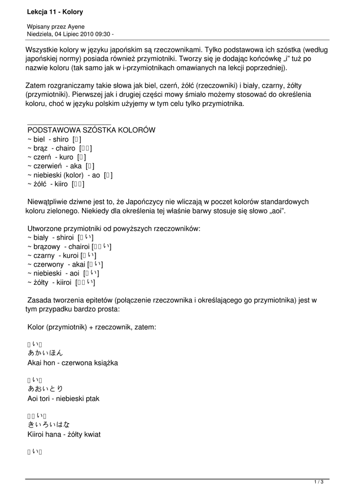 Lekcja 11 - Kolory Wpisany przez Ayene Niedziela, 04 Lipiec 2010 09:30 - Wszystkie kolory w języku japońskim są rzeczownikami. Tylko podstawowa ich szóstka (według japońskiej normy) posiada również przymiotniki. Tworzy się je dodając końcówkę „i” tuż po nazwie koloru (tak samo jak w i-przymiotnikach omawianych na lekcji poprzedniej). Zatem rozgraniczamy takie słowa jak biel, czerń, żółć (rzeczowniki) i biały, czarny, żółty (przymiotniki). Pierwszej jak i drugiej części mowy śmiało możemy stosować do określenia koloru, choć w języku polskim użyjemy w tym celu tylko przymiotnika. _____________________ PODSTAWOWA SZÓSTKA KOLORÓW ~ biel - shiro [白] ~ brąz - chairo [茶色] ~ czerń - kuro [黒] ~ czerwień - aka [赤] ~ niebieski (kolor) - ao [青] ~ żółć - kiiro [黄色] Niewątpliwie dziwne jest to, że Japończycy nie wliczają w poczet kolorów standardowych koloru zielonego. Niekiedy dla określenia tej właśnie barwy stosuje się słowo „aoi”. Utworzone przymiotniki od powyższych rzeczowników: ~ biały - shiroi [白い] ~ brązowy - chairoi [茶色い] ~ czarny - kuroi [黒い] ~ czerwony - akai [赤い] ~ niebieski - aoi [青い] ~ żółty - kiiroi [黄色い] Zasada tworzenia epitetów (połączenie rzeczownika i określającego go przymiotnika) jest w tym przypadku bardzo prosta: Kolor (przymiotnik) + rzeczownik, zatem: 赤い本 あかいほん Akai hon - czerwona książka 青い鳥 あおいとり Aoi tori - niebieski ptak 黄色い花 きいろいはな Kiiroi hana - żółty kwiat 黒い猫 1/3 Lekcja 11 - Kolory Wpisany przez Ayene Niedziela, 04 Lipiec 2010 09:30 - くろいねこ Kuroi neko - czarny kot _____________________ KOLORY NIEMNIEJ ISTOTNE Przypominam, że poniższe kolory w języku japońskim są rzeczownikami ! Jak zapewne zauważyliście niektóre nazwy mają końcówkę „iro” [色] oznaczającą „kolor”. Wedle uznania można ją zastosować do reszty. ~ jasno-niebieski - mizuiro [水色] (mizu - woda) ~ pomarańczowy - daidai [橙] lub orenji [オレンジ] ~ purpurowy - murasaki [紫] ~ różowy - momoiro [桃色] lub pinku [ピンク] ~ srebrny - gin’iro [銀色] (gin - srebro) ~ szary - haiiro [灰色] (hai - popiół) ~ zielony - midori [緑] ~ złoty - kin’iro [金色] (kin - złoto) _____________________ INNE KOLORY POCHODNE Reszta barw nie jest tak popularna, ale powinna zostać rozpoznana przez większość Japończyków. Przede wszystkim weźmy pod uwagę fakt, że (zwłaszcza) mało który mężczyzna rozróżnia kolor lawendowy od fiołkowego, karmazynowy od szkarłatnego, wrzosowy od liliowego, itd. ~ ciemno-brązowy - kogechairo [焦げ茶色] ~ ciemno-niebieski - aiiro [藍色] (ai - indygo) ~ cynobrowy - shuiro [朱色] ~ głęboko-zielony - fukamidori [深緑色] ~ głęboko-niebieski - kon’iro [紺色] ~ lawendowy - fujiiro [藤色] ~ jasno-różowy - sakurairo [桜色] (sakura - wiśnia) ~ karmazynowy - akaneiro [茜色] ~ oliwkowo-zielony - uguisu [鶯色] ~ żółto-brązowy - ōdoiro [黄土色] ~ żółto-pomarańczowy - yamabukiiro [山吹色] ~ żółto-zielony - kimidori [黄緑] W przypadku gdy kolor nie jest przymiotnikiem utworzenie epitetu następuje poprzez dodanie do nazwy koloru partykuły „no” [の] i rzeczownika: Nazwa koloru + の + rzeczownik 緑の草 みどりのくさ Midori no kusa - zielona trawa 2/3 Lekcja 11 - Kolory Wpisany przez Ayene Niedziela, 04 Lipiec 2010 09:30 - 金色の指輪 きんいろのゆびわ Kin’iro no yubiwa - złoty pierścionek 紫の上着 むらさきのうわぎ Murasaki no uwagi - purpurowy płaszcz 藤色のスカーフ ふじいろのスカーフ Fujiiro no sukaafu - lawendowy szal _____________________ Ćwiczenie 1 Tym razem bez ćwiczeń. ^^ 注目ありがとうございます。皆さんによろしく。 _____________________ Lekcja do ściągnięcia tutaj ! 3/3