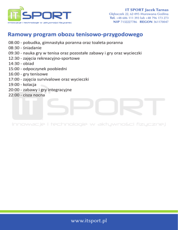 IT SPORT Jacek Tarnas Głęboczek 22, 62-095 Murowana Goślina Tel. +48 606 111 393 lub +48 796 173 273 NIP 7132227786 REGON 361170047 Ramowy program obozu tenisowo-przygodowego 08:00 - pobudka, gimnastyka poranna oraz toaleta poranna 08:30 - śniadanie 09:30 - nauka gry w tenisa oraz pozostałe zabawy i gry oraz wycieczki 12:30 - zajęcia rekreacyjno-sportowe 14:30 - obiad 15:00 - odpoczynek poobiedni 16:00 - gry tenisowe 17:00 - zajęcia survivalowe oraz wycieczki 19:00 - kolacja 20:00 - zabawy i gry integracyjne 22:00 - cisza nocna www.itsport.pl