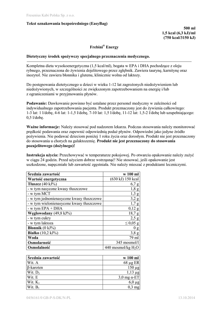 Fresenius Kabi Polska Sp. z o.o. Tekst oznakowania bezpośredniego (EasyBag) 500 ml 1,5 kcal (6,3 kJ)/ml (750 kcal/3150 kJ) Frebini® Energy Dietetyczny środek spożywczy specjalnego przeznaczenia medycznego. Kompletna dieta wysokoenergetyczna (1,5 kcal/ml), bogata w EPA i DHA pochodzące z oleju rybnego, przeznaczona do żywienia dojelitowego przez zgłębnik. Zawiera taurynę, karnitynę oraz inozytol. Nie zawiera błonnika i glutenu, klinicznie wolna od laktozy. Do postępowania dietetycznego u dzieci w wieku 1-12 lat zagrożonych niedożywieniem lub niedożywionych, w szczególności ze zwiększonym zapotrzebowaniem na energię i/lub z ograniczeniami w przyjmowaniu płynów. Podawanie: Dawkowanie powinno być ustalane przez personel medyczny w zależności od indywidualnego zapotrzebowania pacjenta. Produkt przeznaczony jest do żywienia całkowitego: 1-3 lat: 1 l/dobę, 4-6 lat: 1-1,5 l/dobę, 7-10 lat: 1,5 l/dobę, 11-12 lat: 1,5-2 l/dobę lub uzupełniającego: 0,5 l/dobę. Ważne informacje: Należy stosować pod nadzorem lekarza. Podczas stosowania należy monitorować prędkość podawania oraz zapewnić odpowiednią podaż płynów. Odpowiedni jako jedyne źródło pożywienia. Nie podawać dzieciom poniżej 1 roku życia oraz dorosłym. Produkt nie jest przeznaczony do stosowania u chorych na galaktozemię. Produkt nie jest przeznaczony do stosowania pozajelitowego (dożylnego)! Instrukcja użycia: Przechowywać w temperaturze pokojowej. Po otwarciu opakowanie należy zużyć w ciągu 24 godzin. Przed użyciem dobrze wstrząsnąć! Nie stosować, jeśli opakowanie jest uszkodzone, napęczniałe lub zawartość zgęstniała. Nie należy mieszać z produktami leczniczymi. Średnia zawartość w 100 ml (630 kJ) 150 kcal Wartość energetyczna Tłuszcz (40 kJ%) 6,7 g - w tym nasycone kwasy tłuszczowe 1,8 g - w tym MCT 1,3 g - w tym jednonienasycone kwasy tłuszczowe 3,2 g - w tym wielonienasycone kwasy tłuszczowe 1,7 g - w tym EPA + DHA 0,12 g Węglowodany (49,8 kJ%) 18,7 g - w tym cukry 2,5 g - w tym laktoza ≤ 0,05 g Błonnik (0 kJ%) 0g Białko (10,2 kJ%) 3,8 g 79 ml Woda 345 mosmol/l Osmolarność 440 mosmol/kg H2O Osmolalność Średnia zawartość Wit. A β-karoten Wit. D3 Wit. E Wit. K1 Wit. B1 0456161/0 GB-P-S-DK/N-PL w 100 ml 68 µg ER 150 µg 1,13 µg 3,0 mg α-ET 6,0 µg 0,3 mg 13.10.2014 Fresenius Kabi Polska Sp. z o.o. Wit. B2 Niacyna Wit. B6 Wit. B12 Kwas pantotenowy Biotyna Kwas foliowy Wit. C Cholina Mioinozytol Karnityna Tauryna 0,3 mg 1,8 mg EN 0,17 mg 0,3 µg 0,6 mg 7,5 µg 33 µg 12 mg 30 mg 22,5 mg 4,5 mg 12 mg Średnia zawartość Sód (Na) Potas (K) Chlorki (Cl) Wapń (Ca) Magnez (Mg) Fosfor (P) Żelazo (Fe) Cynk (Zn) Miedź (Cu) Mangan (Mn) Jod (I) Fluorki (F) Chrom (Cr) Molibden (Mo) Selen (Se) w 100 ml 86 mg 150 mg 123 mg 105 mg 17,5 mg 92 mg 1,5 mg 1,5 mg 150 μg 0,18 mg 15 μg 0,12 mg 6,0 μg 6,0 μg 4,5 μg Skład: woda, maltodekstryna, olej rzepakowy, białko mleka, trójglicerydy o średniej długości łańcucha (MCT), sacharoza, olej rybny, emulgatory (E 471, lecytyna sojowa), wodorofosforan dipotasu, chlorek potasu, cytrynian sodu, chlorek sodu, wodorowinian choliny, wit. C, mioinozytol, regulator kwasowości (E 524), tlenek magnezu, tauryna, siarczan żelaza, siarczan cynku, L-karnityna, wit. E, niacyna, wit. B1, kwas pantotenowy, chlorek manganu, wit. B2, siarczan miedzi, wit. B6, fluorek sodu, ß-karoten, wit. A, kwas foliowy, chlorek chromu, molibdenian sodu, biotyna, jodek potasu, selenin sodu, wit. K1, wit. D3, wit. B12. Najlepiej spożyć przed końcem: data i numer partii na opakowaniu. [logo Fresenius Kabi] [na opakowaniu umieszczona jest skala, kod EAN oraz numer partii produkcyjnej] EasyBag Producent: Fresenius Kabi Deutschland GmbH D-61346 Bad Homburg/Niemcy www.fresenius-kabi.com Dystrybutor: Fresenius Kabi Polska Sp. z o.o. ul. Hrubieszowska 2 01-209 Warszawa 0456161/0 0456161/0 GB-P-S-DK/N-PL 13.10.2014