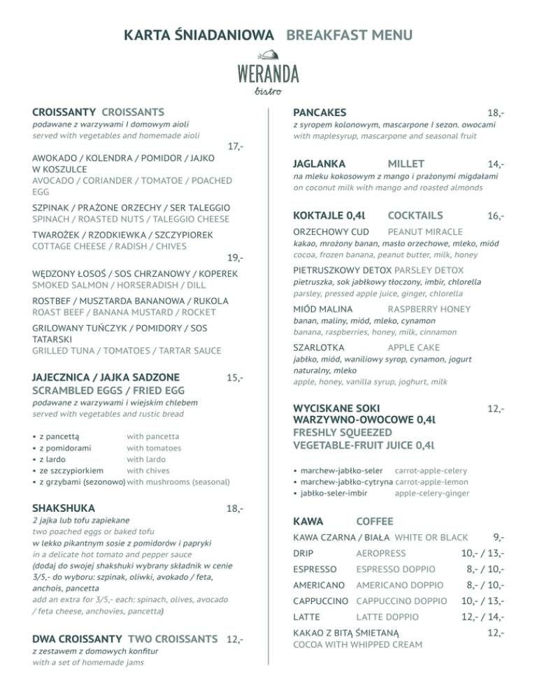KARTA ŚNIADANIOWA BREAKFAST MENU CROISSANTY CROISSANTS PANCAKES podawane z warzywami I domowym aioli served with vegetables and homemade aioli z syropem kolonowym, mascarpone I sezon. owocami with maplesyrup, mascarpone and seasonal fruit 17,AWOKADO / KOLENDRA / POMIDOR / JAJKO W KOSZULCE AVOCADO / CORIANDER / TOMATOE / POACHED EGG SZPINAK / PRAŻONE ORZECHY / SER TALEGGIO SPINACH / ROASTED NUTS / TALEGGIO CHEESE JAGLANKA 18,- MILLET 14,- na mleku kokosowym z mango i prażonymi migdałami on coconut milk with mango and roasted almonds KOKTAJLE 0,4l COCKTAILS TWAROŻEK / RZODKIEWKA / SZCZYPIOREK COTTAGE CHEESE / RADISH / CHIVES ORZECHOWY CUD PEANUT MIRACLE WĘDZONY ŁOSOŚ / SOS CHRZANOWY / KOPEREK SMOKED SALMON / HORSERADISH / DILL PIETRUSZKOWY DETOX PARSLEY DETOX 19,- ROSTBEF / MUSZTARDA BANANOWA / RUKOLA ROAST BEEF / BANANA MUSTARD / ROCKET GRILOWANY TUŃCZYK / POMIDORY / SOS TATARSKI GRILLED TUNA / TOMATOES / TARTAR SAUCE JAJECZNICA / JAJKA SADZONE SCRAMBLED EGGS / FRIED EGG podawane z warzywami i wiejskim chlebem served with vegetables and rustic bread • z pancettą with pancetta • z pomidorami with tomatoes • z lardo with lardo • ze szczypiorkiem with chives • z grzybami (sezonowo)with mushrooms (seasonal) SHAKSHUKA 18,2 jajka lub tofu zapiekane two poached eggs or baked tofu w lekko pikantnym sosie z pomidorów i papryki in a delicate hot tomato and pepper sauce (dodaj do swojej shakshuki wybrany składnik w cenie 3/5,- do wyboru: szpinak, oliwki, avokado / feta, anchois, pancetta add an extra for 3/5,- each: spinach, olives, avocado / feta cheese, anchovies, pancetta) DWA CROISSANTY TWO CROISSANTS12,z zestawem z domowych konfitur with a set of homemade jams kakao, mrożony banan, masło orzechowe, mleko, miód cocoa, frozen banana, peanut butter, milk, honey pietruszka, sok jabłkowy tłoczony, imbir, chlorella parsley, pressed apple juice, ginger, chlorella MIÓD MALINA RASPBERRY HONEY banan, maliny, miód, mleko, cynamon banana, raspberries, honey, milk, cinnamon SZARLOTKA 15,- 16,- APPLE CAKE jabłko, miód, waniliowy syrop, cynamon, jogurt naturalny, mleko apple, honey, vanilla syrup, joghurt, milk WYCISKANE SOKI WARZYWNO-OWOCOWE 0,4l FRESHLY SQUEEZED VEGETABLE-FRUIT JUICE 0,4l 12,- • marchew-jabłko-seler carrot-apple-celery • marchew-jabłko-cytryna carrot-apple-lemon • jabłko-seler-imbir apple-celery-ginger KAWA COFFEE KAWA CZARNA / BIAŁA WHITE OR BLACK9,DRIP AEROPRESS 10,- / 13,- ESPRESSO ESPRESSO DOPPIO 8,- / 10,- AMERICANO AMERICANO DOPPIO 8,- / 10,- CAPPUCCINO CAPPUCCINO DOPPIO 10,- / 13,- LATTE 12,- / 14,- LATTE DOPPIO KAKAO Z BITĄ ŚMIETANĄ 12,COCOA WITH WHIPPED CREAM HERBATY TEAS ENGLISH BREAKFAST / EARL GREY / JAŚMINOWA JASMINE / ZIELONA GREEN / ROOIBOS / MIĘTA MINT WERANDA 10,13,- herbata malinowa z konfiturą malinową raspberry tea with raspberry jam ZIELONA WERANDA 13,- herbata zielona z konfiturą pomarańczową green tea with orange jam IMBIROWA 13,z cytryną, miodem, i świeżym imbirem with lemon, honey & fresh ginger MANGO 13,- ICE TEA 15,- jabłko / pomarańcza / grejpfrut / czarna porzeczka / pomidor apple / orange / grapefruit / black currant / tomato NAPOJE GAZOWANE SOFT DRINKS 0,2l 6,- 10,- LEMONIADY LEMONADE 13,- PEAR mus gruszkowy, syrop gruszkowy, sok z cytryny, owoce, soda pear moouse, pear syrup, lemon juice, fruit, soda napar wiśniowy, syrop jabłkowy, owoce, mięta cherry brew, apple syrup, fruit, mint MINT TYMIANKOWO-ROZMARYNOWA THYME-ROSEMARY napar miętowy, liście mięty, cytryny, pomarańcze mint brew, mint, lemons, oranges WODA GAZOWANA / NIEGAZOWANA6,STILL OR SPARKLING WATER 0,3l z owocami i liściem mięty with fruit and mint syrop tymiankowo-rozmarynowy, sok z cytryny, soda aromatyzowana rozmarynem thyme-rosemary syrup, lemon juice, rosemary infused soda CYTRYNOWA 15,- gazowana / niegazowana still or sparkling z owocami i liściem mięty with fruit and mint WODA BUTELKOWA 6,- / 10,BOTTLED WATER 0,33l Kropla Beskidu / San Pellegrino SOK JUICE 0,2l6,- GRUSZKOWA CHERRY KARAFKA WODY WATER CARAFE 1l (syropy do lemoniad robimy sami homemade lemonade syrups) napar z zielonej herbaty, syrop limonkowy, owoce green tea brew, lime syrup, fruit MIĘTOWA SOKI Z DOMOWEJ TŁOCZNI10,HOME PRESSED JUICE 0,3l RED BULL LIMONKOWA LIME WIŚNIOWA z pomarańczy, grejpfrutów lub mieszany orange, grapefruit or mixed coca-cola / coca-cola zero / fanta / sprite / kinley tonic z syropem mango, pomarańczą i kardamonem with mango syrup, orange & cardamom HERBATY MROŻONE ŚWIEŻO WYCISKANY SOK14,FRESHLY SQUEEZED JUICE 0,33l LEMON sok z cytryny, syrop cukrowy, mięta, owoce, soda lemon juice, sugar syrup, mint, fruit, soda MALINOWA RASPBERRY mus z malin, sok z cytryny, syrop cukrowy, owoce, mięta, soda raspberry mousse, lemon juice, sugar syrup, mint, soda