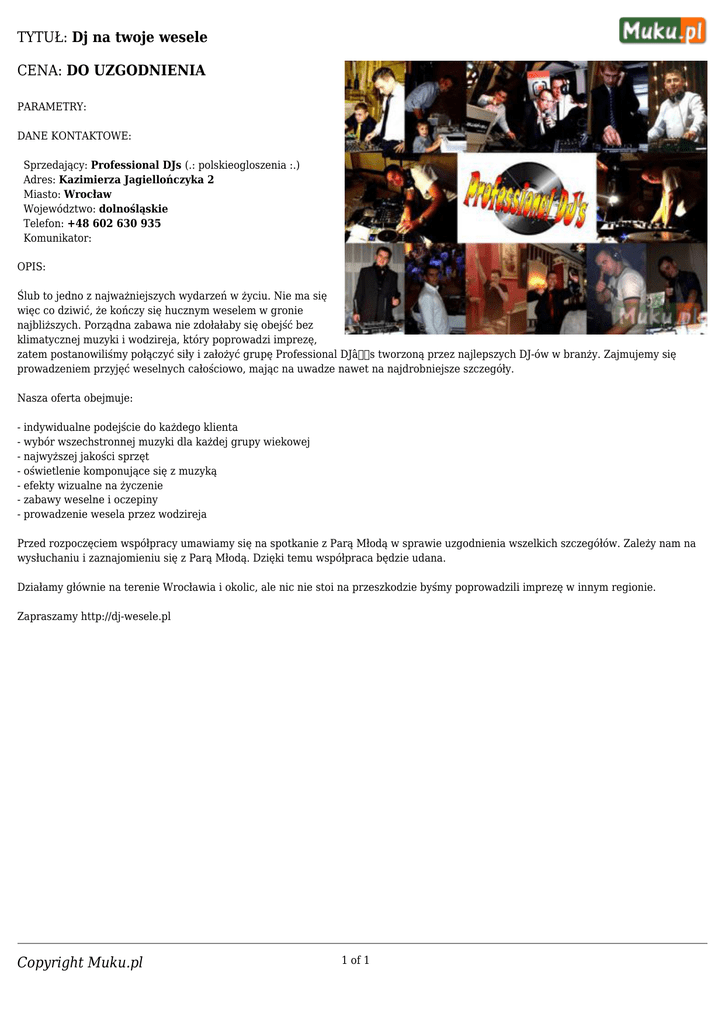 TYTUŁ: Dj na twoje wesele CENA: DO UZGODNIENIA PARAMETRY: DANE KONTAKTOWE: Sprzedający: Professional DJs (.: polskieogloszenia :.) Adres: Kazimierza Jagiellończyka 2 Miasto: Wrocław Województwo: dolnośląskie Telefon: +48 602 630 935 Komunikator: OPIS: Ślub to jedno z najważniejszych wydarzeń w życiu. Nie ma się więc co dziwić, że kończy się hucznym weselem w gronie najbliższych. Porządna zabawa nie zdołałaby się obejść bez klimatycznej muzyki i wodzireja, który poprowadzi imprezę, zatem postanowiliśmy połączyć siły i założyć grupę Professional DJâs tworzoną przez najlepszych DJ-ów w branży. Zajmujemy się prowadzeniem przyjęć weselnych całościowo, mając na uwadze nawet na najdrobniejsze szczegóły. Nasza oferta obejmuje: - indywidualne podejście do każdego klienta - wybór wszechstronnej muzyki dla każdej grupy wiekowej - najwyższej jakości sprzęt - oświetlenie komponujące się z muzyką - efekty wizualne na życzenie - zabawy weselne i oczepiny - prowadzenie wesela przez wodzireja Przed rozpoczęciem współpracy umawiamy się na spotkanie z Parą Młodą w sprawie uzgodnienia wszelkich szczegółów. Zależy nam na wysłuchaniu i zaznajomieniu się z Parą Młodą. Dzięki temu współpraca będzie udana. Działamy głównie na terenie Wrocławia i okolic, ale nic nie stoi na przeszkodzie byśmy poprowadzili imprezę w innym regionie. Zapraszamy http://dj-wesele.pl Copyright Muku.pl 1 of 1