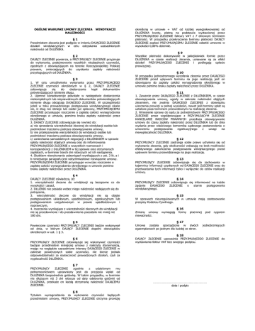 OGÓLNE WARUNKI UMOWY ZLECENIA NALEŻNOŚCI WINDYKACJI §1 Przedmiotem zlecenia jest podjęcie w imieniu DAJĄCEGO ZLECENIE działań windykacyjnych w celu odzyskania uzasadnionych należności od DŁUŻNIKA. §2 DAJĄCY ZLECENIE powierza, a PRZYJMUJĄCY ZLECENIE przyjmuje do wykonania, podejmowanie wszelkich niezbędnych czynności, zgodnych z obowiązującym na terenie Rzeczypospolitej Polskiej prawem, zmierzających do uzyskania zapłaty należności przysługujących od DŁUŻNIKA. §3 1. W celu umożliwienia wykonania przez PRZYJMUJĄCEGO ZLECENIE czynności określonych w § 2, DAJĄCY ZLECENIE zobowiązuje się do dostarczenia kopii dokumentów potwierdzających istnienie długu. 2. Ujemne konsekwencje powstałe w następstwie dostarczenia niekompletnych lub nieprawdziwych dokumentów potwierdzających istnienie długu obciążają DAJĄCEGO ZLECENIE. W szczególności jeżeli w toku prowadzonego postępowaia windykacyjnego okaże sie, iż dług nie istnieje lub został już spłacony, PRZYJMUJĄCEMU ZLECENIE przysługuje roszczenie o zapłatę całości wynagrodzenia określonego w umowie, pomimo braku zapłaty należności przez DŁUŻNIKA. 3. DAJĄCY ZLECENIE zobowiązuje się również do: a/ nie sprzedania wierzytelności zleconej do windykacji osobie lub podmiotowi trzeciemu podczas obowiązywania umowy, b/ nie przekazywania wierzytelności do windykacji osobie lub podmiotowi trzeciemu podczas obowiązywania umowy, c/ zaniechania samodzielnych negocjacji z DŁUŻNIKIEM w sprawie spłaty należności objętych umową oraz do informowania PRZYJMUJĄCEGO ZLECENIE o wszystkich rozmowach i korespondencji z DŁUŻNIKIEM w tej sprawie oraz otrzymanych zapłatach, w terminie trzech dni roboczych od ich nastąpienia. 4. Skutkiem niewykonania zobowiązań wynikających z ust. 3 lit. a i b niniejszego paragrafu jest natychmiastowe rozwiązanie umowy. PRZYJMUJĄCEMU ZLECENIE przysługuje wówczas roszczenie o zapłatę całości wynagrodzenia określonego w umowie pomimo braku zapłaty należności przez DŁUŻNIKA. §4 DAJĄCY ZLECENIE oświadcza, że: 1. wierzytelności zlecone do windykacji są bezsporne co do wysokości i zasad, 2. DŁUŻNIK nie posiada wobec niego należności nadających się do potrącenia, 3. wierzytelności zlecone do windykacji nie są objęte postępowaniem układowym, upadłościowym, egzekucyjnym lub postępowaniem uregulowanym w prawie upadłościowym i naprawczym, 4. roszczenia wynikające z wierzytelności zleconych do windykacji nie są przedawnione i do przedawnienia pozostało nie mniej niż 180 dni. §5 Powierzone czynności PRZYJMUJĄCY ZLECENIE będzie wykonywał od dnia, w którym DAJĄCY ZLECENIE dopełni obowiązków określonych w ust. 1 § 3. §6 PRZYJMUJĄCY ZLECENIE zobowiązuje się wykonywać czynności będące przedmiotem niniejszej umowy z należytą starannością, mając na względzie uzasadnione interesy DAJĄCEGO ZLECENIE w zakresie powierzonych sobie czynności, nie bierze jednak odpowiedzialności za skuteczność prowadzonych działań, czyli za wypłacalność DŁUŻNIKA. §7 PRZYJMUJĄCY ZLECENIE zgodnie z udzielonym mu pełnomocnictwem uprawniony jest do przyjęcia wpłat od DŁUŻNIKA bezpośrednio gotówką. W takim przypadku, w terminie nie dłuższym niż 3 dni robocze od daty odebrania gotówki od DŁUŻNIKA, przekaże on każdą otrzymaną należność DAJĄCEMU ZLECENIE. §8 Tytułem wynagrodzenia za wykonanie czynności będących przedmiotem umowy, PRZYJMUJĄCY ZLECENIE otrzyma prowizję określoną w umowie + VAT od każdej wyegzekwowanej od DŁUŻNIKA kwoty, płatną na podstawie wystawionej przez PRZYJMUJĄCEGO ZLECENIE faktury VAT z 7 dniowym terminem płatności. W przypadku przekroczenia terminu płatności DAJĄCY ZLECENIE zapłaci PRZYJMUJĄCEMU ZLECENIE odsetki umowne w wysokości 0,06% dziennie. §9 Wszelkie płatności dokonywane w jakiejkolwiek formie przez DŁUŻNIKA w czasie realizacji zlecenia, uznawane są za efekt działań PRZYJMUJĄCEGO ZLECENIE i podlegają opłacie prowizyjnej. § 10 W przypadku jednostronnego wycofania zlecenia przez DAJĄCEGO ZLECENIE przed upływem terminu na jego realizację jest on obowiązany do zapłaty całości wynagrodzenia określonego w umowie pomimo braku zapłaty należności przez DŁUŻNIKA. § 11 1. Zawarcie przez DAJĄCEGO ZLECENIE z DŁUŻNIKIEM, w czasie obowiązywania umowy, ugody w zakresie należności objętych zleceniem, nie zwalnia DAJĄCEGO ZLECENIE z obowiązku uiszczenia prowizji w pełnej wysokości, nawet jeśli terminy spłat są ustalone poza terminem przewidzianym na realizację zlecenia. 2. Wniesienie sprawy do sądu za pośrednictwem PRZYJMUJĄCEGO ZLECENIE przez współpracujące z PRZYJMUJĄCYM ZLECENIE KANCELARIE RADCÓW PRAWNYCH przedluża obowiązywanie umowy do czasu zapłaty nalezności przez DŁUŻNIKA lub do dnia wydania przez właściwego komornika sądowego postanowienia o umorzeniu postępowania egzekucyjnego z uwagi na niewypłacalność DŁUŻNIKA. § 12 PRZYJMUJACY ZLECENIE zastrzega sobie prawo uchylenia się od wykonania zlecenia, gdy okoliczności wskazują na brak możliwości efektywnego zakończenia postępowania windykacyjnego przed upływem terminu przewidzianego na jego realizację. § 13 PRZYJMUJĄCY ZLECENIE zobowiązuje się do zachowania w tajemnicy informacji uzyskanych od DAJĄCEGO ZLECENIE oraz do przetwarzania tych informacji tylko i wyłącznie do celów realizacji umowy. § 14 PRZYJMUJĄCY ZLECENIE zobowiązuje się informować na każde żądanie DAJĄCEGO ZLECENIE o stanie postępowania windykacyjnego. § 15 W sprawach nieuregulowanych w umowie mają zastosowanie przepisy Kodeksu Cywilnego. Zmiany umowy nieważności. wymagają § 16 formy pisemnej § 17 Umowa została sporządzona w dwóch egzemplarzach po jednym dla każdej ze stron. pod rygorem jednobrzmiących § 18 DAJĄCY ZLECENIE upoważnia PRZYJMUJĄCEGO ZLECENIE do wystawiania faktur VAT bez swojego podpisu. ……………………………………