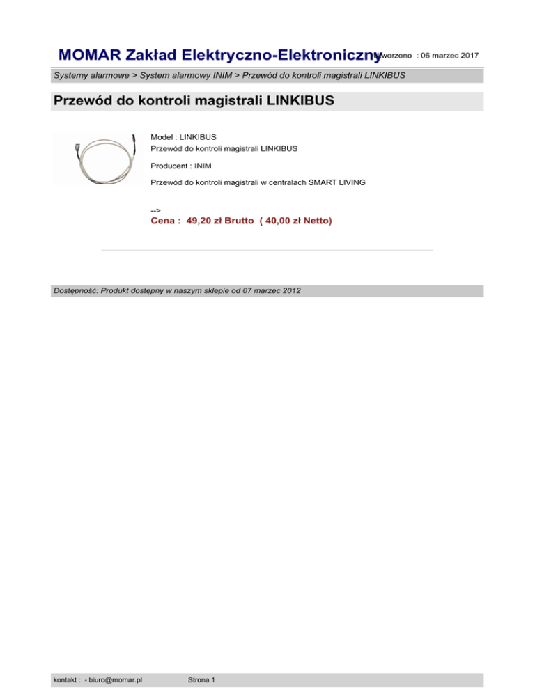 Utworzono : 06 marzec 2017 MOMAR Zakład Elektryczno-Elektroniczny Systemy alarmowe > System alarmowy INIM > Przewód do kontroli magistrali LINKIBUS Przewód do kontroli magistrali LINKIBUS Model : LINKIBUS Przewód do kontroli magistrali LINKIBUS Producent : INIM Przewód do kontroli magistrali w centralach SMART LIVING --> Cena : 49,20 zł Brutto ( 40,00 zł Netto) Dostępność: Produkt dostępny w naszym sklepie od 07 marzec 2012 kontakt : - [email protected] Strona 1