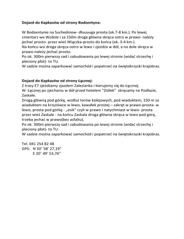 Dojazd do Kapkazów od strony Bodzentyna: W Bodzentynie na Suchedniow- dłuuuuga prosta (ok.7-8 km.). Po lewej cmentarz we Wzdole i za 150m droga główna skręca ostro w prawo- należy jechać prosto- przez wieś Wiączka-prosto do końca (ok. 3-4 km.). Na końcu wsi droga skręca ostro w lewo i zjeżdża w dół, a na dole skręca w prawo-należy jechać prosto. Po ok. 300m pierwszy sad i zabudowania po lewej stronie (widać strzechę i pleciony płot)- to TU. W sadzie można zaparkować samochód i popatrzeć na świętokrzyski krajobraz. Dojazd do Kapkazów od strony Łącznej: Z trasy E7 zjeżdżamy zjazdem Zalezianka i kierujemy się do Łącznej. W Łącznej po zjechaniu w dół przed hotelem "Ziółek" skręcamy na Podłazie, Zaskale. Drogą główną pod górkę, wzdłuż torów kolejowych, pod wiaduktem, 150 m za wiaduktem na krzyżówce w lewo, kawałek prostej – zakręt w prawo-prosta- w lewo, prosta pod górkę - „esik” czyli w prawo i natychmiast w lewo- prosta przez wieś Zaskale - na końcu Zaskala droga główna skręca w lewo pod górę, trzeba jechać w prawo(bez asfaltu). Po ok. 300m pierwszy sad i zabudowania po lewej stronie (widać strzechę i pleciony płot)- to TU. W sadzie można zaparkować samochód i popatrzeć na świętokrzyski krajobraz. Tel. 041 254 82 48 GPS: N 50˚ 58’ 27,19” E 20˚ 49’ 53,76”