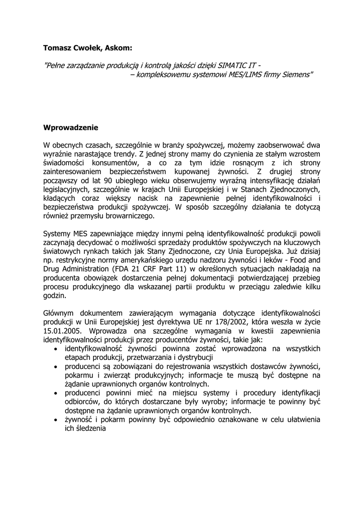 Tomasz Cwołek, Askom: "Pełne zarządzanie produkcją i kontrolą jakości dzięki SIMATIC IT – kompleksowemu systemowi MES/LIMS firmy Siemens" Wprowadzenie W obecnych czasach, szczególnie w branży spożywczej, możemy zaobserwować dwa wyraźnie narastające trendy. Z jednej strony mamy do czynienia ze stałym wzrostem świadomości konsumentów, a co za tym idzie rosnącym z ich strony zainteresowaniem bezpieczeństwem kupowanej żywności. Z drugiej strony począwszy od lat 90 ubiegłego wieku obserwujemy wyraźną intensyfikację działań legislacyjnych, szczególnie w krajach Unii Europejskiej i w Stanach Zjednoczonych, kładących coraz większy nacisk na zapewnienie pełnej identyfikowalności i bezpieczeństwa produkcji spożywczej. W sposób szczególny działania te dotyczą również przemysłu browarniczego. Systemy MES zapewniające między innymi pełną identyfikowalność produkcji powoli zaczynają decydować o możliwości sprzedaży produktów spożywczych na kluczowych światowych rynkach takich jak Stany Zjednoczone, czy Unia Europejska. Już dzisiaj np. restrykcyjne normy amerykańskiego urzędu nadzoru żywności i leków - Food and Drug Administration (FDA 21 CRF Part 11) w określonych sytuacjach nakładają na producenta obowiązek dostarczenia pełnej dokumentacji potwierdzającej przebieg procesu produkcyjnego dla wskazanej partii produktu w przeciągu zaledwie kilku godzin. Głównym dokumentem zawierającym wymagania dotyczące identyfikowalności produkcji w Unii Europejskiej jest dyrektywa UE nr 178/2002, która weszła w życie 15.01.2005. Wprowadza ona szczególne wymagania w kwestii zapewnienia identyfikowalności produkcji przez producentów żywności, takie jak: identyfikowalność żywności powinna zostać wprowadzona na wszystkich etapach produkcji, przetwarzania i dystrybucji producenci są zobowiązani do rejestrowania wszystkich dostawców żywności, pokarmu i zwierząt produkcyjnych; informacje te muszą być dostępne na żądanie uprawnionych organów kontrolnych. producenci powinni mieć na miejscu systemy i procedury identyfikacji odbiorców, do których dostarczane były wyroby; informacje te powinny być dostępne na żądanie uprawnionych organów kontrolnych. żywność i pokarm powinny być odpowiednio oznakowane w celu ułatwienia ich śledzenia W Stanach Zjednoczonych podstawowym dokumentem zawierającym szczegółowe wymagania dotyczące producentów żywności jest „US Bioterrorism Act” czyli Ustawa o przeciwdziałaniu bioterroryzmowi z roku 2002r. Zawiera on regulacje prawne mające na celu zwiększenie zdolności Stanów Zjednoczonych do ochrony, przeciwdziałania i odpowiedzi na atak bioterrorystyczny i inne zagrożenia publicznej ochrony zdrowia, m.in.: nakłada on na producentów obowiązek przechowywania danych pozwalających na identyfikację bezpośredniego źródła (dostawców) i odbiorców żywności oraz opakowań nakazuje zapewnienie pełnej identyfikacji pochodzenia każdego składnika (surowca), który został użyty do wytworzenia każdej partii produktu spożywczego (jeżeli ta informacja jest realnie dostępna) nakazuje przechowywanie danych dotyczących identyfikowalności dla produktów łatwo psujących się przez 1 rok a dla pozostałych produktów spożywczych przez 2 lata dane dotyczące identyfikowalności muszą być dostępne na żądanie FDA w ciągu 4 godzin w godzinach pracy oraz w ciągu 8 godzin w nocy i dni wolne wszystkie zakłady produkcyjne produkujące żywność muszą zostać zarejestrowane w FDA w przypadku podejrzeń FDA posiada uprawnienia do wstrzymania dowolnych partii produktów spożywczych w dowolnym miejscu W chwili obecnej wszystkie informacje i dokumenty np. wymagane przez FDA, w większości zakładów produkcyjnych przygotowuje się ręcznie, w oparciu o dokumenty papierowe, co oznacza, że przygotowanie dokumentacji w wymaganych przez FDA terminach np. w przypadku produkcji piwa jest praktycznie niemożliwe bez wsparcia specjalistycznego systemu informatycznego typu MES. SIMATIC IT - kompleksowy system MES/LIMS firmy Siemens, dla którego ASKOM, jako jedyny w Polsce, posiada status SIMATIC IT Solution Specialist zapewnia pełne zarządzanie produkcją i kontrolą jakości sprawdzone w wielu branżach w tym również w PRZEMYŚLE BROWANICZYM.