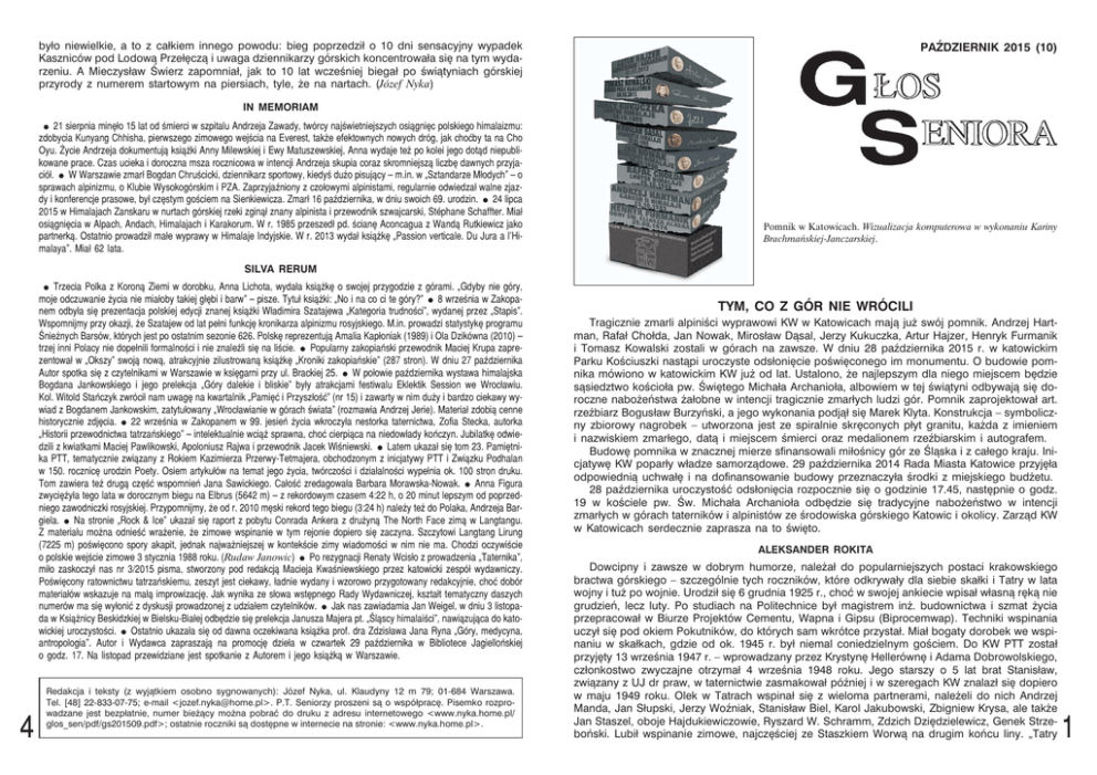 było niewielkie, a to z całkiem innego powodu: bieg poprzedził o 10 dni sensacyjny wypadek Kaszniców pod Lodową Przełęczą i uwaga dziennikarzy górskich koncentrowała się na tym wydarzeniu. A Mieczysław Świerz zapomniał, jak to 10 lat wcześniej biegał po świątyniach górskiej przyrody z numerem startowym na piersiach, tyle, że na nartach. (Józef Nyka) PAŹDZIERNIK 2015 (10) IN MEMORIAM 21 sierpnia minê³o 15 lat od œmierci w szpitalu Andrzeja Zawady, twórcy najœwietniejszych osi¹gniêc polskiego himalaizmu: zdobycia Kunyang Chhisha, pierwszego zimowego wejœcia na Everest, tak¿e efektownych nowych dróg, jak choæby ta na Cho Oyu. ¯ycie Andrzeja dokumentuj¹ ksi¹¿ki Anny Milewskiej i Ewy Matuszewskiej, Anna wydaje te¿ po kolei jego dot¹d niepublikowane prace. Czas ucieka i doroczna msza rocznicowa w intencji Andrzeja skupia coraz skromniejsz¹ liczbê dawnych przyjació³. ● W Warszawie zmar³ Bogdan Chruœcicki, dziennikarz sportowy, kiedyœ du¿o pisuj¹cy – m.in. w „Sztandarze M³odych” – o sprawach alpinizmu, o Klubie Wysokogórskim i PZA. ZaprzyjaŸniony z czo³owymi alpinistami, regularnie odwiedza³ walne zjazdy i konferencje prasowe, by³ czêstym goœciem na Sienkiewicza. Zmar³ 16 paŸdziernika, w dniu swoich 69. urodzin. ● 24 lipca 2015 w Himalajach Zanskaru w nurtach górskiej rzeki zgin¹³ znany alpinista i przewodnik szwajcarski, Stéphane Schaffter. Mia³ osi¹gniêcia w Alpach, Andach, Himalajach i Karakorum. W r. 1985 przeszed³ pd. œcianê Aconcagua z Wand¹ Rutkiewicz jako partnerk¹. Ostatnio prowadzi³ ma³e wyprawy w Himalaje Indyjskie. W r. 2013 wyda³ ksi¹¿kê „Passion verticale. Du Jura a l’Himalaya”. Mia³ 62 lata. ● Pomnik w Katowicach. Wizualizacja komputerowa w wykonaniu Kariny Brachmańskiej-Janczarskiej. SILVA RERUM Trzecia Polka z Koron¹ Ziemi w dorobku, Anna Lichota, wyda³a ksi¹¿kê o swojej przygodzie z górami. „Gdyby nie góry, moje odczuwanie ¿ycia nie mia³oby takiej g³êbi i barw” – pisze. Tytu³ ksi¹¿ki: „No i na co ci te góry?” ● 8 wrzeœnia w Zakopanem odby³a siê prezentacja polskiej edycji znanej ksi¹¿ki W³adimira Szatajewa „Kategoria trudnoœci”, wydanej przez „Stapis”. Wspomnijmy przy okazji, ¿e Szatajew od lat pe³ni funkcjê kronikarza alpinizmu rosyjskiego. M.in. prowadzi statystykê programu Œnie¿nych Barsów, których jest po ostatnim sezonie 626. Polskê reprezentuj¹ Amalia Kap³oniak (1989) i Ola Dzikówna (2010) – trzej inni Polacy nie dope³nili formalnoœci i nie znaleŸli siê na liœcie. ● Popularny zakopiañski przewodnik Maciej Krupa zaprezentowa³ w „Okszy” swoj¹ now¹, atrakcyjnie zilustrowan¹ ksi¹¿kê „Kroniki zakopiañskie” (287 stron). W dniu 27 paŸdziernika Autor spotka siê z czytelnikami w Warszawie w ksiêgarni przy ul. Brackiej 25. ● W po³owie paŸdziernika wystawa himalajska Bogdana Jankowskiego i jego prelekcja „Góry dalekie i bliskie” by³y atrakcjami festiwalu Eklektik Session we Wroc³awiu. Kol. Witold Stañczyk zwróci³ nam uwagê na kwartalnik „Pamiêæ i Przysz³oœæ” (nr 15) i zawarty w nim du¿y i bardzo ciekawy wywiad z Bogdanem Jankowskim, zatytu³owany „Wroc³awianie w górach œwiata” (rozmawia Andrzej Jerie). Materia³ zdobi¹ cenne historycznie zdjêcia. ● 22 wrzeœnia w Zakopanem w 99. jesieñ ¿ycia wkroczy³a nestorka taternictwa, Zofia Stecka, autorka „Historii przewodnictwa tatrzañskiego” – intelektualnie wci¹¿ sprawna, choæ cierpi¹ca na niedow³ady koñczyn. Jubilatkê odwiedzili z kwiatkami Maciej Pawlikowski, Apoloniusz Rajwa i przewodnik Jacek Wiœniewski. ● Latem ukaza³ siê tom 23. Pamiêtnika PTT, tematycznie zwi¹zany z Rokiem Kazimierza Przerwy-Tetmajera, obchodzonym z inicjatywy PTT i Zwi¹zku Podhalan w 150. rocznicê urodzin Poety. Osiem artyku³ów na temat jego ¿ycia, twórczoœci i dzia³alnoœci wype³nia ok. 100 stron druku. Tom zawiera te¿ drug¹ czêœæ wspomnieñ Jana Sawickiego. Ca³oœæ zredagowa³a Barbara Morawska-Nowak. ● Anna Figura zwyciê¿y³a tego lata w dorocznym biegu na Elbrus (5642 m) – z rekordowym czasem 4:22 h, o 20 minut lepszym od poprzedniego zawodniczki rosyjskiej. Przypomnijmy, ¿e od r. 2010 mêski rekord tego biegu (3:24 h) nale¿y te¿ do Polaka, Andrzeja Bargiela. ● Na stronie „Rock & Ice” ukaza³ siê raport z pobytu Conrada Ankera z dru¿yn¹ The North Face zim¹ w Langtangu. Z materia³u mo¿na odnieœæ wra¿enie, ¿e zimowe wspinanie w tym rejonie dopiero siê zaczyna. Szczytowi Langtang Lirung (7225 m) poœwiêcono spory akapit, jednak najwa¿niejszej w kontekœcie zimy wiadomoœci w nim nie ma. Chodzi oczywiœcie o polskie wejœcie zimowe 3 stycznia 1988 roku. (Rudaw Janowic) ● Po rezygnacji Renaty Wcis³o z prowadzenia „Taternika”, mi³o zaskoczy³ nas nr 3/2015 pisma, stworzony pod redakcj¹ Macieja Kwaœniewskiego przez katowicki zespó³ wydawniczy. Poœwiêcony ratownictwu tatrzañskiemu, zeszyt jest ciekawy, ³adnie wydany i wzorowo przygotowany redakcyjnie, choæ dobór materia³ów wskazuje na ma³¹ improwizacjê. Jak wynika ze s³owa wstêpnego Rady Wydawniczej, kszta³t tematyczny daszych numerów ma siê wy³oniæ z dyskusji prowadzonej z udzia³em czytelników. ● Jak nas zawiadamia Jan Weigel, w dniu 3 listopada w Ksi¹¿nicy Beskidzkiej w Bielsku-Bia³ej odbêdzie siê prelekcja Janusza Majera pt. „Œl¹scy himalaiœci”, nawi¹zuj¹ca do katowickiej uroczystoœci. ● Ostatnio ukaza³a siê od dawna oczekiwana ksi¹¿ka prof. dra Zdzis³awa Jana Ryna „Góry, medycyna, antropologia”. Autor i Wydawca zapraszaj¹ na promocjê dzie³a w czwartek 29 paŸdziernika w Bibliotece Jagielloñskiej o godz. 17. Na listopad przewidziane jest spotkanie z Autorem i jego ksi¹¿k¹ w Warszawie. ● 4 Redakcja i teksty (z wyjątkiem osobno sygnowanych): Józef Nyka, ul. Klaudyny 12 m 79; 01-684 Warszawa. Tel. [48] 22-833-07-75; e-mail <[email protected]>. P.T. Seniorzy proszeni są