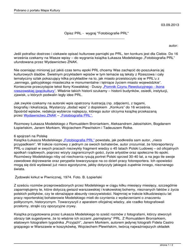 Pobrano z portalu Mapa Kultury 03.09.2013 Opisz PRL - wygraj "Fotobiografie PRL" ____________________________ autor: Jeśli potrafisz dostrzec i ciekawie opisać kulturowe pamiątki po PRL, ten konkurs jest dla Ciebie. Do 16 września czekamy na Wasze wpisy – do wygrania książka Łukasza Modelskiego „Fotobiografia PRL” ufundowana przez Wydawnictwo ZNAK. Nie oceniając minionej już jakiś czas temu epoki PRL chcemy Was zachęcić do poszukania jej kulturowych śladów. Świetnym przykładem wpisów w tym temacie są teksty z Rzeszowa i cały tematyczny szlak pokazujący kilka przykładów na to, jak miasto przeistoczyło się w PRL’u z „sennego, galicyjskiego miasteczka w monumentalne i tętniące życiem miasto wojewódzkie”. Koniecznie przeczytajcie tekst Ilony Kowalskiej - Duszy „Pomnik Czynu Rewolucyjnego - ikona rzeszowskiej (pop)kultury”. Właśnie takich historii szukamy – historii budynków, osiedli, instytucji, zjawisk, u których podwalin legły idee PRL. Jak zwykle czekamy na autorski wpis opatrzony ilustracją (np. zdjęciem), z tagami, biografią i lokalizacją. Wystarczy „dodać wpis” z dopiskiem „Konkurs” do 16 września. Spośród wpisów, redakcja wybierze najlepszy, którego autor otrzyma książkę przekazaną przez Wydawnictwo ZNAK – „Fotobiografia PRL”. Rozmowy Łukasza Modelskiego z Romualdem Broniarkiem, Aleksandrem Jałosińskim, Bogdanem Łopieńskim, Janem Morkiem, Wojciechem Plewińskim i Tadeuszem Rolke. 6 spojrzeń na Polskę Książka Łukasza Modelskiego „Fotobiografia PRL” powstała, jak podkreśla sam autor, „nieco przypadkiem”. W trakcie rozmowy z jednym ze swoich bohaterów, autor zrozumiał, że fotoreporterzy PRL-u zapisali w swych pracach niezwykły fragment wiedzy o 45 latach Polski Ludowej – od oficjalnych spotkań rządowych, poprzez wizyty zagranicznych gości, życie artystów oraz społeczne tło epoki. Rozmówcy Modelskiego niby od niechcenia rysują portret Polski sprzed 30-40 lat, a na jego tle swoje zawodowe dojrzewanie oraz perypetie towarzyszące na co dzień pracy fotoreportera. Ich opowieści mogą się dziś wydawać już nieco egzotyczne, jakby dotyczyły jakiegoś zupełnie innego, nieznanego świata. Żydowski kirkut w Piwnicznej, 1974. Foto. B. Łopieński Z sześciu rozmów przeprowadzonych przez Modelskiego w ciągu kilku miesięcy miesięcy, szczególnie zapamiętujemy te, które dotyczą gwiazd warszawskiej i krakowskiej bohemy, nieznanych faktów z życia polskich polityków, czy te obnażające absurdy rzeczywistości. Najmniej w trakcie kilkudziesięciu lat pracy reporterskiej bohaterowie Modelskiego mieli do czynienia z wydarzeniami o znaczeniu politycznym, historycznym. Towarzyszyli z aparatem oficjalnej władzy, ale rzadko fotografowali przełomy, strajki czy opozycyjne zrywy. Książka przygotowana przez Łukasza Modelskiego to sześć rozmów z fotografami, którzy stworzyli obrazy tak sugestywne, że to właśnie ich oczami „pamiętamy” PRL. Z Romualdem Broniarkiem, etatowym fotografem tygodnika „Przyjaźń”, Janem Morkiem, autorem jedynej fotografii Fidela Castro grającego w Warszawie w koszykówkę, Wojciechem Plewińskim, twórcą najważniejszych okładek strona 1 / 2 Pobrano z portalu Mapa Kultury krakowskiego „Przekroju”, Aleksandrem Jałosińskim, związanym m.in. ze „Sztandarem Młodych”, „Kulturą”, „Perspektywami”, Bogdanem Łopieńskim – autorem słynnej fotografii Edwarda Gierka i Piotra Jaroszewicza „Przyspieszamy obywatele” i Tadeuszem Rolke, jedynym, któremu udała się tzw. kariera zagraniczna. Na trzystu stronach, na sześć głosów opowiadana jest oficjalna i nieoficjalna historia trzech pokoleń Polaków. Tekst jest ilustrowany jest najbardziej znanymi i charakterystycznymi fotografiami autorstwa bohaterów książki. Łukasz Modelski (1970) studiował w Warszawie, Paryżu i Poitiers. Z wykształcenia historyk sztuki i cywilizacji średniowiecza, z zawodu redaktor i reporter. Zastępca redaktora naczelnego magazynu „Twój Styl”. Autor bestsellerowych "Dziewczyn wojennych". strona 2 / 2