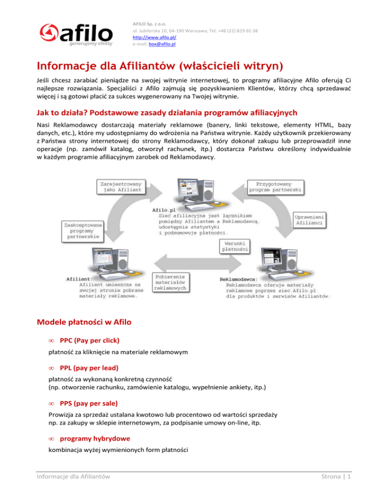 AFILO Sp. z o.o. ul. Jubilerska 10, 04-190 Warszawa, Tel. +48 (22) 829 65 38 http://www.afilo.pl/ e-mail: [email protected] Informacje dla Afiliantów (właścicieli witryn) Jeśli chcesz zarabiać pieniądze na swojej witrynie internetowej, to programy afiliacyjne Afilo oferują Ci najlepsze rozwiązania. Specjaliści z Afilo zajmują się pozyskiwaniem Klientów, którzy chcą sprzedawać więcej i są gotowi płacić za sukces wygenerowany na Twojej witrynie. Jak to działa? Podstawowe zasady działania programów afiliacyjnych Nasi Reklamodawcy dostarczają materiały reklamowe (banery, linki tekstowe, elementy HTML, bazy danych, etc.), które my udostępniamy do wdrożenia na Państwa witrynie. Każdy użytkownik przekierowany z Państwa strony internetowej do strony Reklamodawcy, który dokonał zakupu lub przeprowadził inne operacje (np. zamówił katalog, otworzył rachunek, itp.) dostarcza Państwu określony indywidualnie w każdym programie afiliacyjnym zarobek od Reklamodawcy. Modele płatności w Afilo • PPC (Pay per click) płatność za kliknięcie na materiale reklamowym • PPL (pay per lead) płatność za wykonaną konkretną czynność (np. otworzenie rachunku, zamówienie katalogu, wypełnienie ankiety, itp.) • PPS (pay per sale) Prowizja za sprzedaż ustalana kwotowo lub procentowo od wartości sprzedaży np. za zakupy w sklepie internetowym, za podpisanie umowy on-line, itp. • programy hybrydowe kombinacja wyżej wymienionych form płatności Informacje dla Afiliantów Strona | 1 AFILO Sp. z o.o. ul. Jubilerska 10, 04-190 Warszawa, Tel. +48 (22) 829 65 38 http://www.afilo.pl/ e-mail: [email protected] Natychmiastowe korzyści dla Afilianta Twoja witryna zarabia dla Ciebie pieniądze Wysokie zarobki bez ukrytych kosztów • • • • • - zamień ruch internetowy na pieniądze - programy afiliacyjne od znanych Reklamodawców - rożne modele płatności, takie jak, pay per click, pay per lead czy pay per sale - wskaźnik klikalności uzależniony od dynamiki i produktów – bazujący na materiałach reklamowych - uczestnictwo jest wolne od opłat Łatwe i przyjazne zarządzanie • • • • • - zarządzanie różnymi programami Reklamodawców w jednym koncie - sumowanie osiąganych dochodów w programach Afiliacyjnych, w których jesteśmy - obszerne raporty - wypłacanie prowizji już od 150 PLN miesięcznie - zabezpieczenie konta hasłem i jego prosta obsługa Podnieś jakość swojej witryny - popraw wygląd swojej witryny poprzez wdrożenie nowych formatów reklam - możliwość integracji materiałów reklamowych z własnym sklepem internetowym Uzyskanie statusu Afilianta oraz wynikające z tego korzyści • wysoka jakość sieć afiliacyjna gwarantuje Afiliantom wysoką jakość naszych usług oraz efektywną i przyjazną platformę technologiczną • doradztwo marketingowe nasza sieć afiliacyjna Afilo.pl ma w swoim zespole profesjonalistów, z ponad 10 letnim doświadczeniem, którzy pomagają dobrać i zainstalować programy afiliacyjne • bogata oferta oferujemy Państwu duży wybór programów afiliacyjnych Wymagania • • • musisz posiadać i mieć prawo do zarządzania swoją witryną internetową musisz potrafić integrować / wkładać reklamy udostępniane przez nasz system na swoją witrynę internetową, tak aby poprawnie działały i rozliczały wynagrodzenie dla Ciebie musisz się zarejestrować jako Afiliant, aby skorzystać z możliwości zarabiania pieniędzy Informacje dla Afiliantów Strona | 2 AFILO Sp. z o.o. ul. Jubilerska 10, 04-190 Warszawa, Tel. +48 (22) 829 65 38 http://www.afilo.pl/ e-mail: [email protected] Przegląd usług Afilo dla Afiliantów W ramach członkostwa w sieci afiliacyjnej AfiloNET oferujemy Właścicielom Witryn (Afiliantom) szereg dodatkowych narzędzi i usług: • Afilo MANAGER – udostępnia wszystkie, proste w użyciu, funkcjonalności, m.in. zarządzanie materiałami reklamowymi, monitorowanie, zarządzanie płatnościami, zarządzanie programem afiliacyjnym, itd. • Afilo SOLUTION– udostępnienie profesjonalnego oprogramowania do zarządzania programami afiliacyjnymi w sposób bardziej efektywny – służący do wdrożenia dynamicznych form reklamowych (tzw. feedów, sklepów, itp.). • Afilo SERVICE – serwis zorientowany na Klientów zawierający wszystkie funkcjonalności do prostego i efektywnego zarządzania programami afiliacyjnymi. Afilo MANAGER Sieć afiliacyjna to miejsce gdzie spotyka się duża liczba Reklamodawców z reklamą ich produktów i witryn internetowych oraz prywatni Afilianci i firmy z ich witrynami, którzy udostępniają miejsce na reklamę. Dla obu stron – Reklamodawcy i Afilianta – sieć afiliacyjna udostępnia dużą gamę skutecznych rozwiązań. Po rejestracji, program afiliacyjny poprowadzi użytkownika do jego konta poprzez kontakty, programy afiliacyjne, wdrożenie materiałów reklamowych oraz zarządzanie raportami. W Afilo robimy o wiele więcej. Sieć afiliacyjna daje Państwu kompletny raport wyników, w tym zarządzanie reklamodawcami, płatnościami. Państwo zajmują się treścią Państwa witryny, a nasza sieć resztą. Nasi Reklamodawcy mają dostęp do narzędzi administracyjnych służących zarządzaniu programami afiliacyjnymi. Te dogodne aplikacje czynią administrowanie i dystrybucję materiałów reklamowych oraz wykonywane operacje w programie afiliacyjnym, prostszymi i czytelniejszymi. Czynimy je tak wygodnymi jak to tylko możliwe. Otrzymujecie Państwo dostęp do statystyk on-line, status Państwa aplikacji oraz ilości generowanych klików, leadów i sprzedaży. Afilo SOLUTION AfiloDataBase Baza danych sieci afiliacyjnej jest wypełniana przez Reklamodawców ich produktami. Z tej bazy nasi Afilianci pobierają dynamicznie różnego rodzaju formy reklamy i integrują je na swoich witrynach. Selekcja produktów oferuje osobom nie będących programistami, proste narzędzia do stworzenia własnych form reklam. Zalety? Wysoki